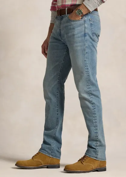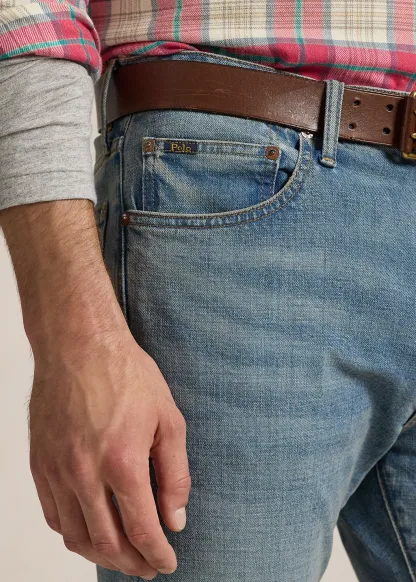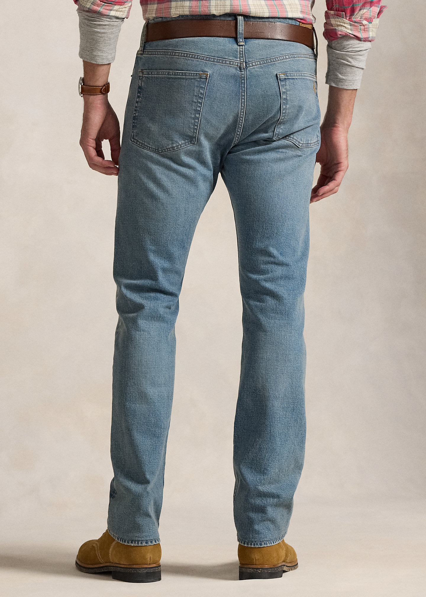 - Five-pocket styling with signature metal rivets. “Polo” label at the coin pocket. “Polo Ralph Lauren” patch at the back right waist.