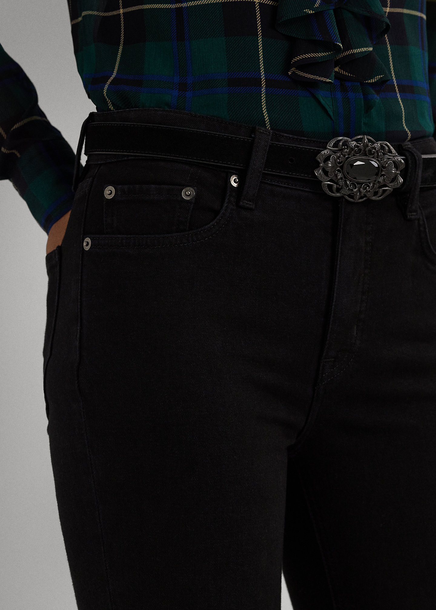 - Belt loops. Zip fly with a signature buttoned closure.