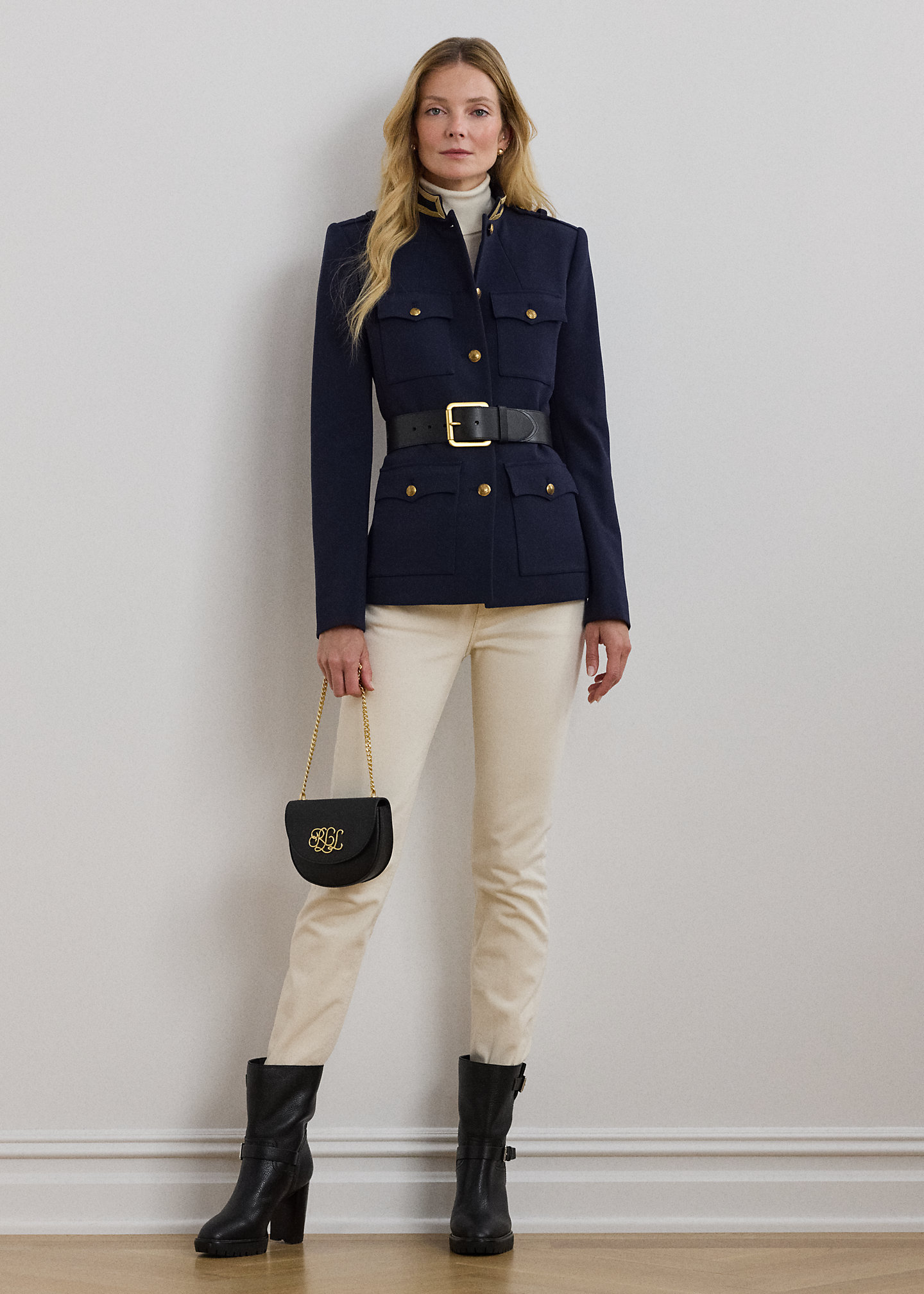 - Five-pocket styling with signature metal rivets. Debossed signature leather patch at the back right waist.