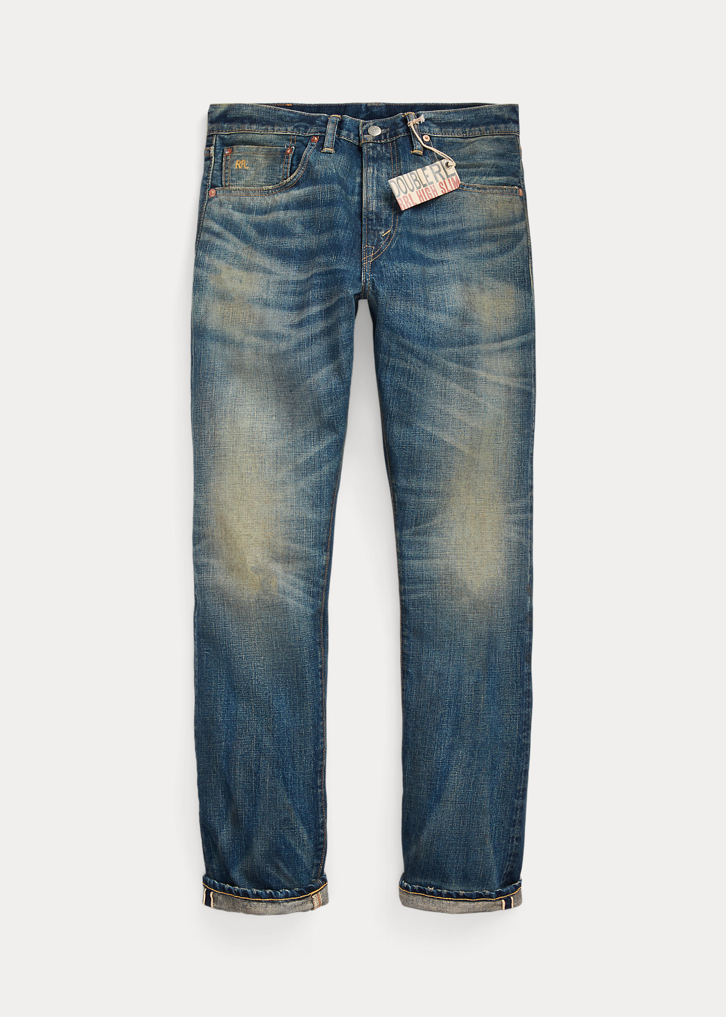 - American-made buttons, rivets, and washer burrs. Five-pocket styling. “RRL” embroidery at the coin pocket.