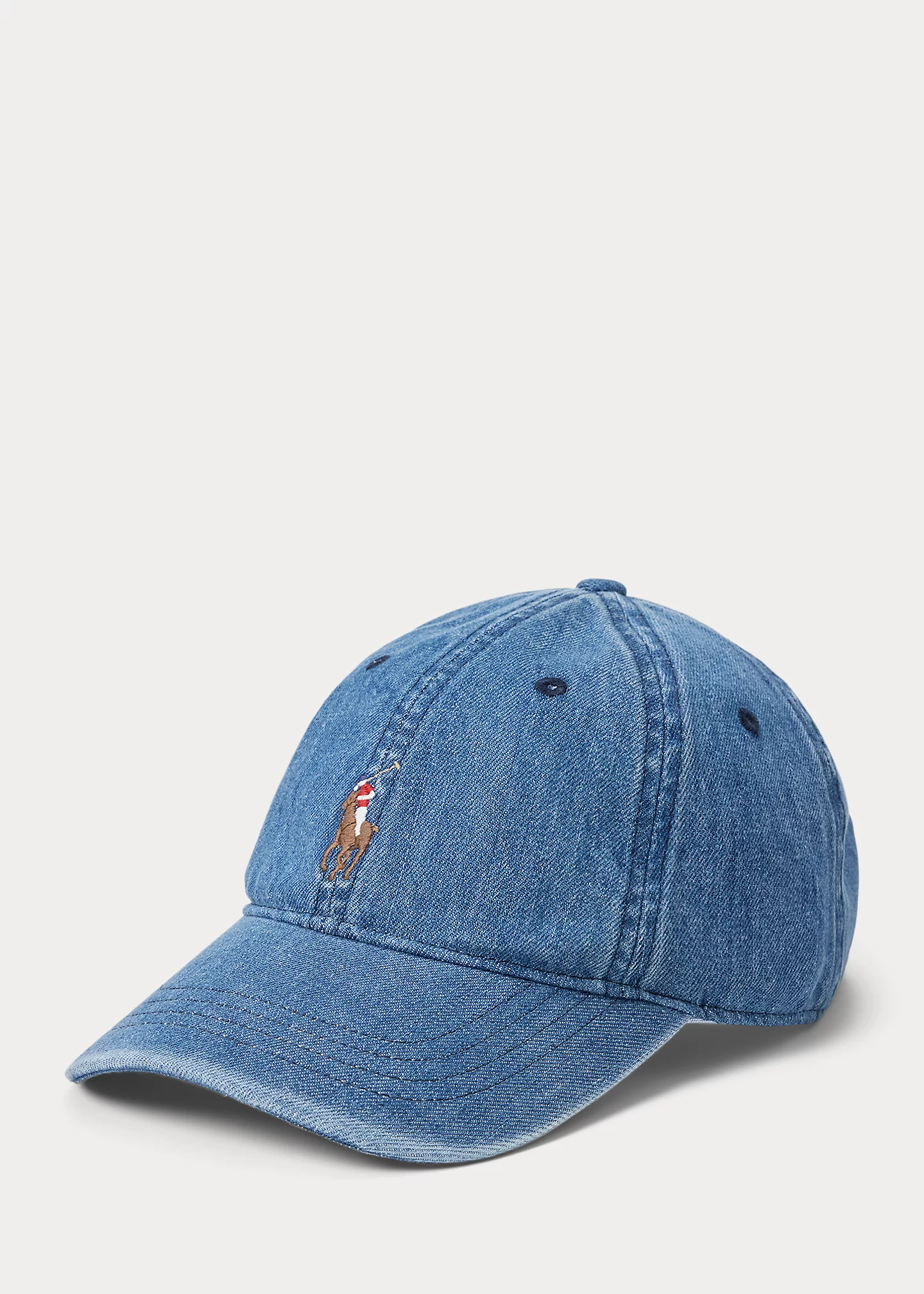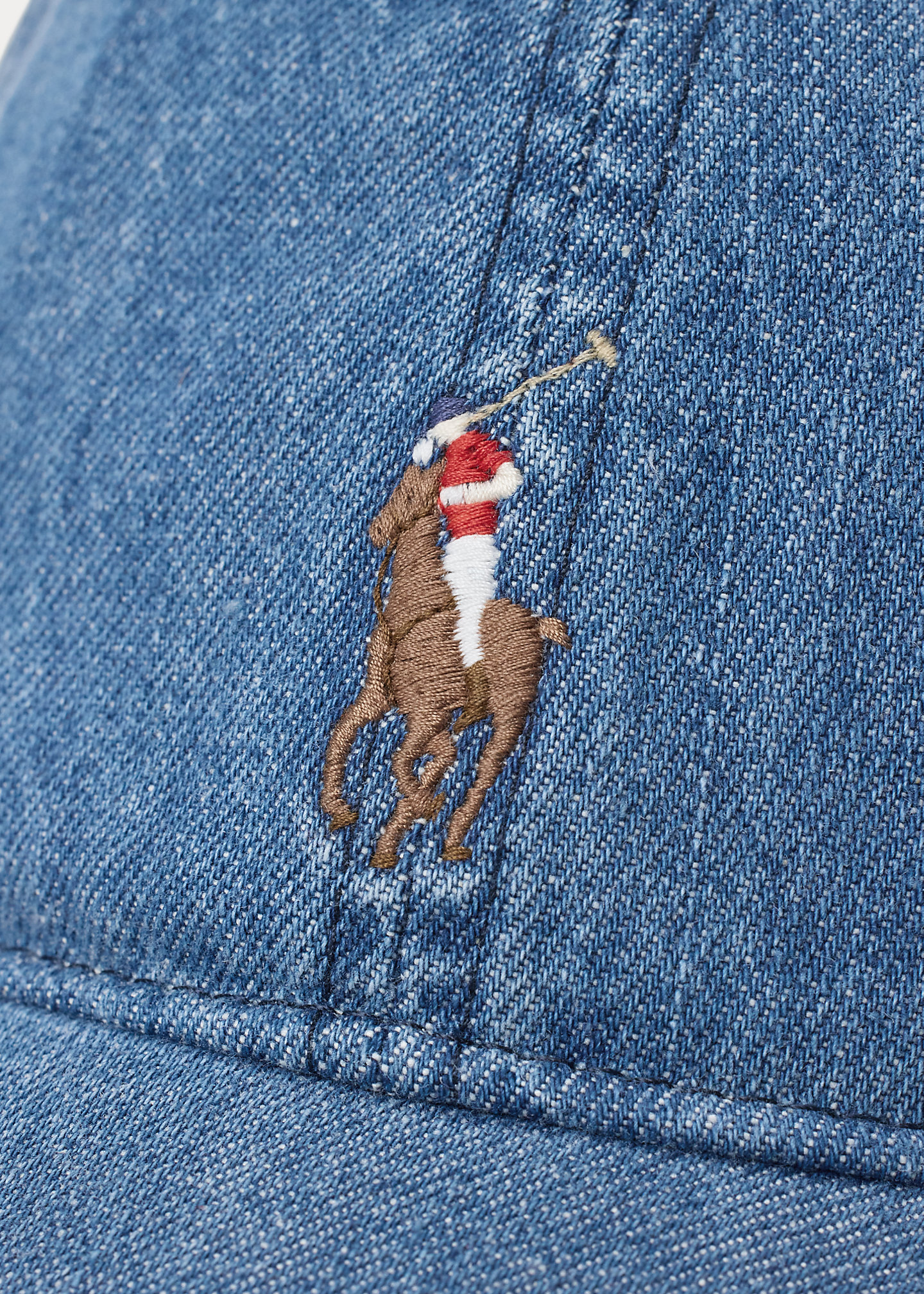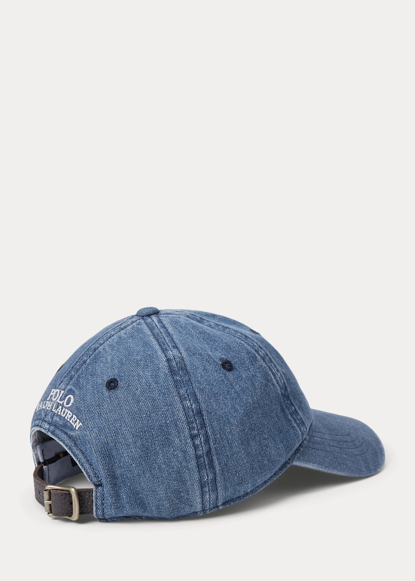 - “Polo Ralph Lauren” embroidery and a buckled leather strap at the back.