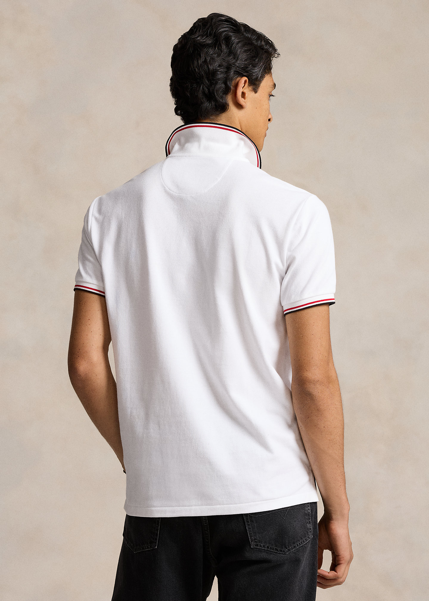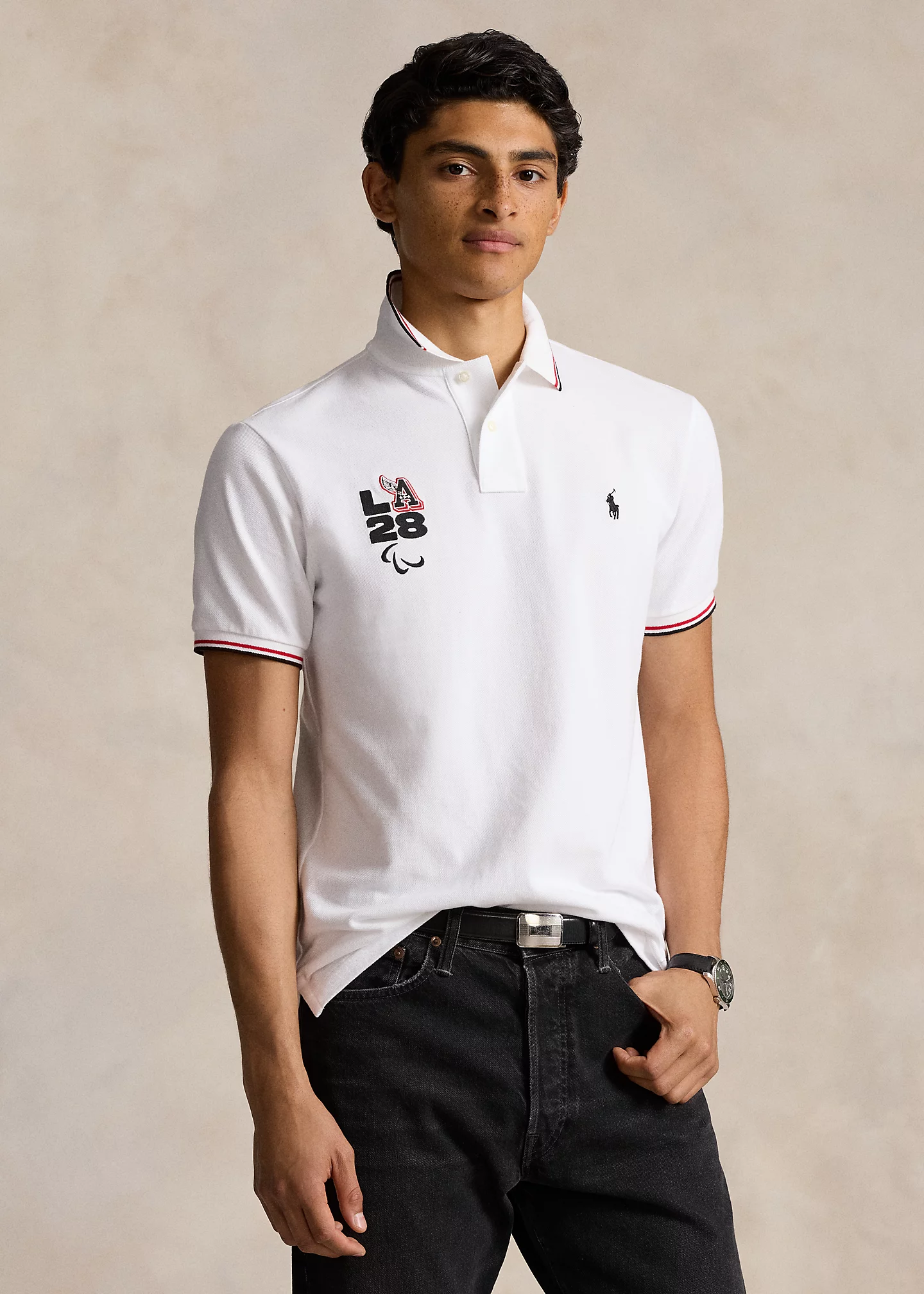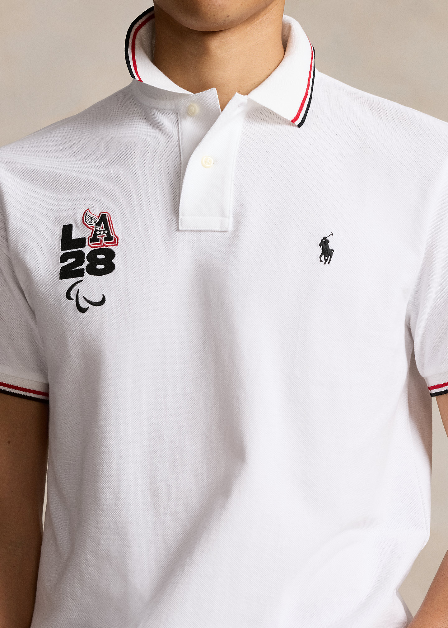 - Ribbed Polo collar with striped tipping. Two-button placket. Short sleeves with ribbed armbands. Official Games logo that includes “LA 28” with Paralympic Agitos embroidery at the right chest. Tennis tail.