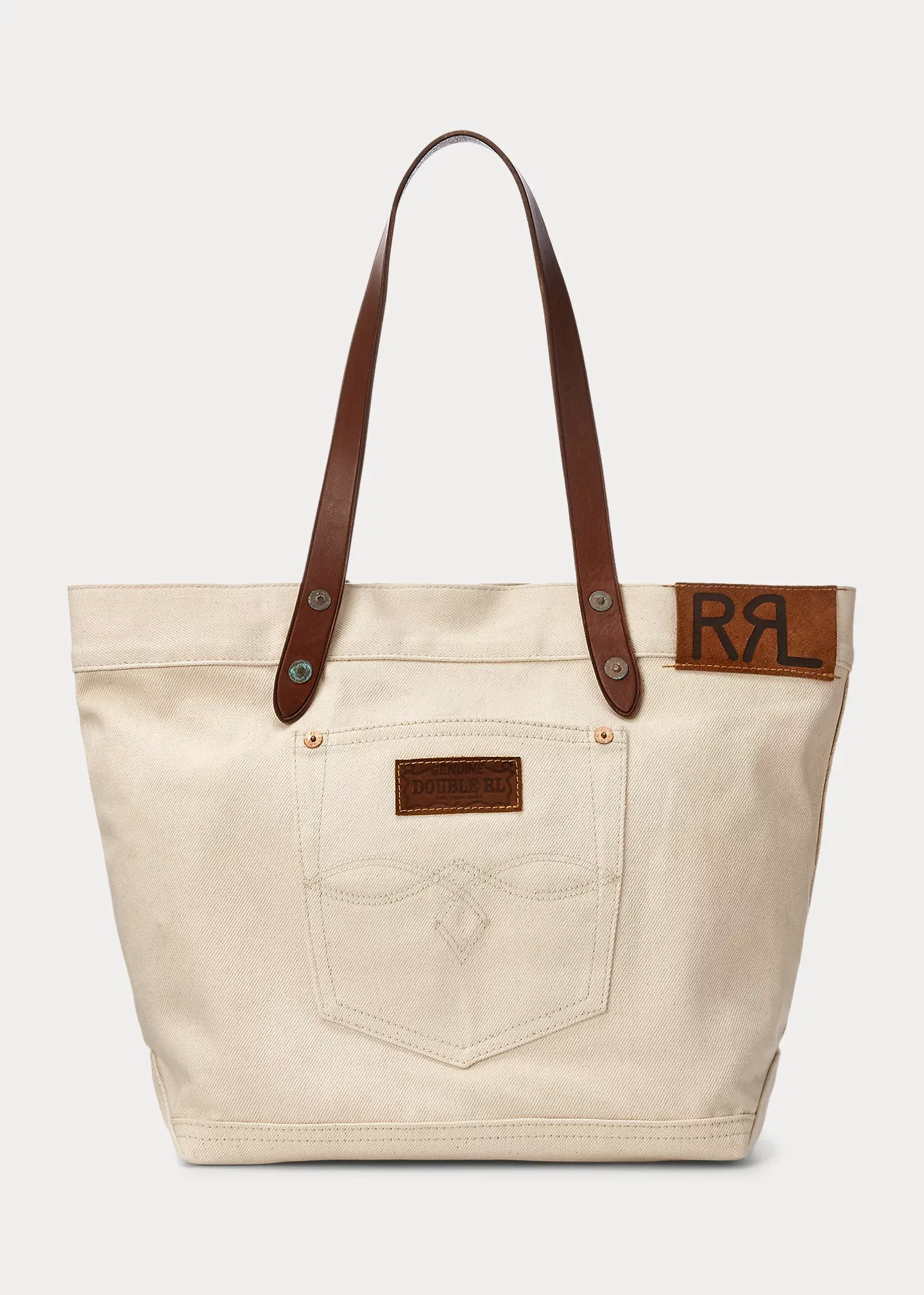 - Roughout suede “RRL”-debossed patch at the top front. Leather "Genuine Double RL" patch at the front pocket.