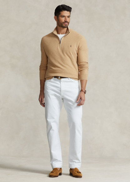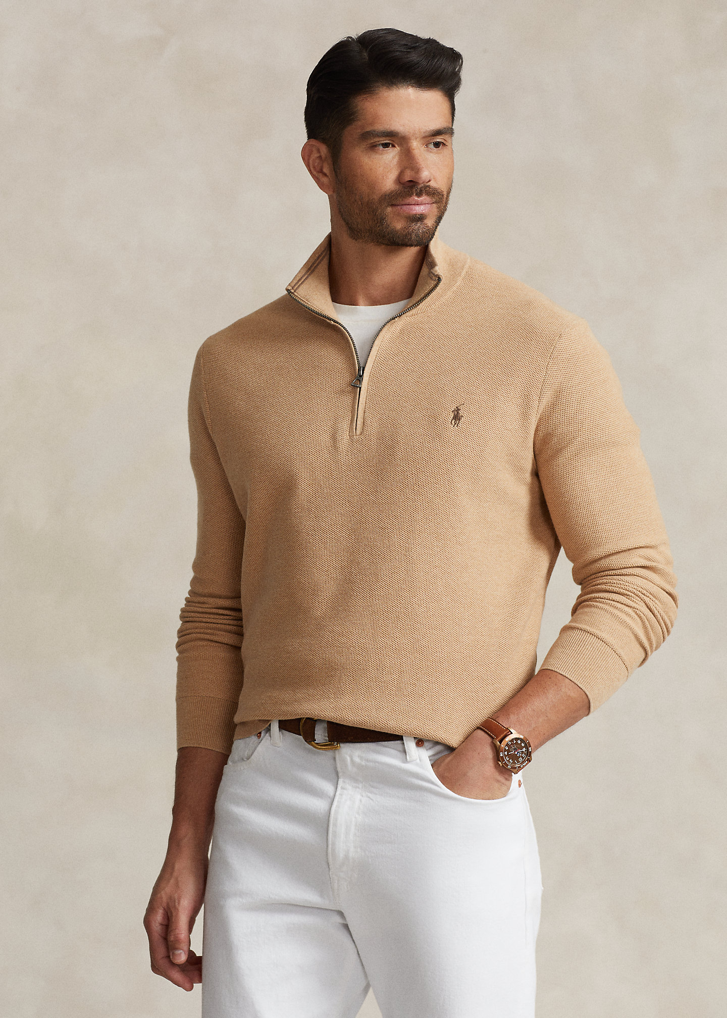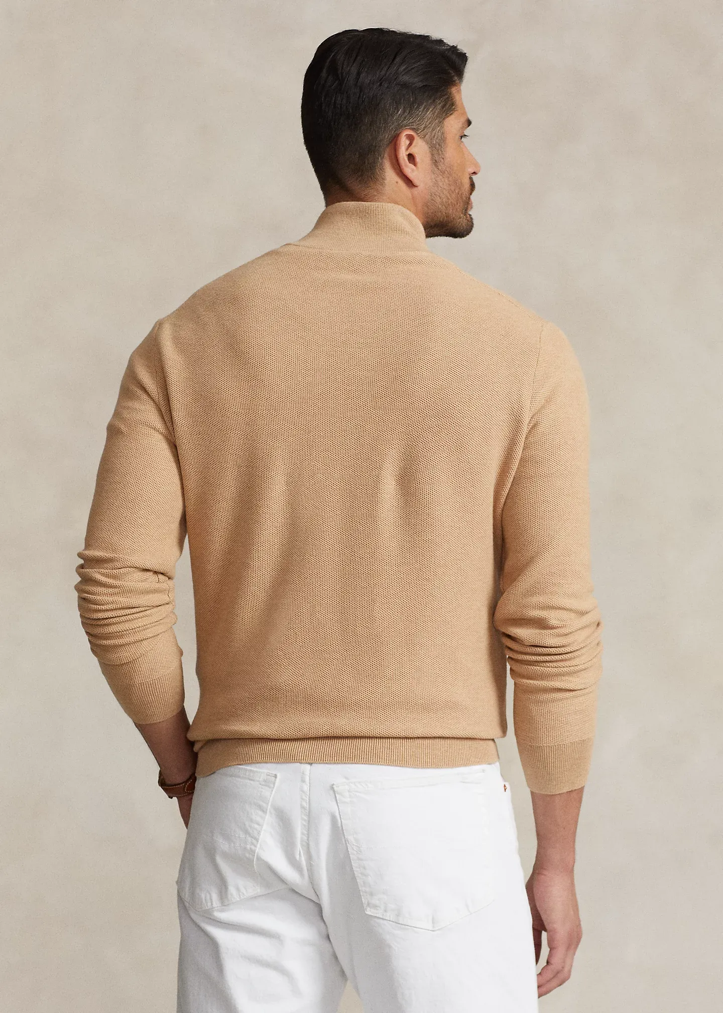 - Rib-knit mockneck. Quarter-zip placket.