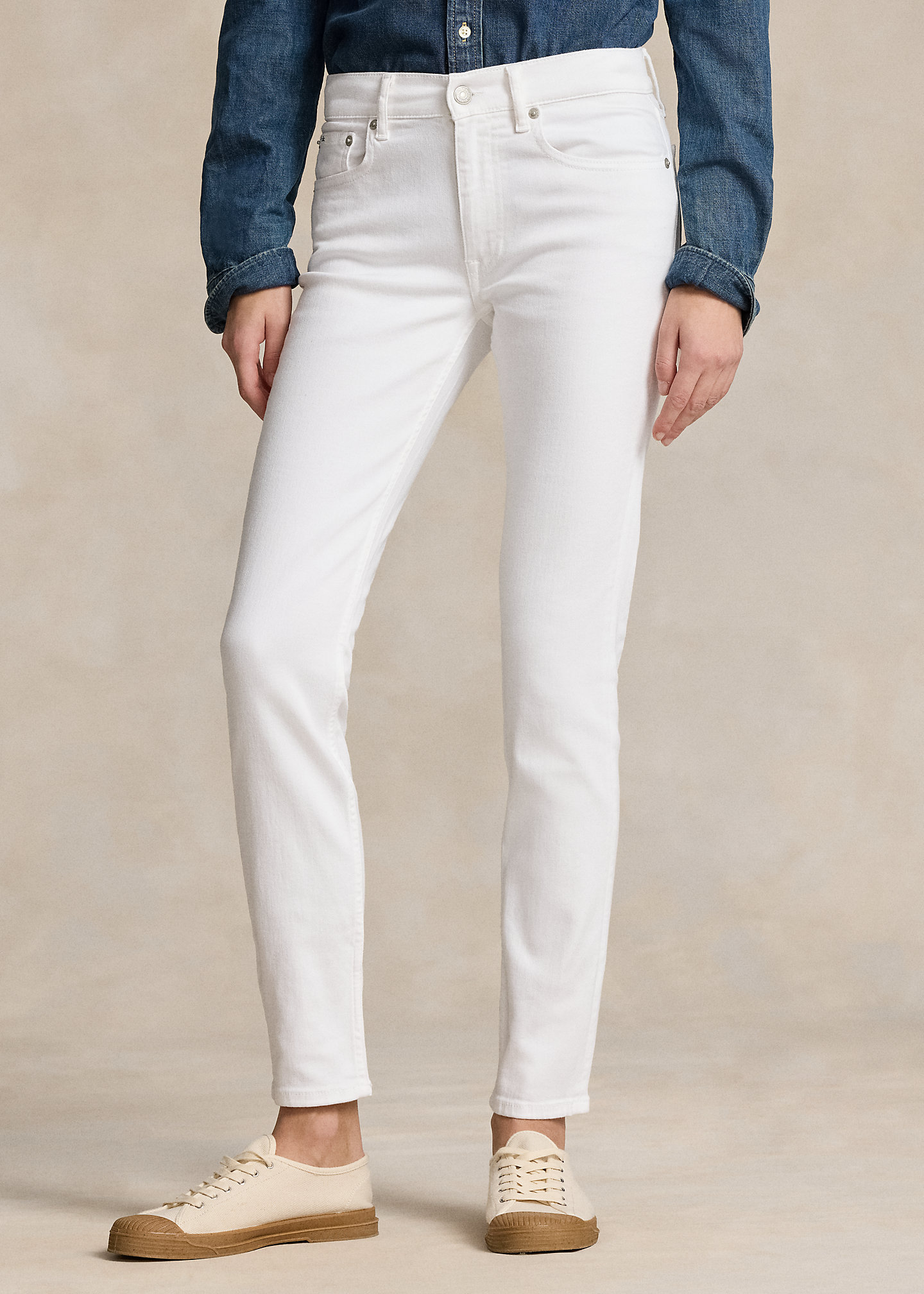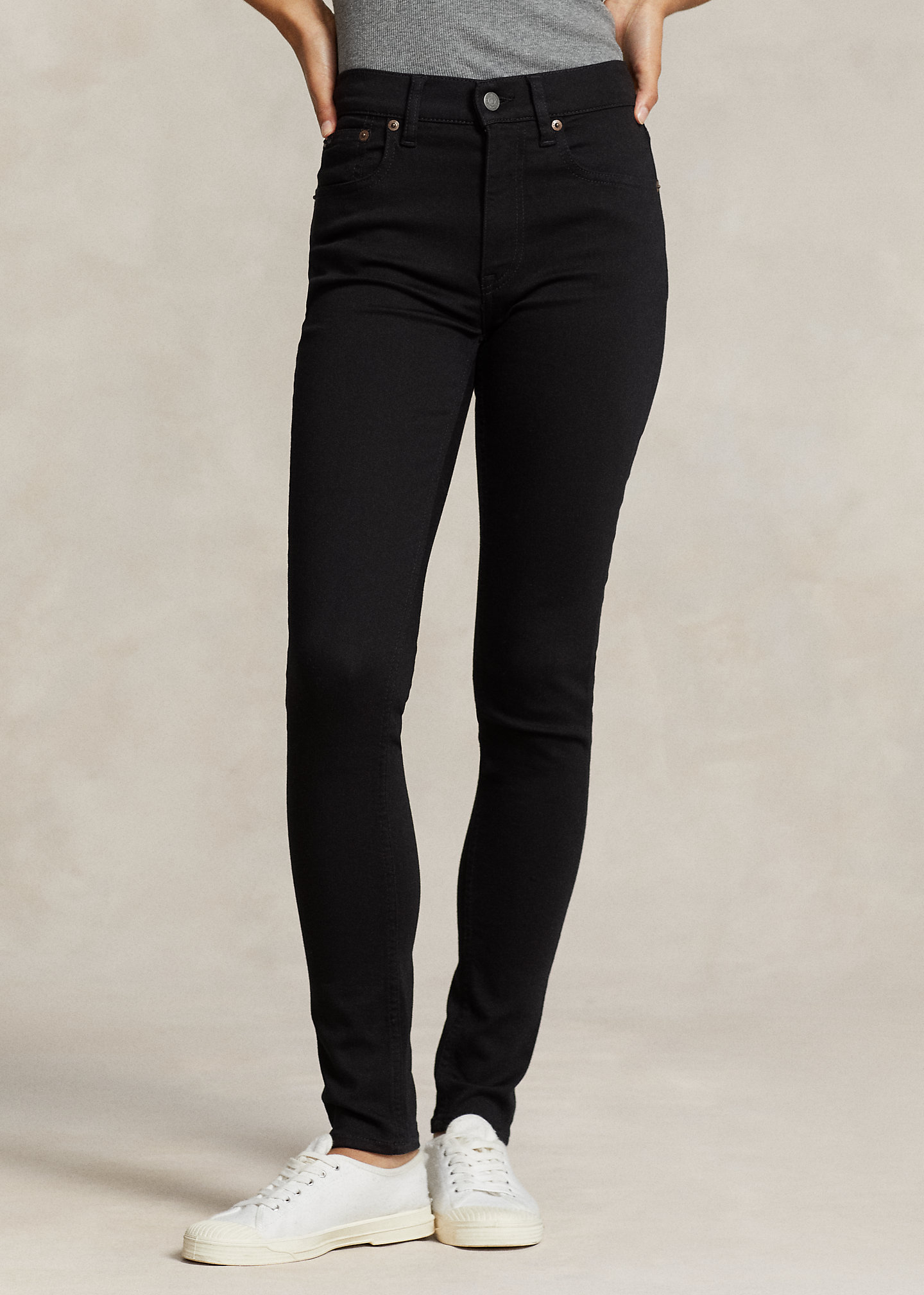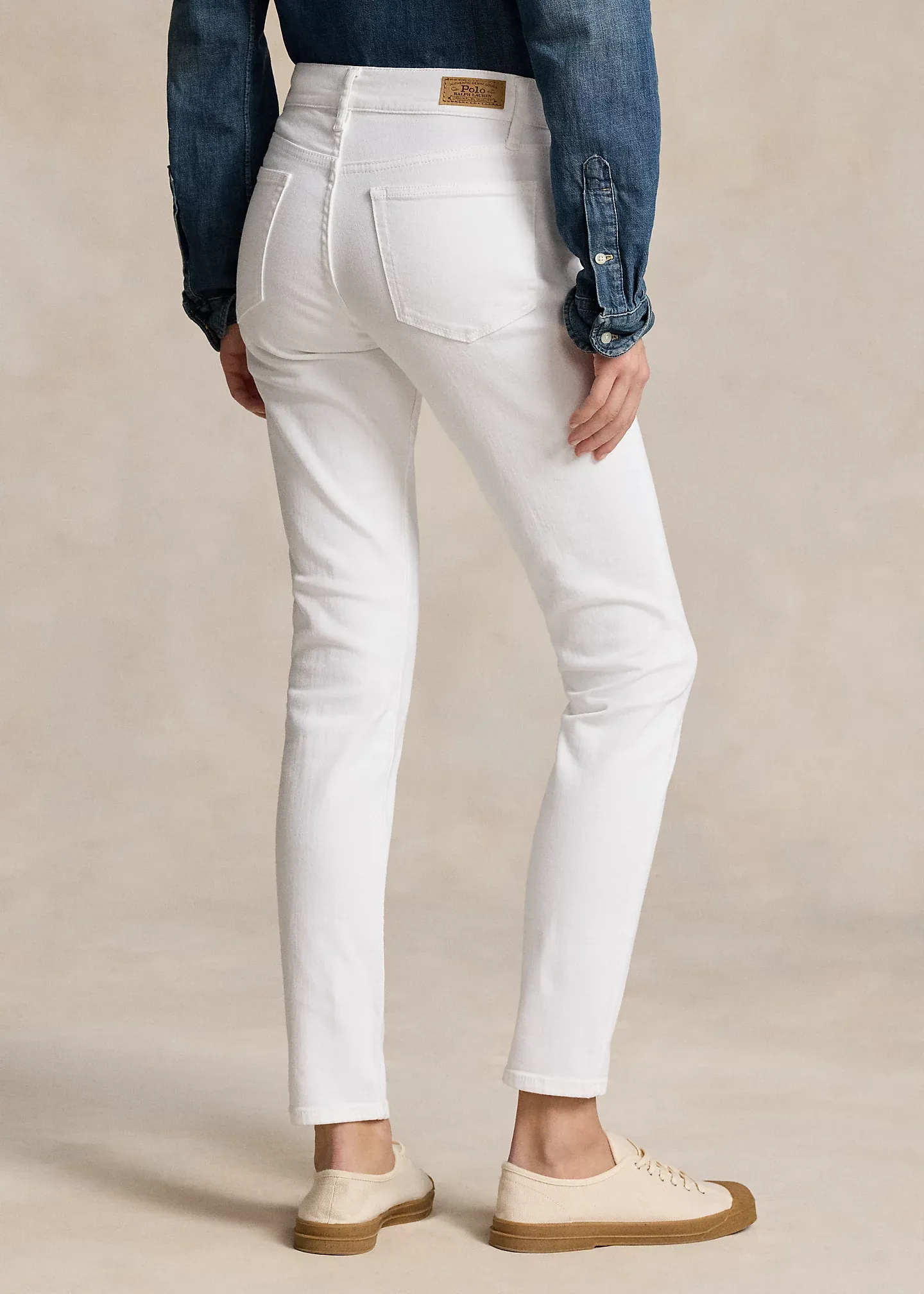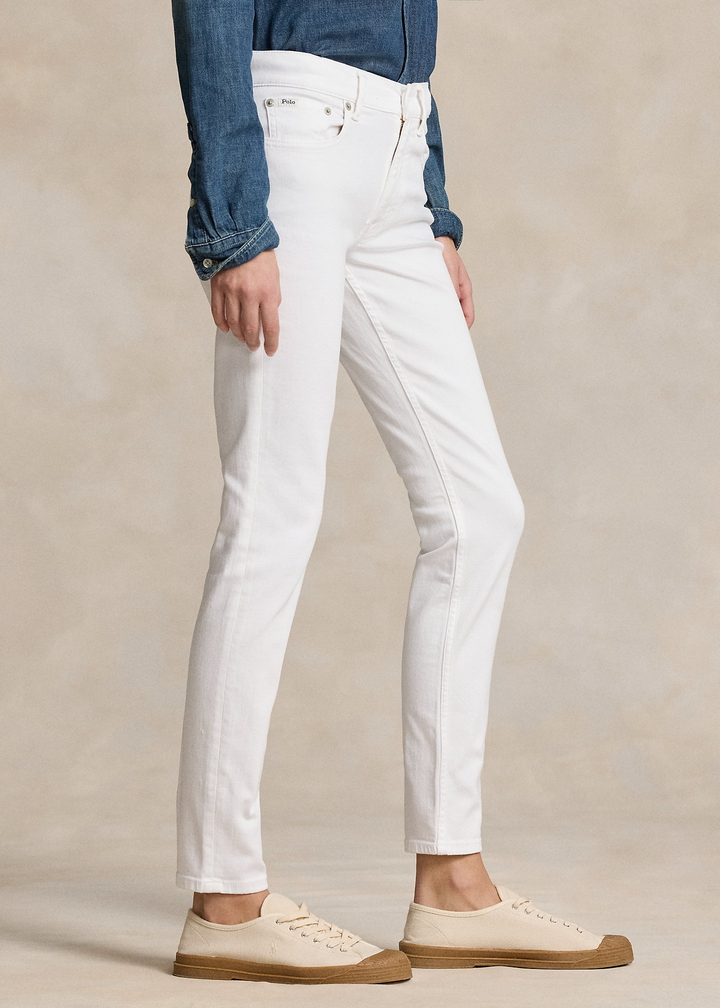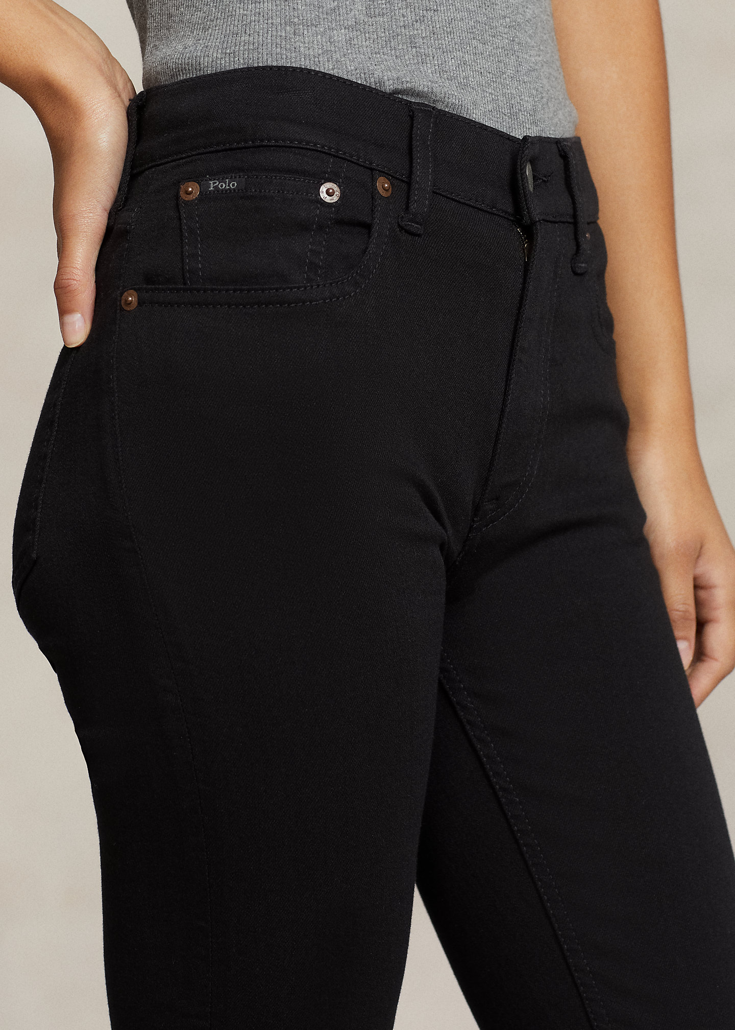 - Five-pocket styling with signature “P.R.L. 67”-engraved metal rivets. “Polo” patch at the coin pocket.
