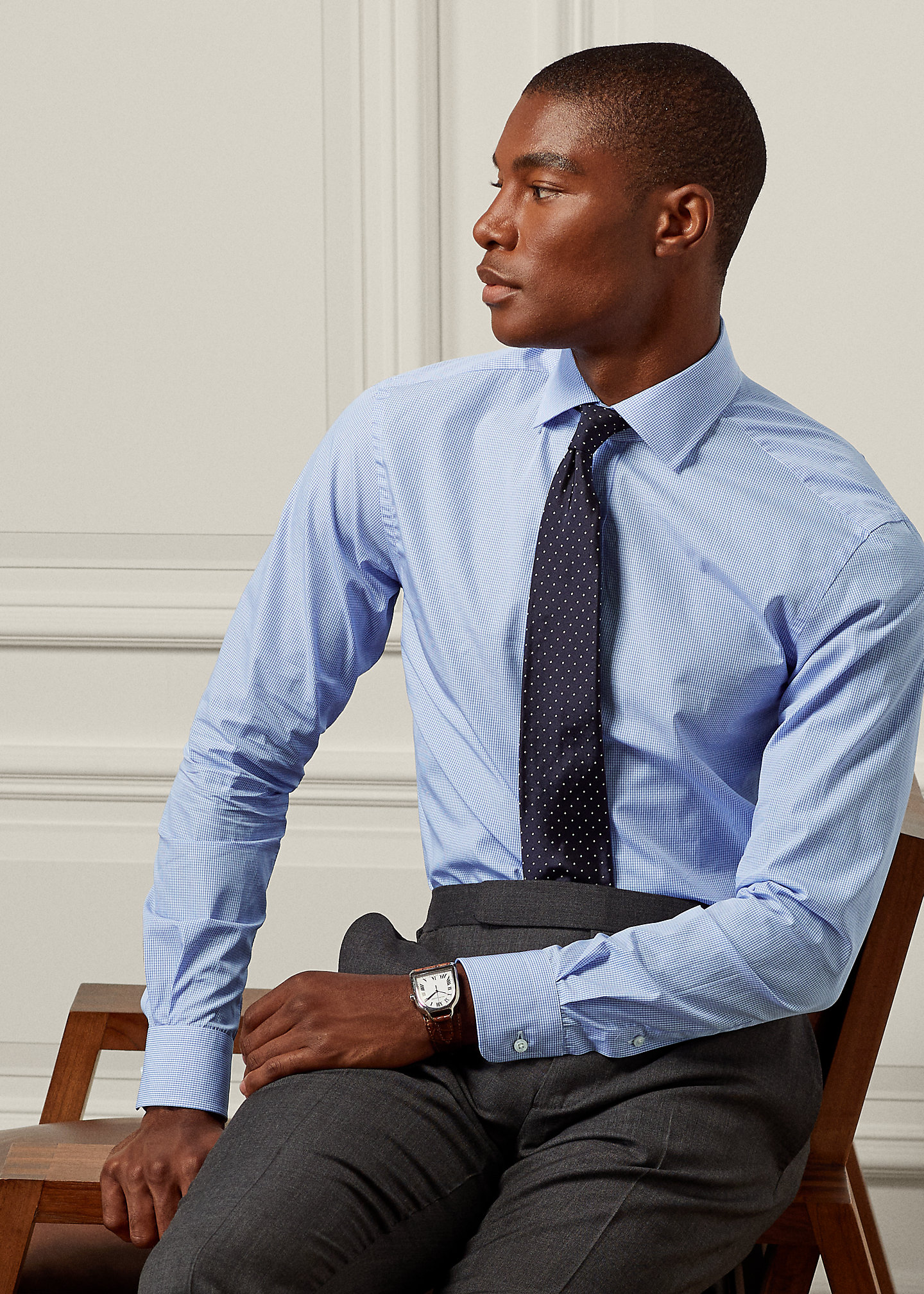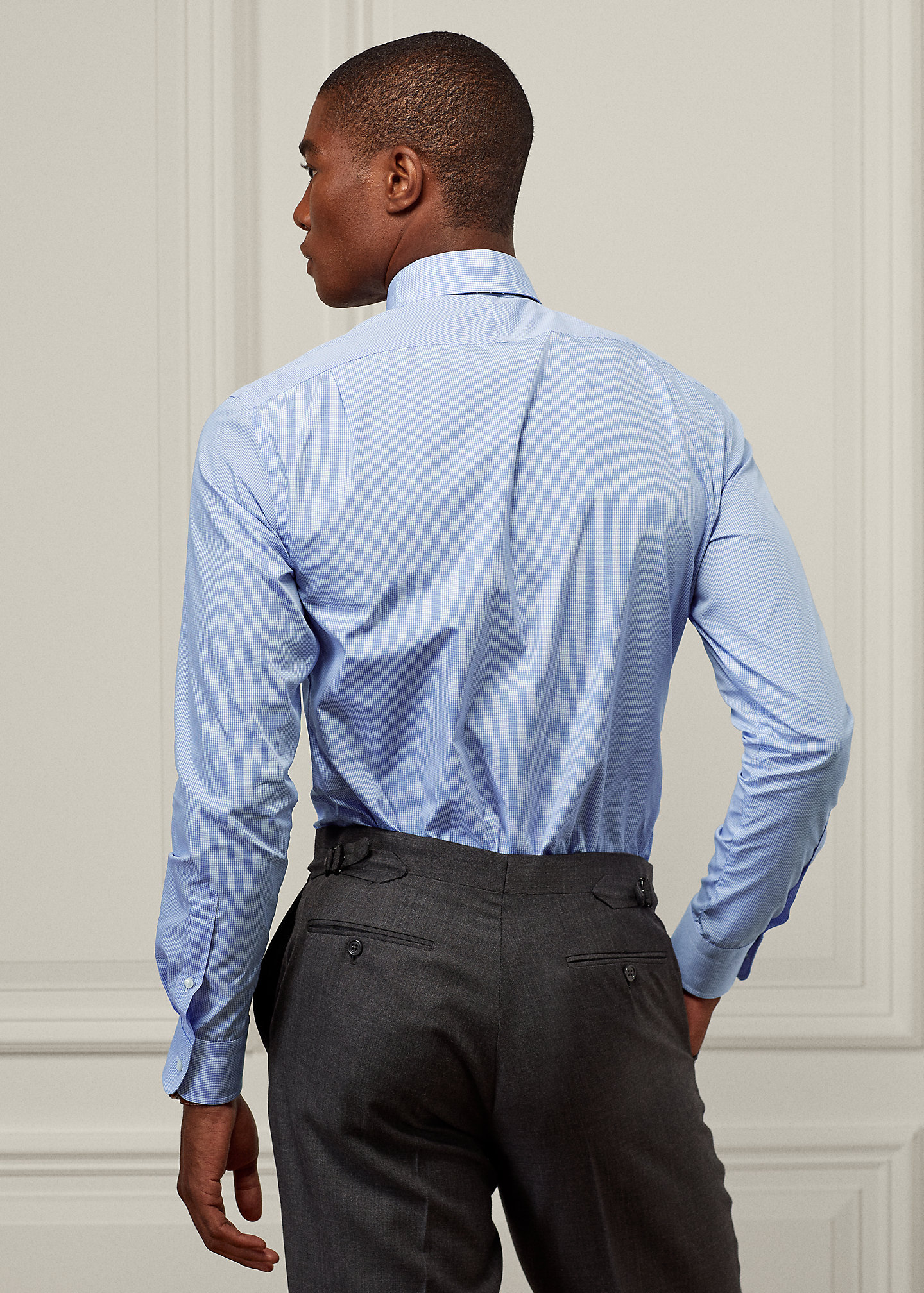- Split pleated back yoke ensures smooth, contoured shoulders.