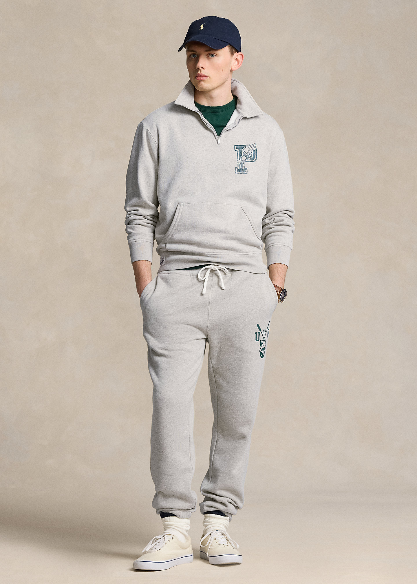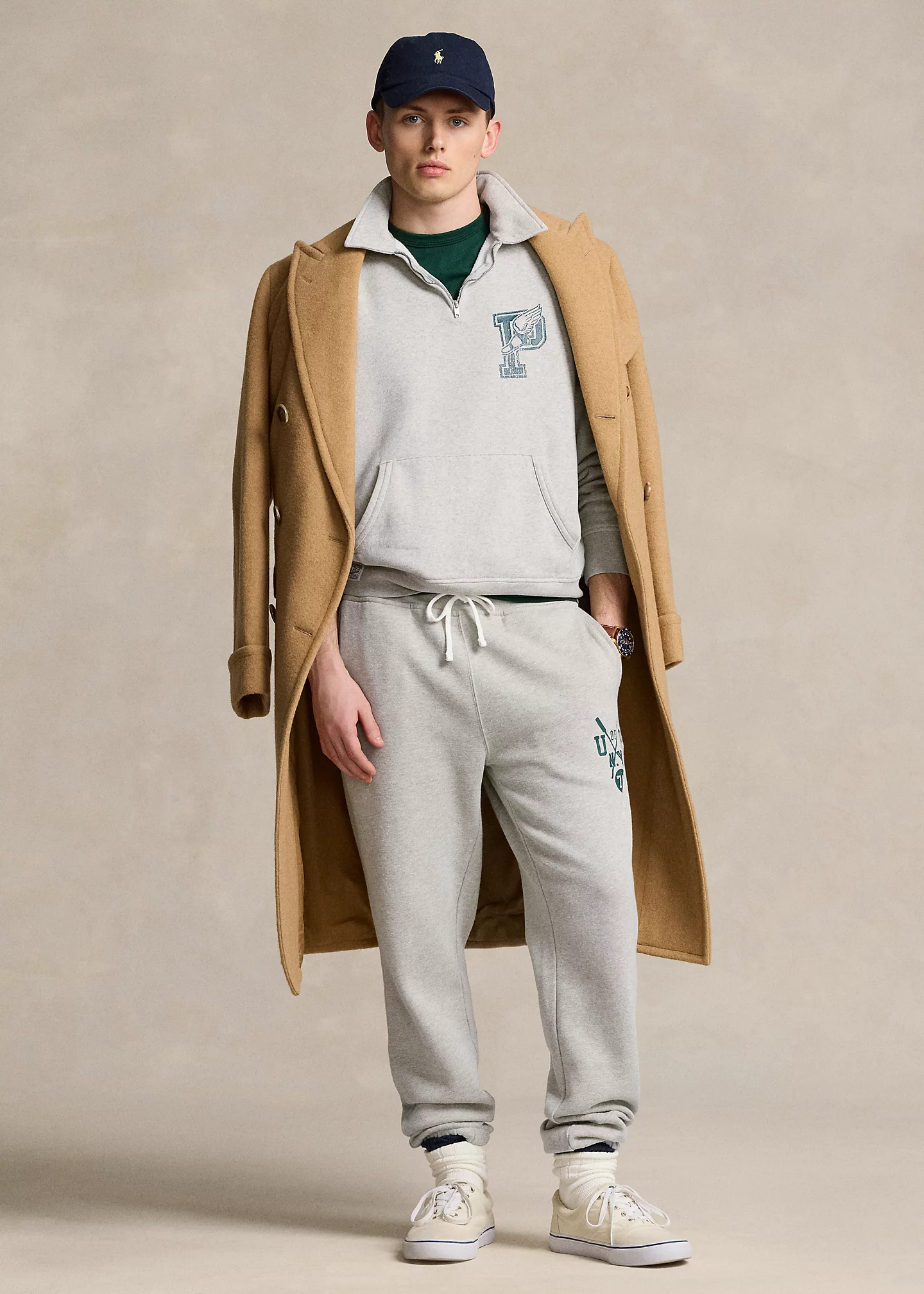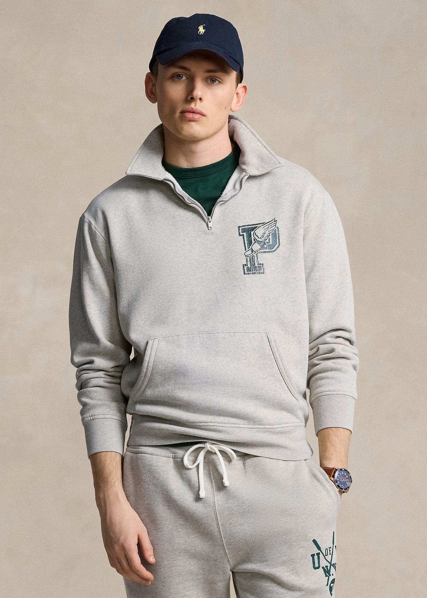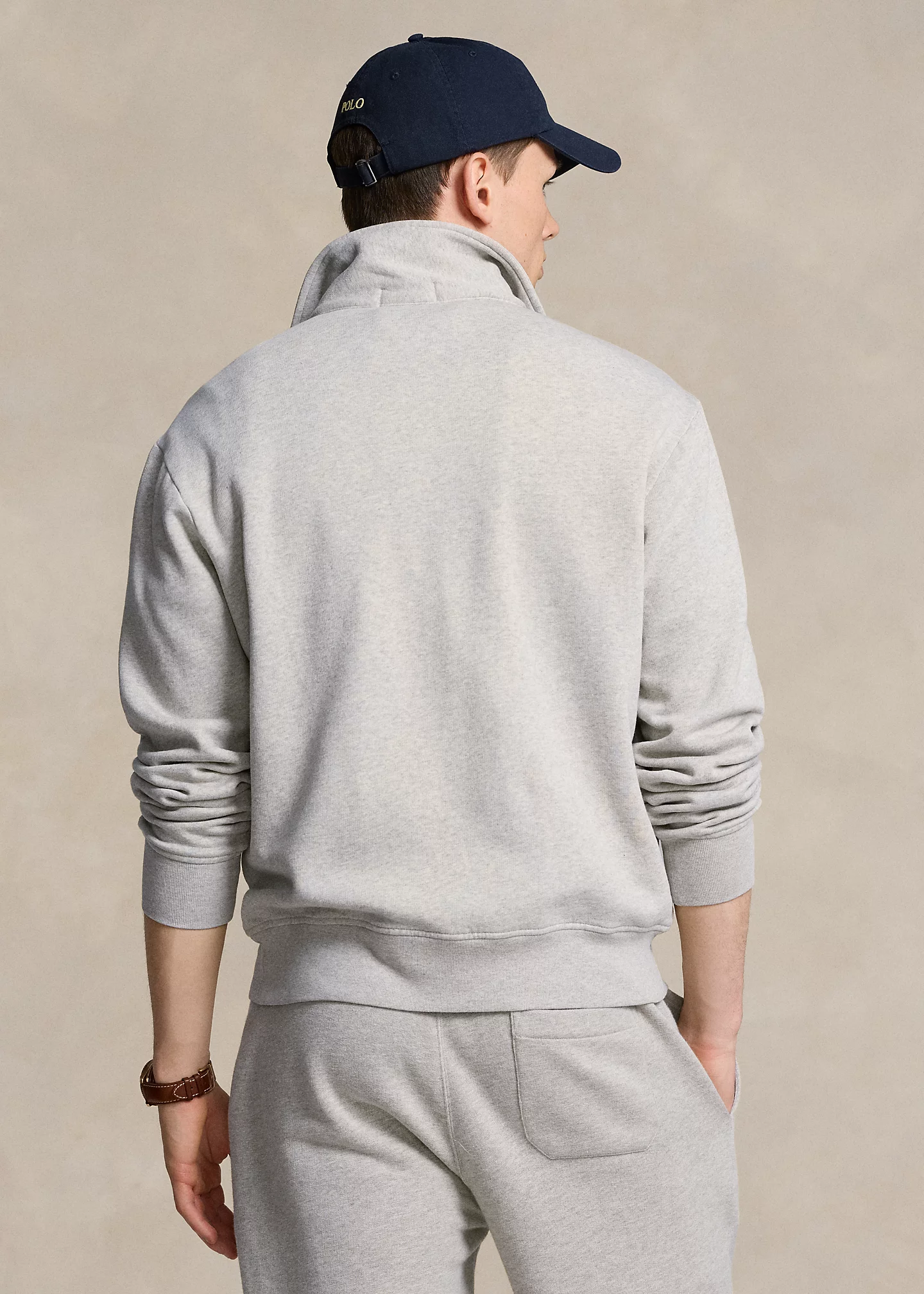 - Kangaroo pocket. Ribbed hem. “Polo RL” label at the right hem.