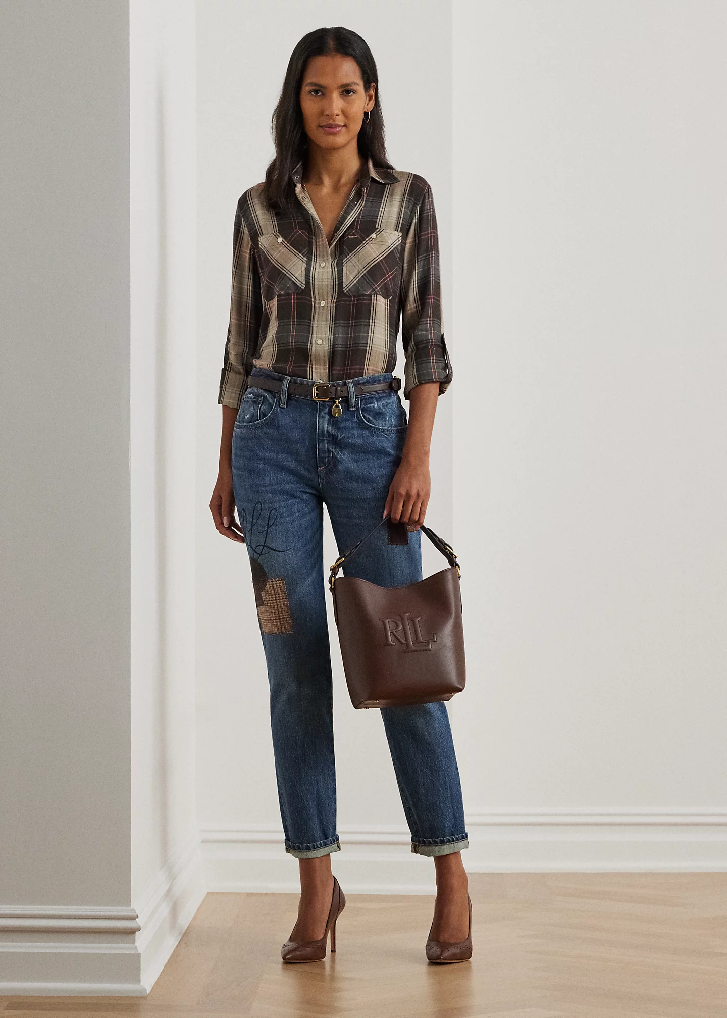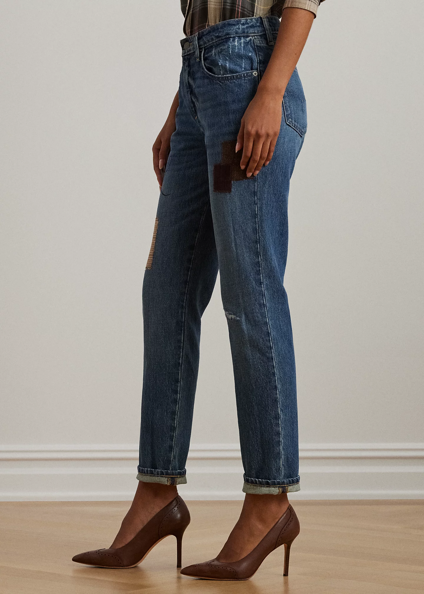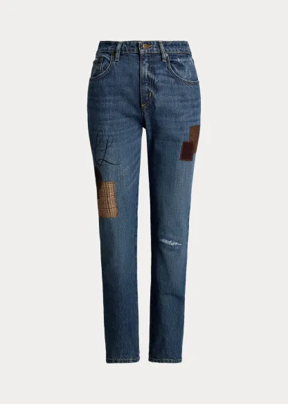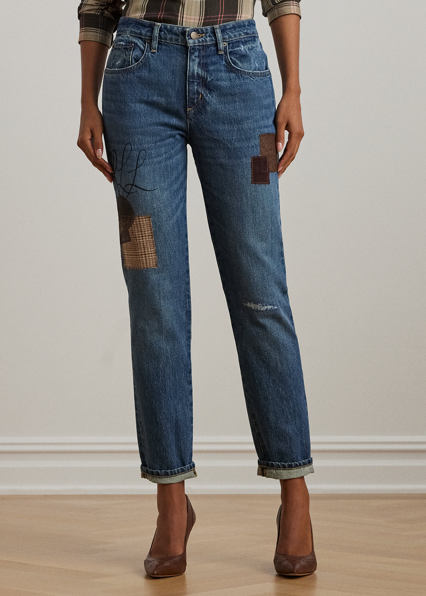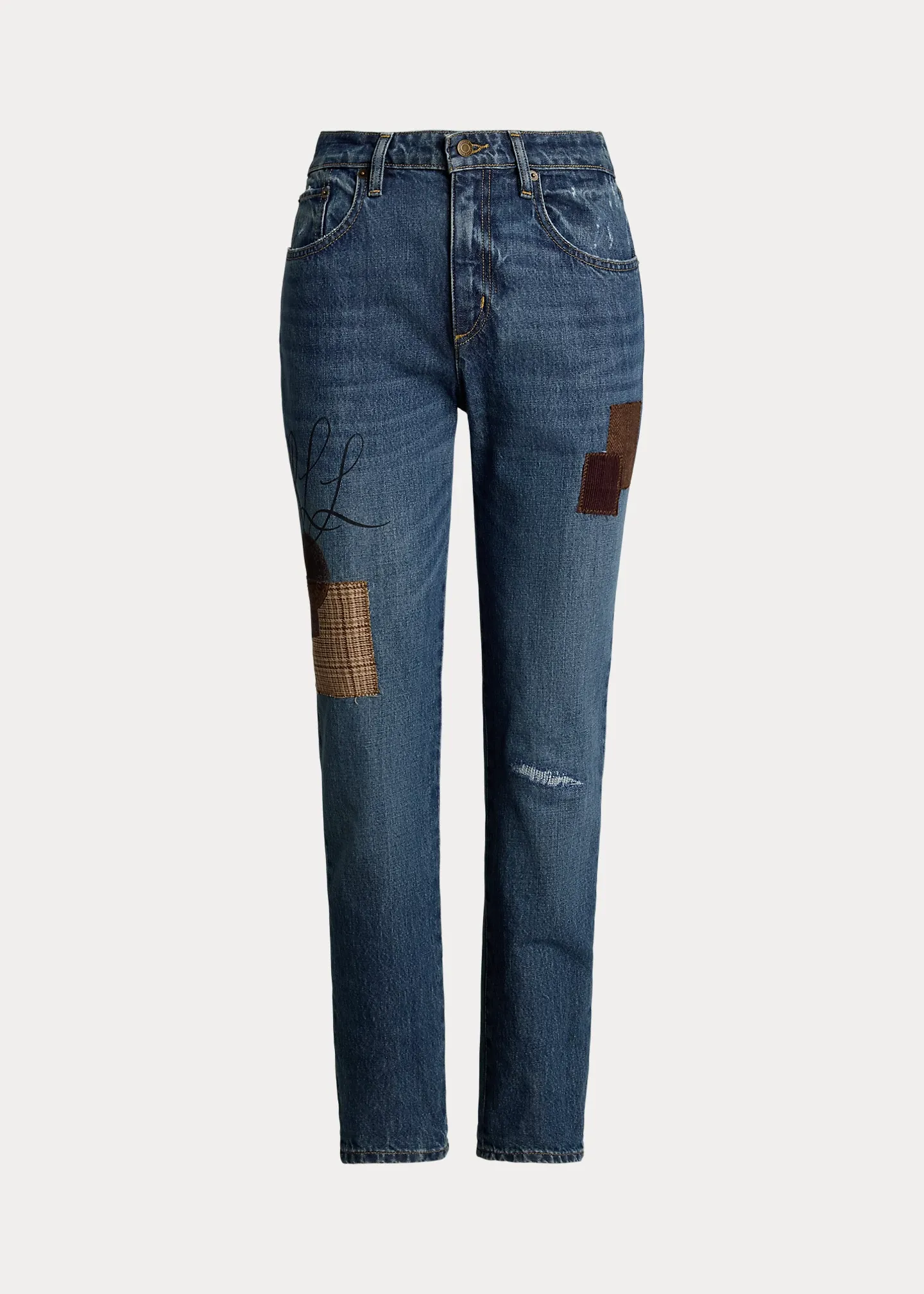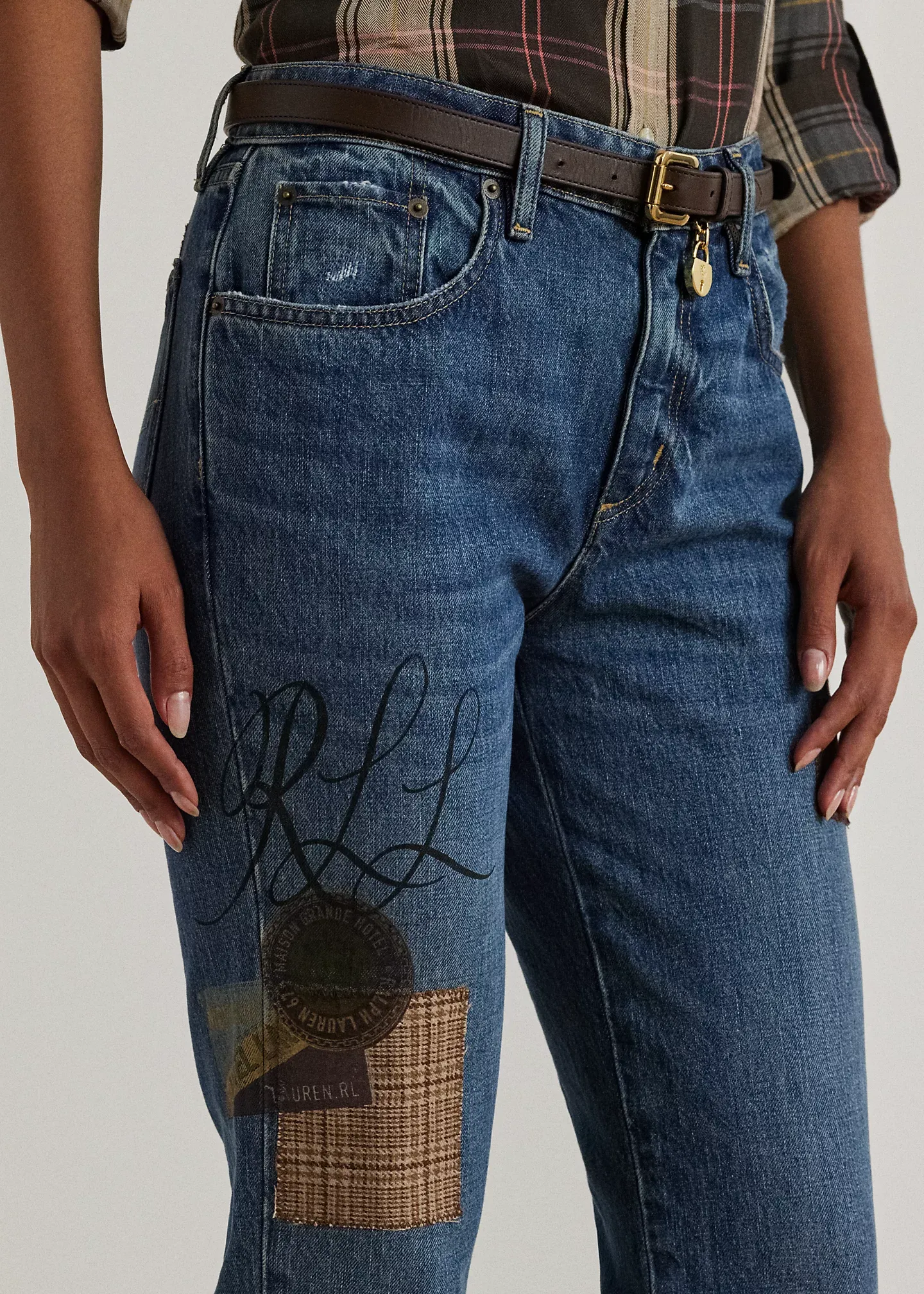 - Distressing at the front. Patchwork throughout. Screen-printed graphics at the front and back. Script “LRL” logo screen-printed at the front right thigh.