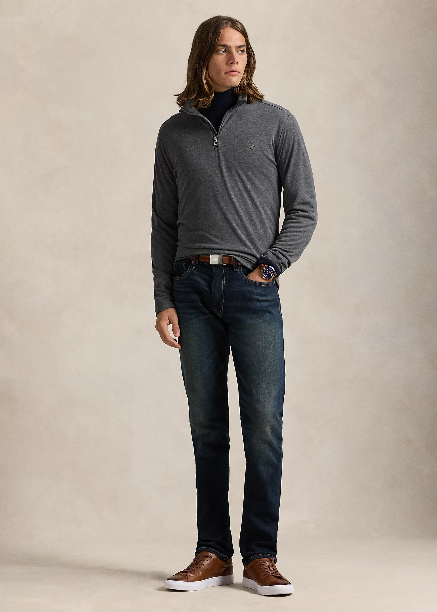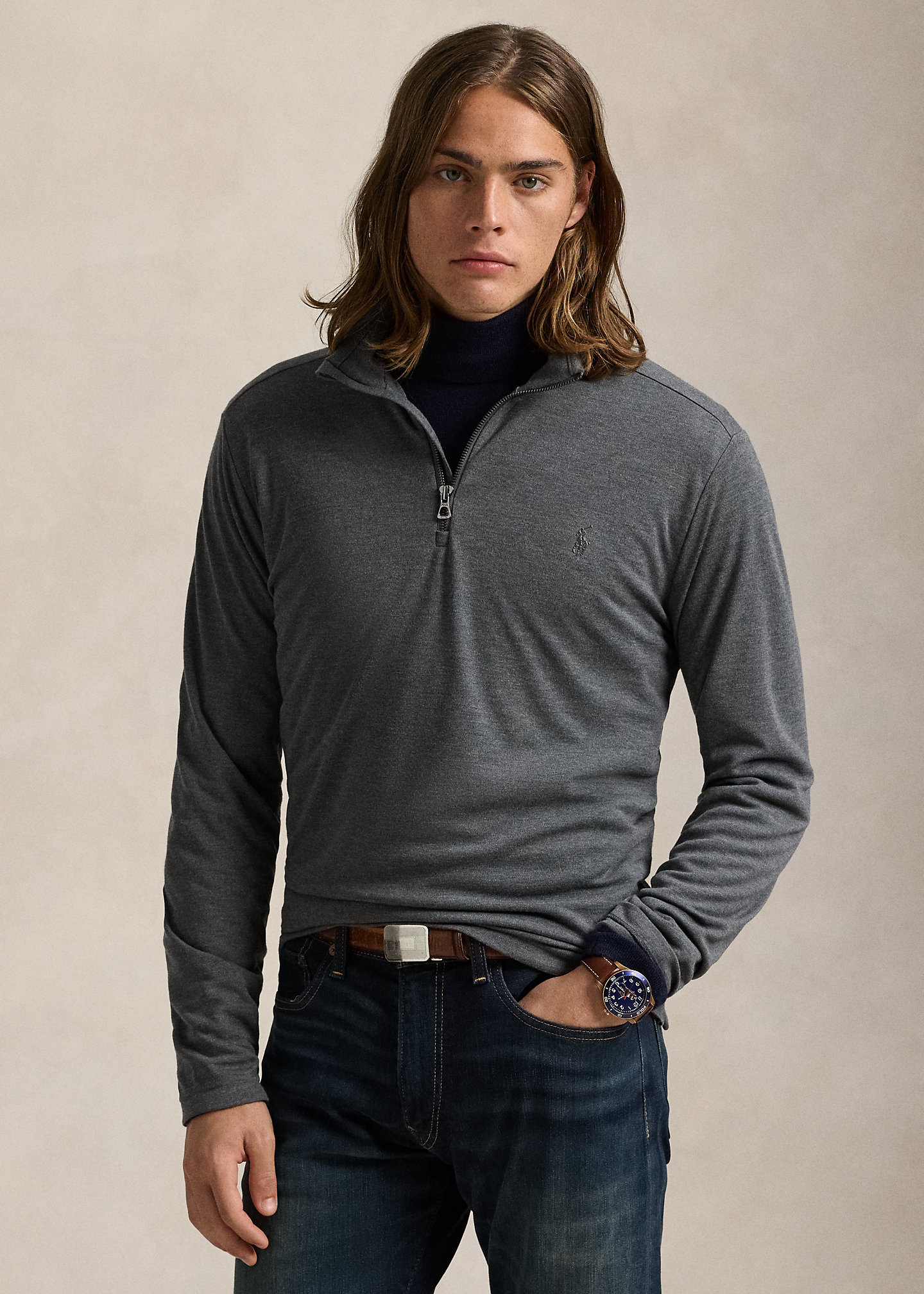 - Mockneck. Quarter-zip placket with a flap at the top that prevents chafing.