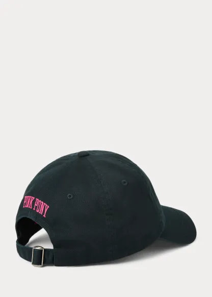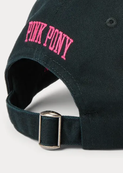 - “Pink Pony” embroidery and a buckled strap at the back.