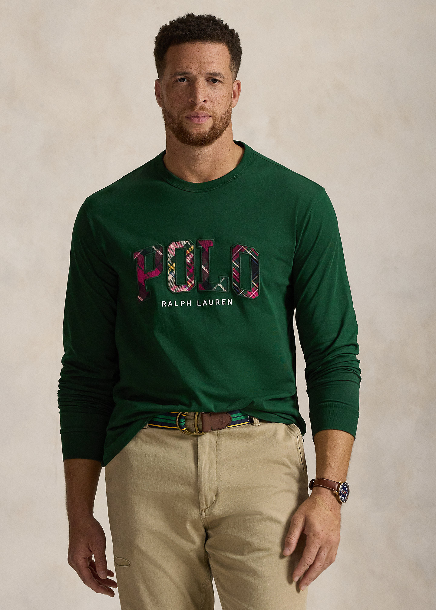 - Plaid appliqués spelling out "Polo" and "Ralph Lauren" embroidery at the center front.