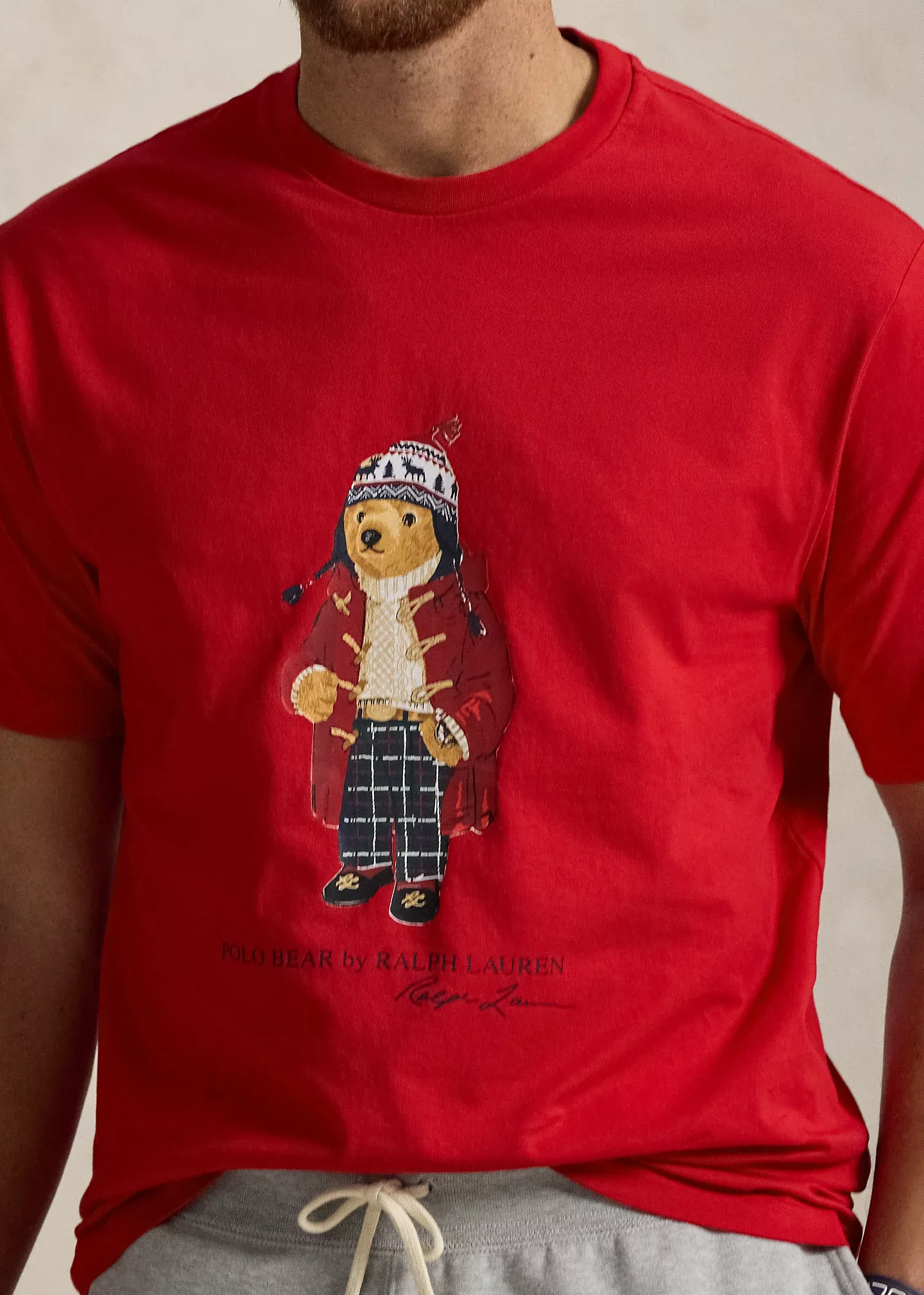 - Polo Bear, "Polo Bear by Ralph Lauren," and "Ralph Lauren" script printed at the center front.