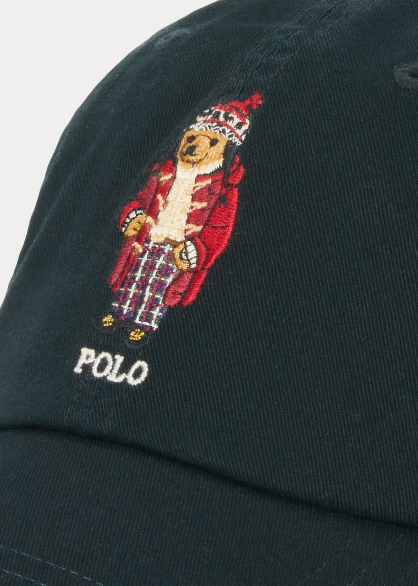 - “Polo Ralph Lauren” embroidery and a buckled leather strap at the back.