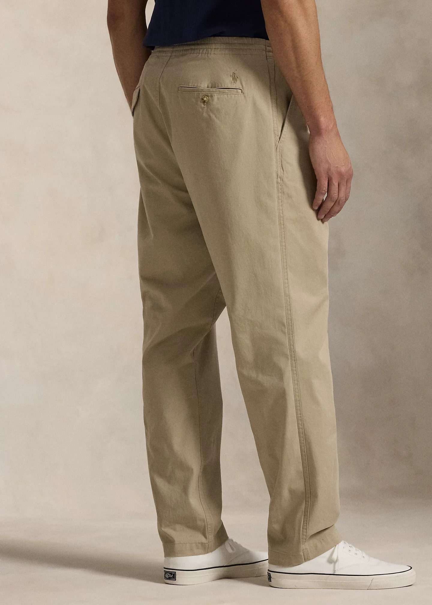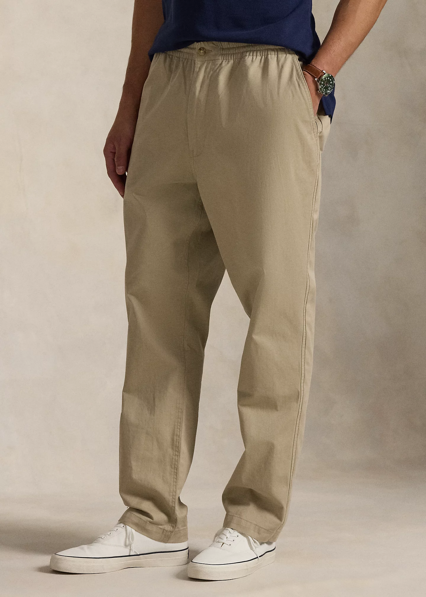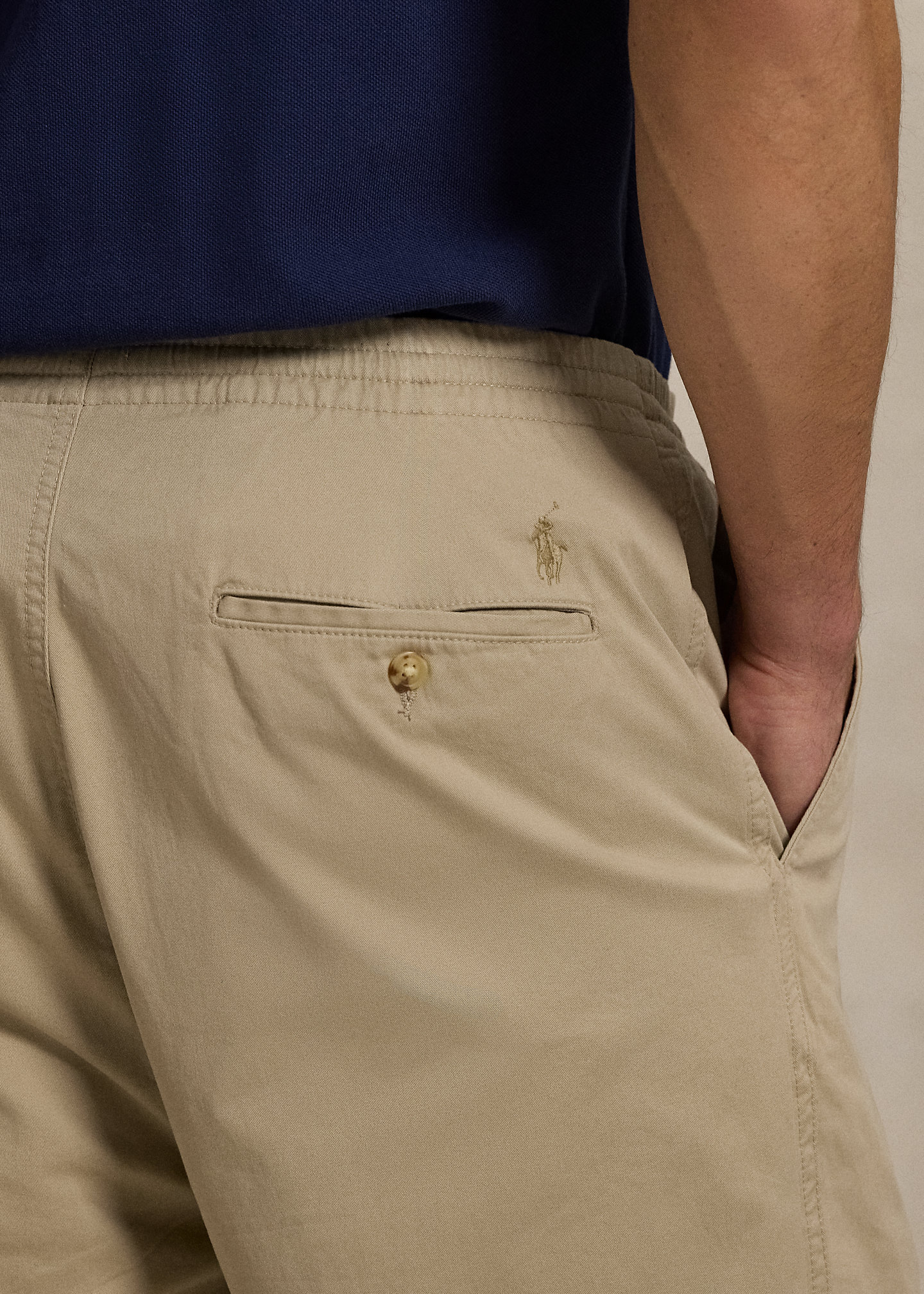 - Elastic waistband with an interior drawstring. Zip fly with a buttoned closure.