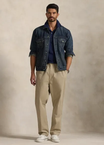 - Stretch Classic Fit: sits at the waist. Eased through the leg.