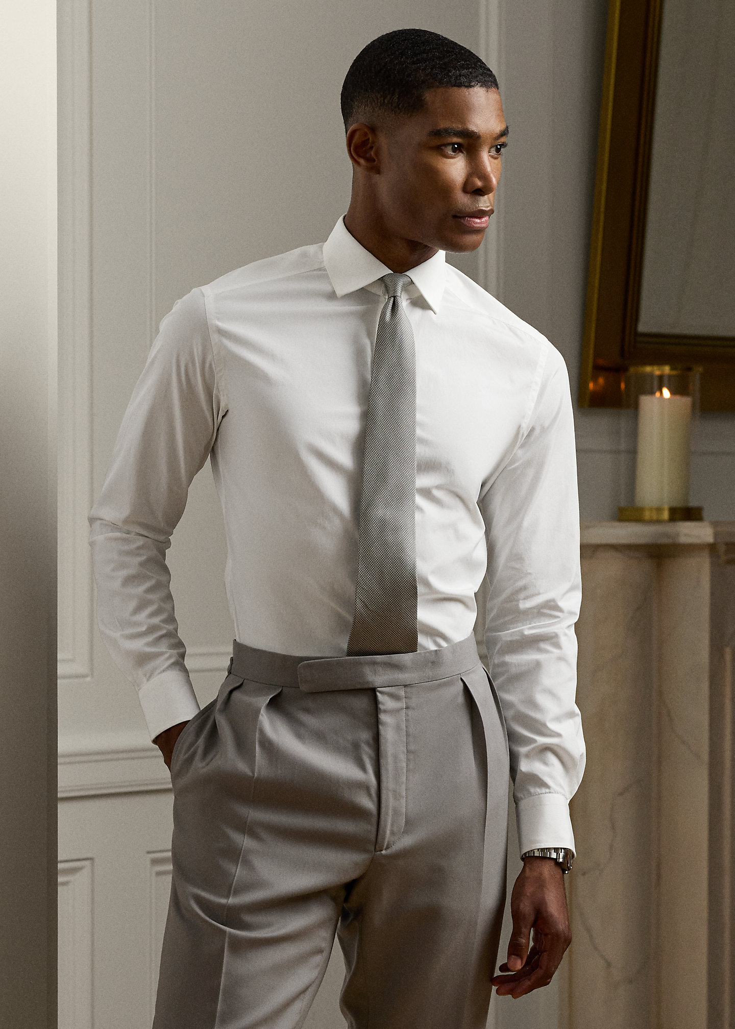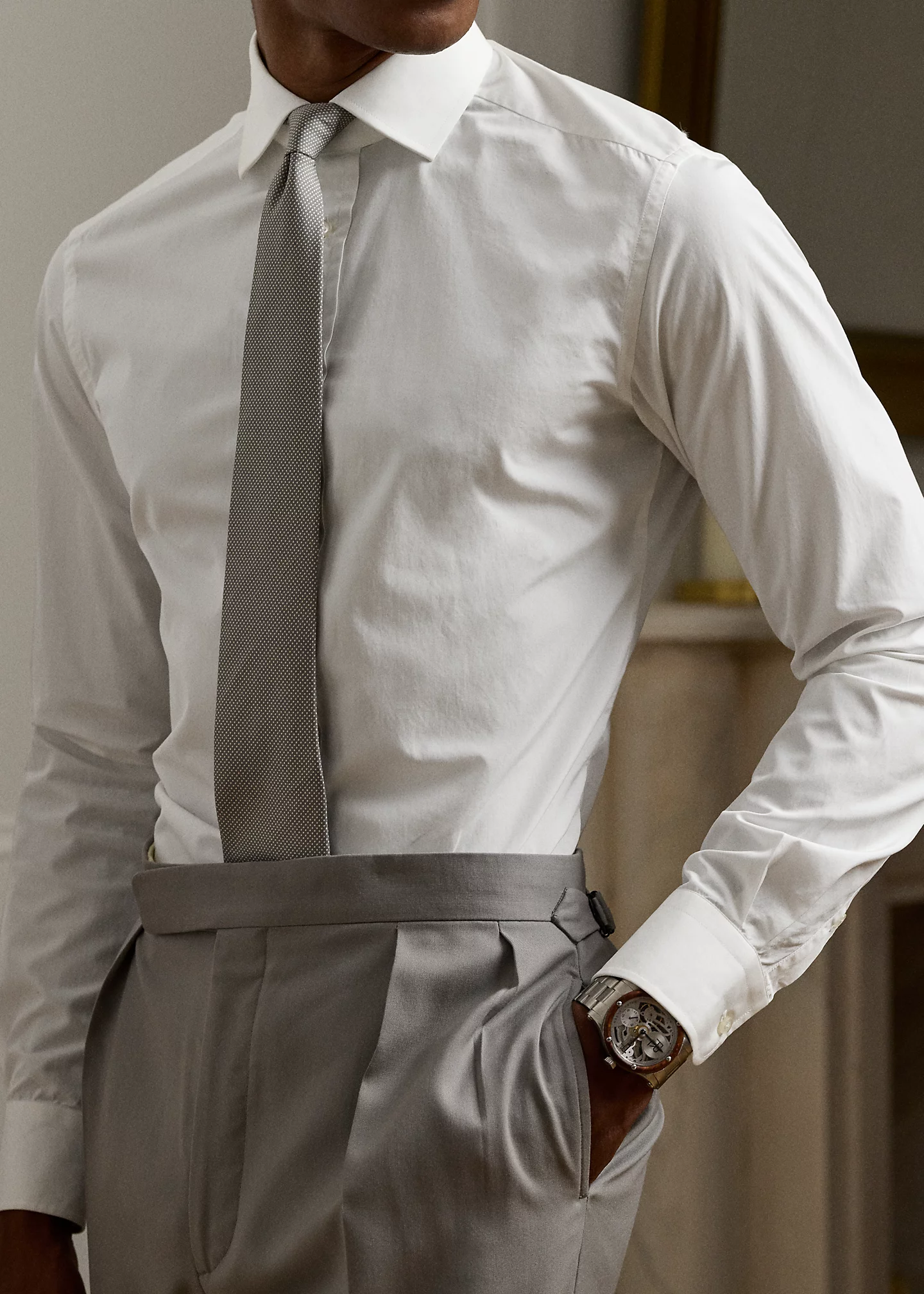 - Long sleeves with buttoned barrel cuffs.