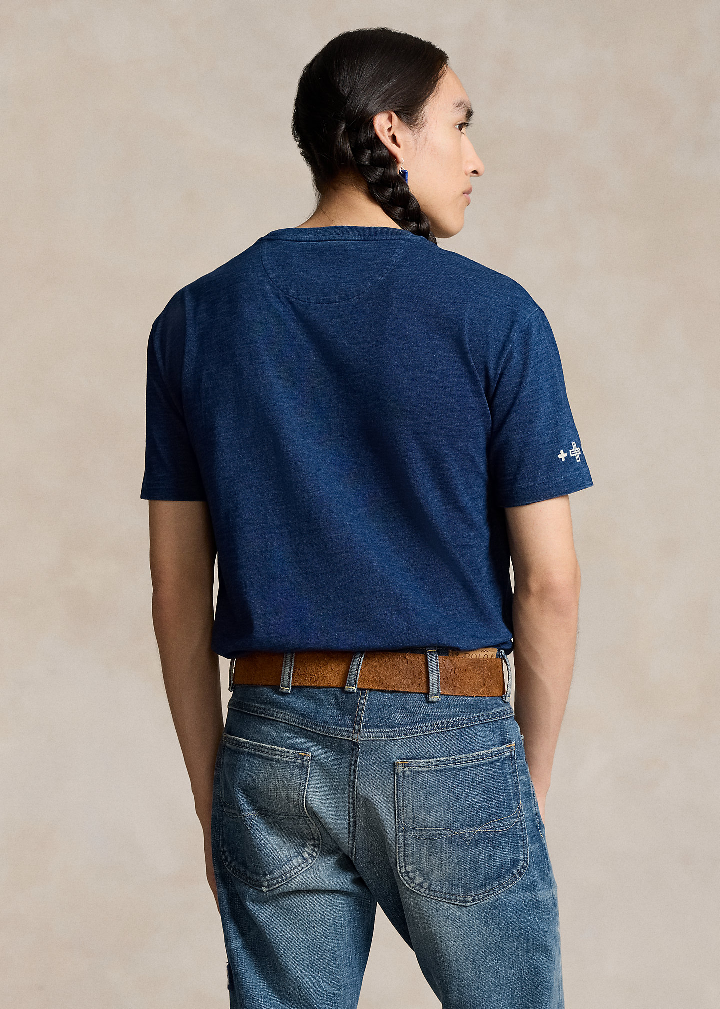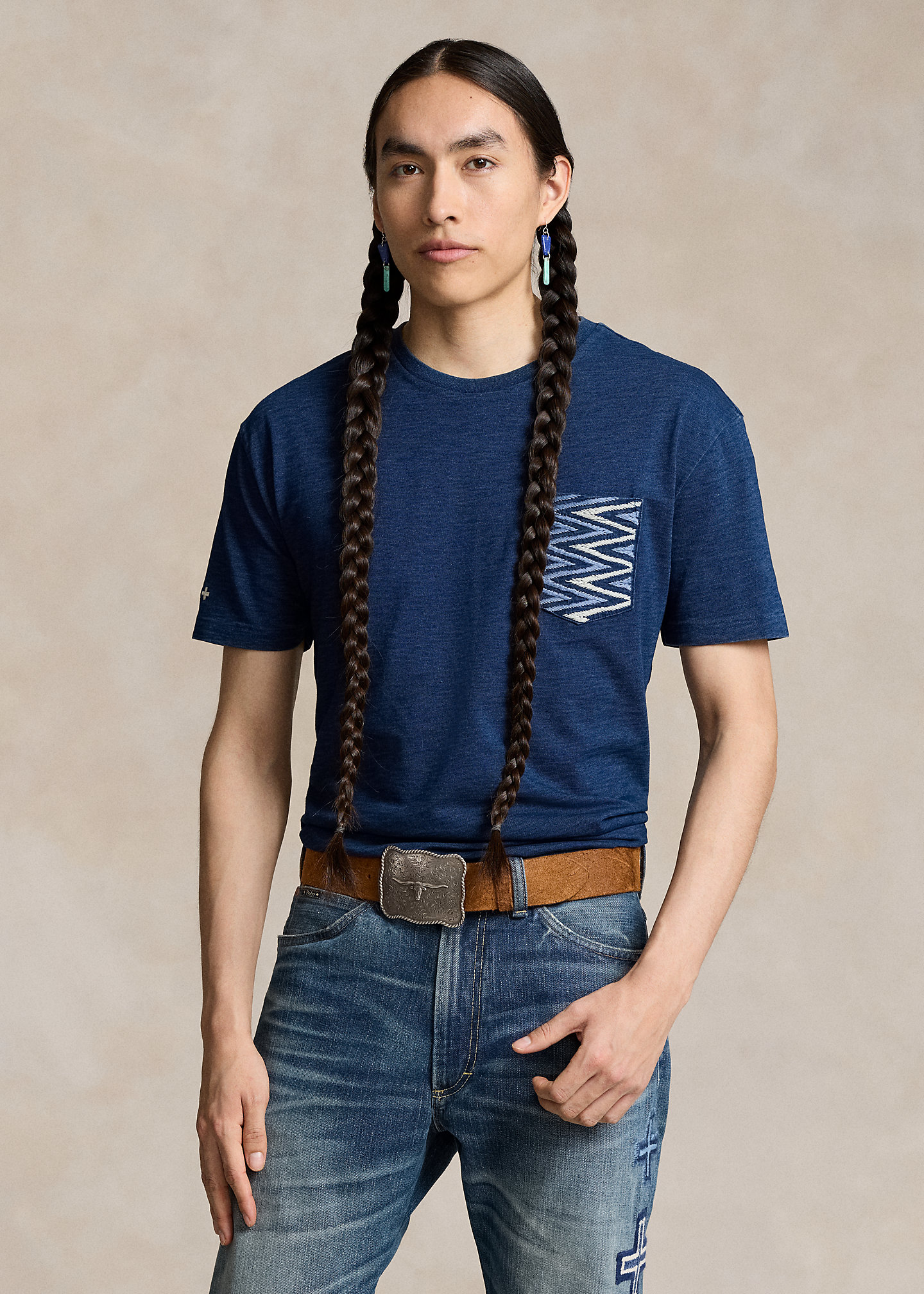 - Crewneck with custom wedge weave–patterned trim at the interior. Short sleeves. Four-directional crosses embroidered at the right sleeve.