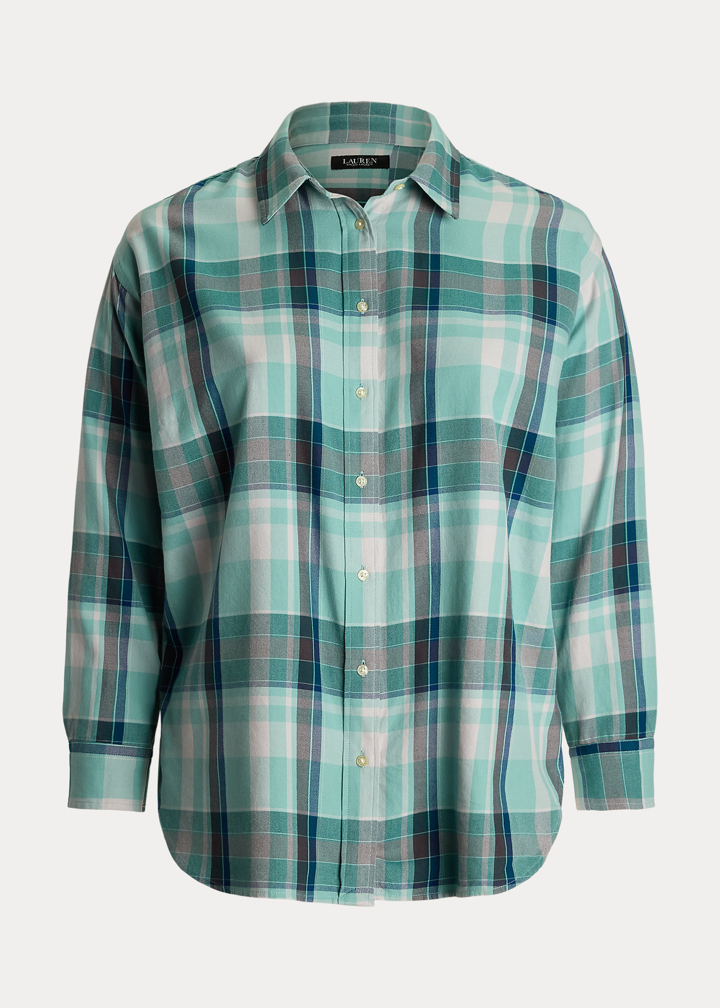 - Point collar. Buttoned placket. “Lauren Ralph Lauren”–engraved buttons.