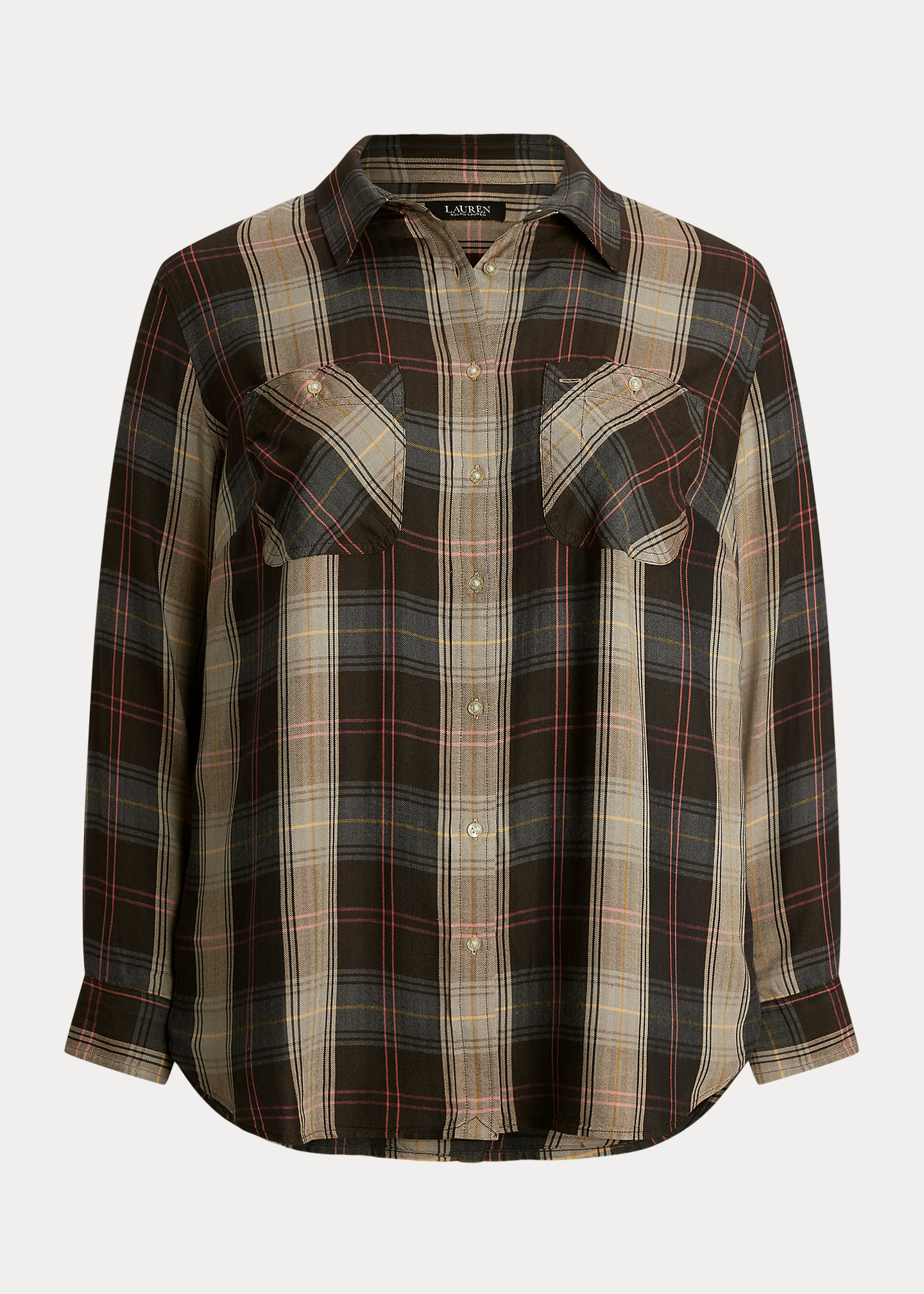 - Point collar. Buttoned placket. “Lauren Ralph Lauren”–engraved buttons.
