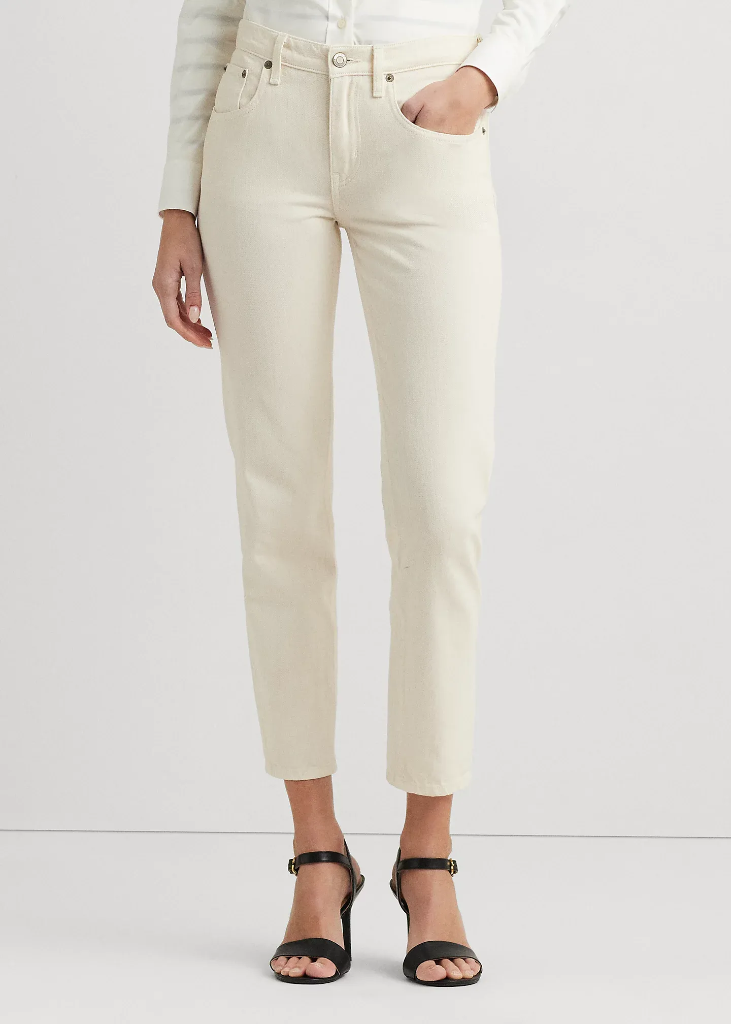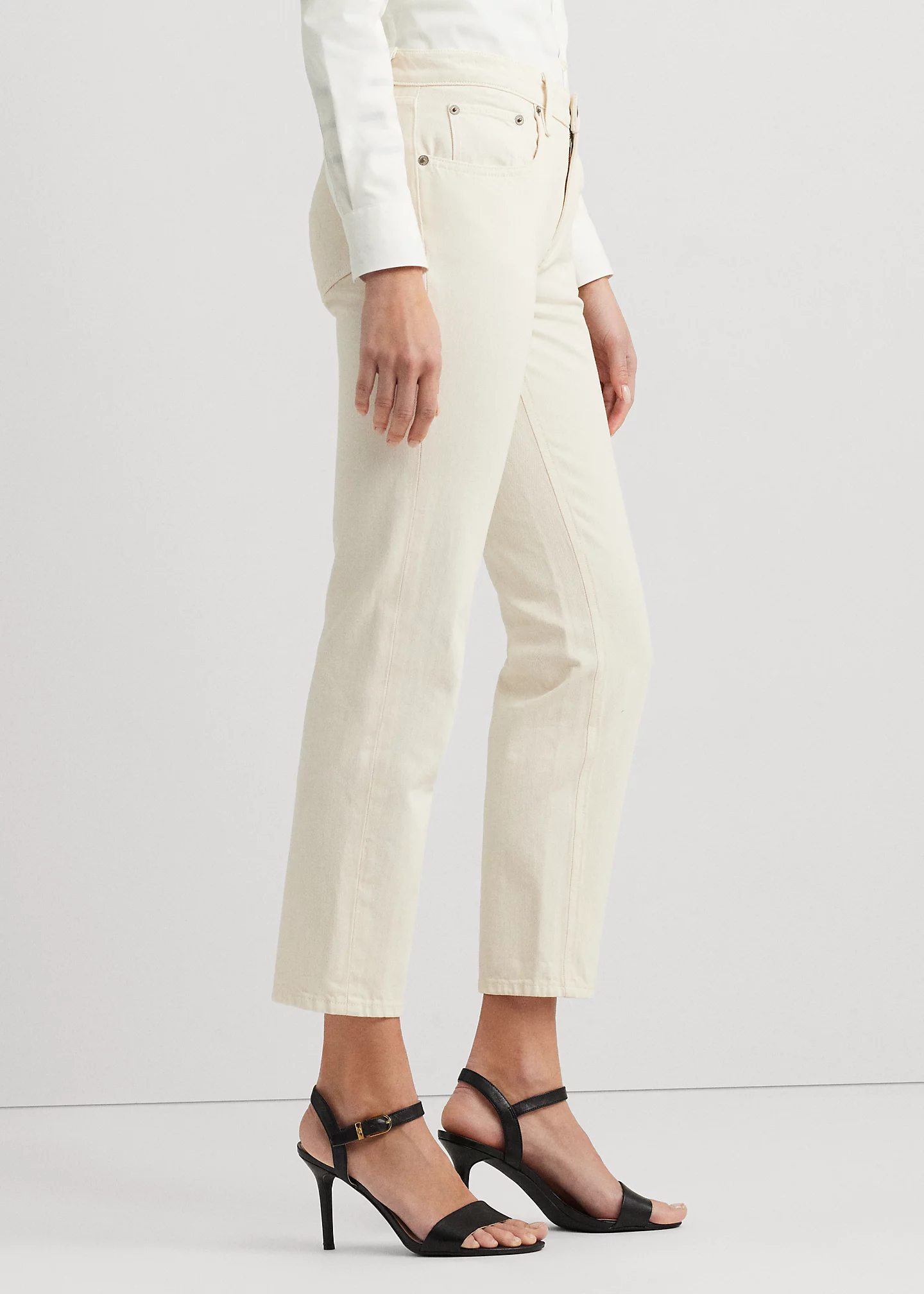 - Belt loops. Zip fly with a signature buttoned closure.