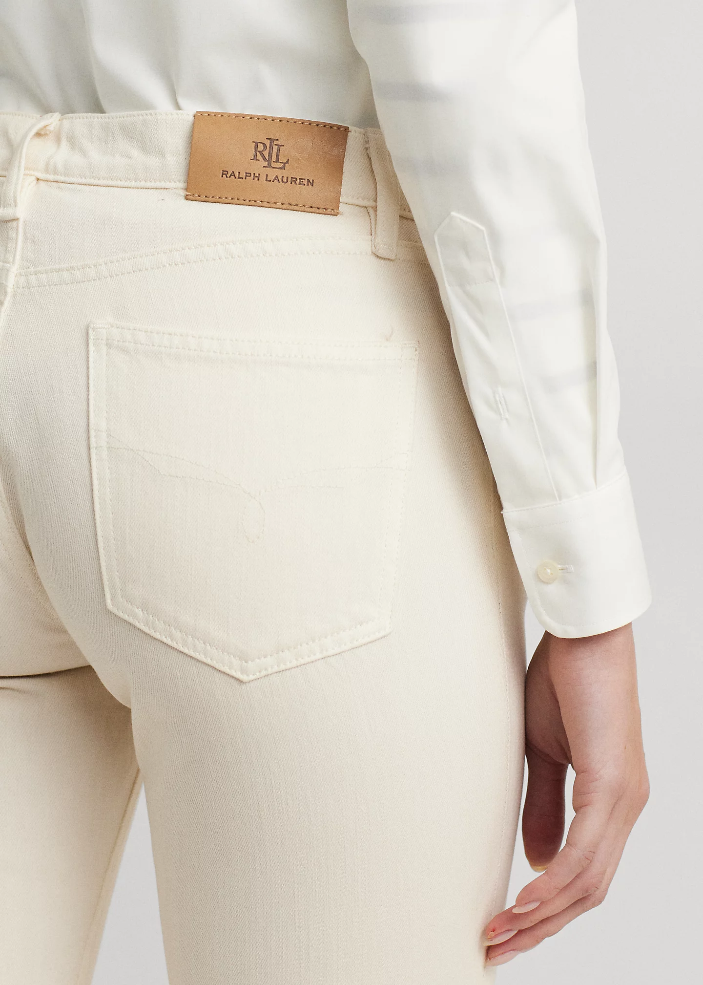 - Five-pocket styling with signature metal rivets. Debossed signature leather patch at the back right waist.