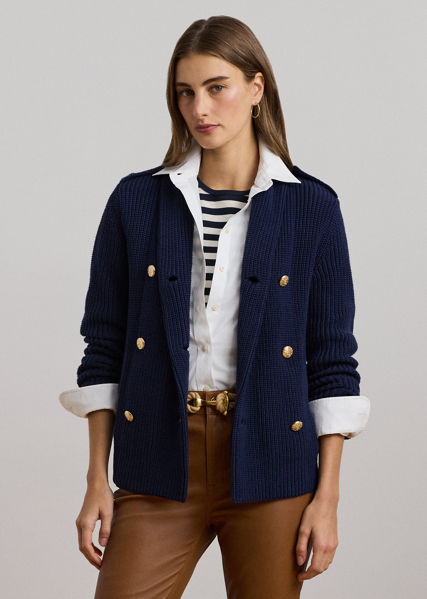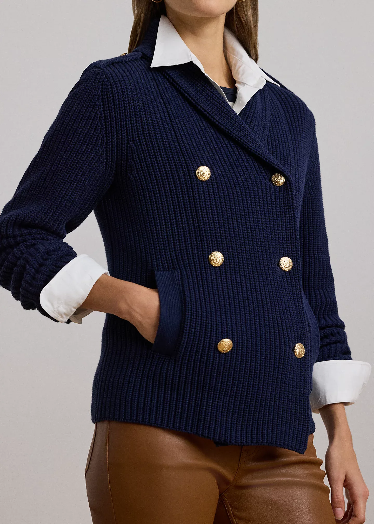 - Shawl collar. Double-breasted silhouette. Anchor crest-embossed metal buttons.