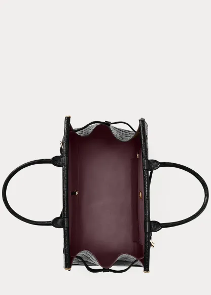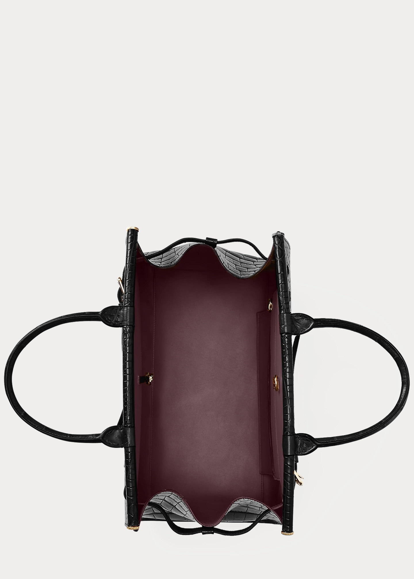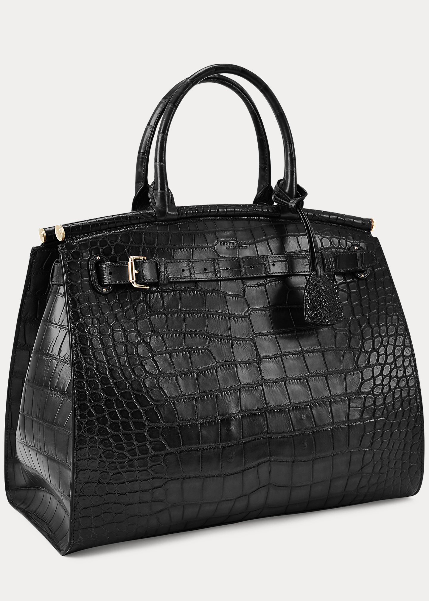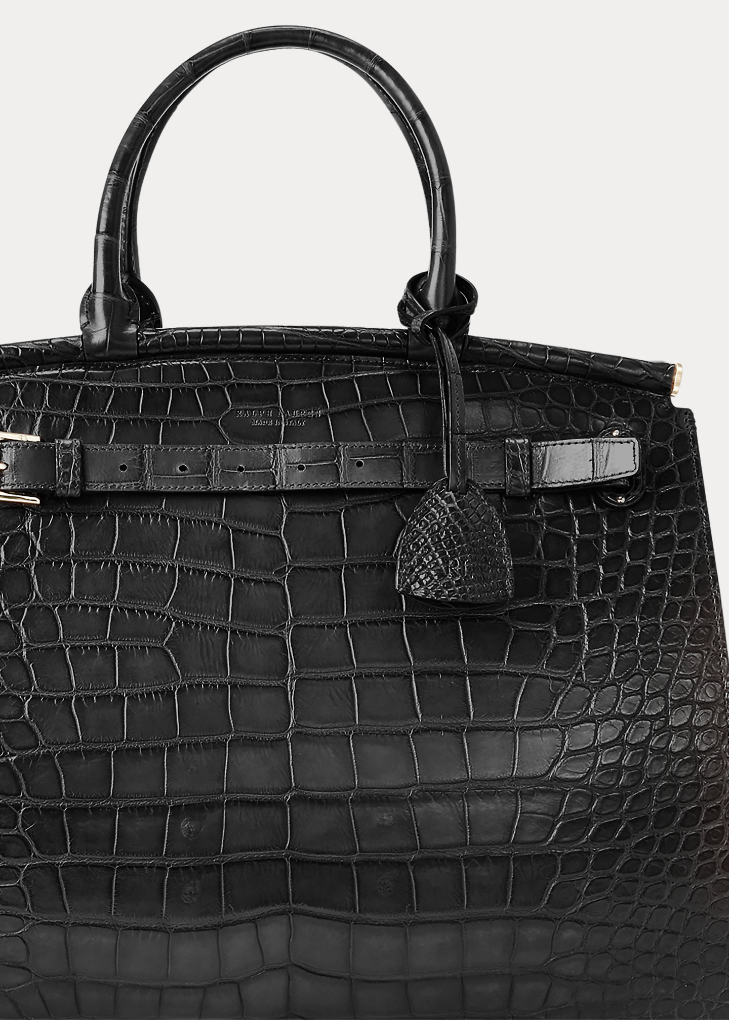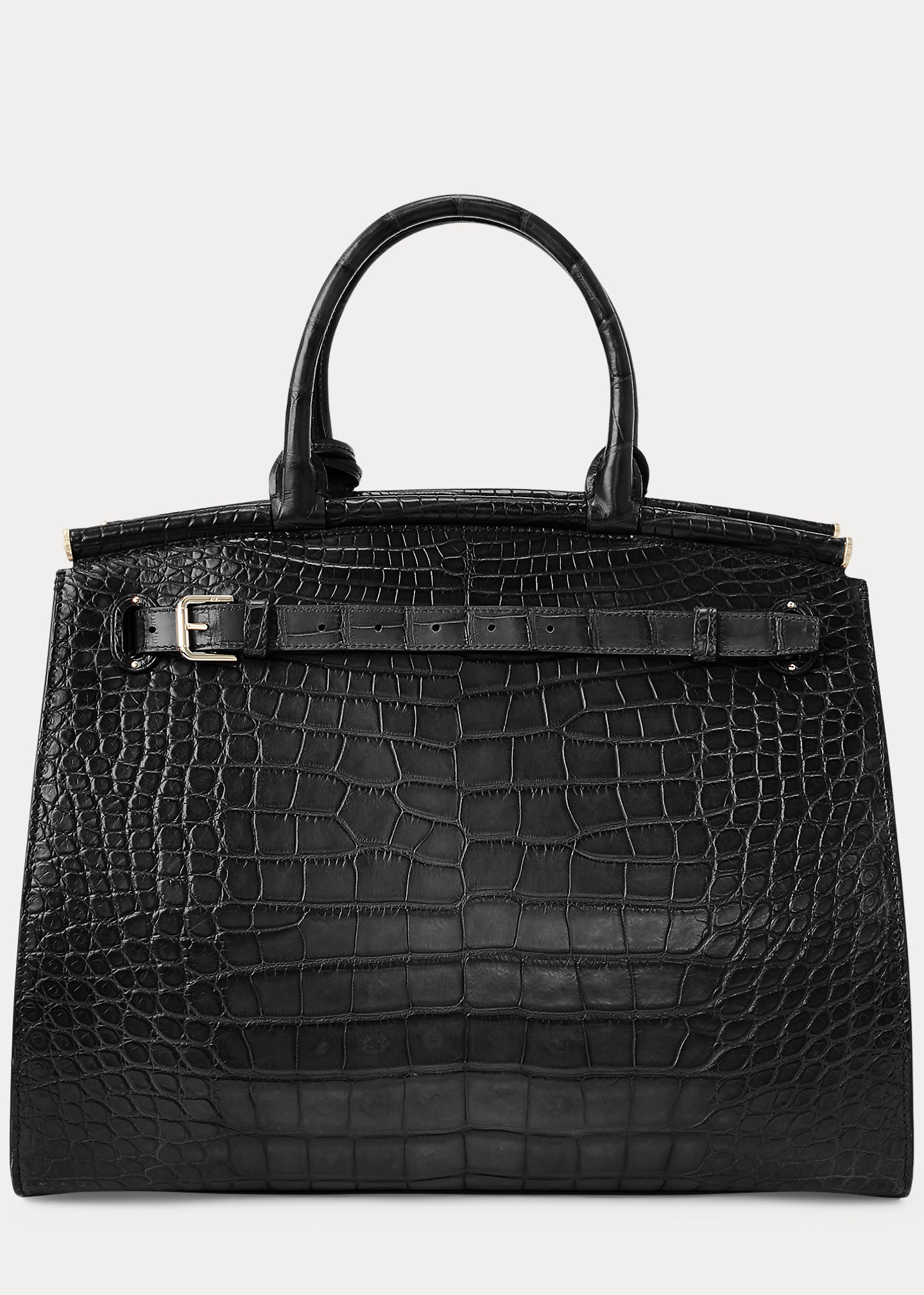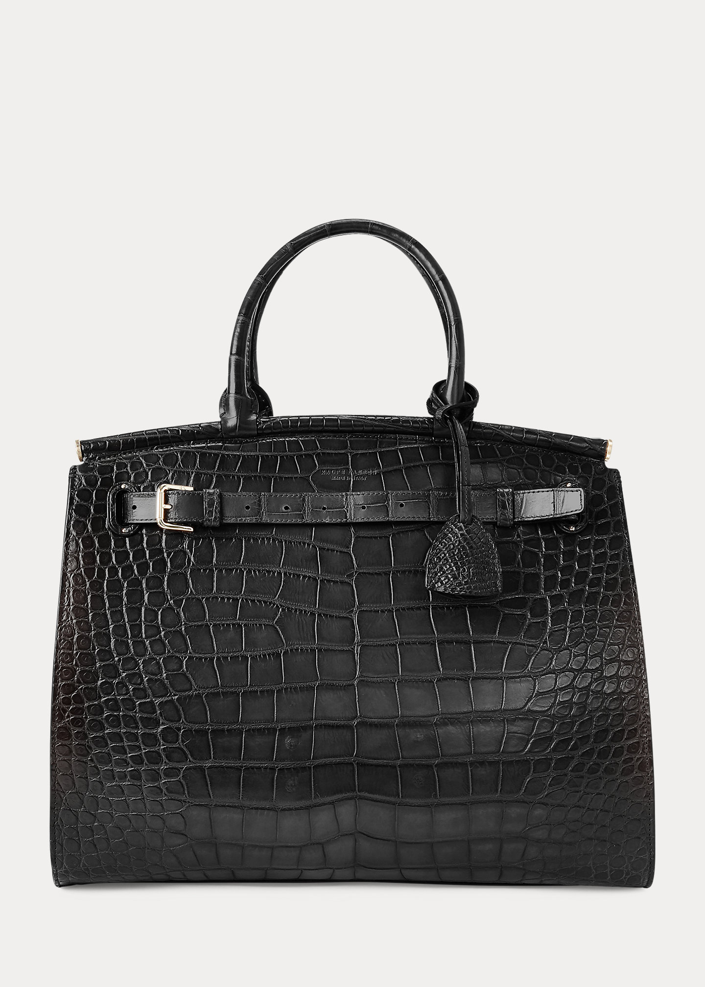 - Interior hook closure. Two alligator-covered metal bars at the topline. “RL”-engraved topline tips. Alligator belt loops around the bag and secures with a gold-tone buckled belt at the front.