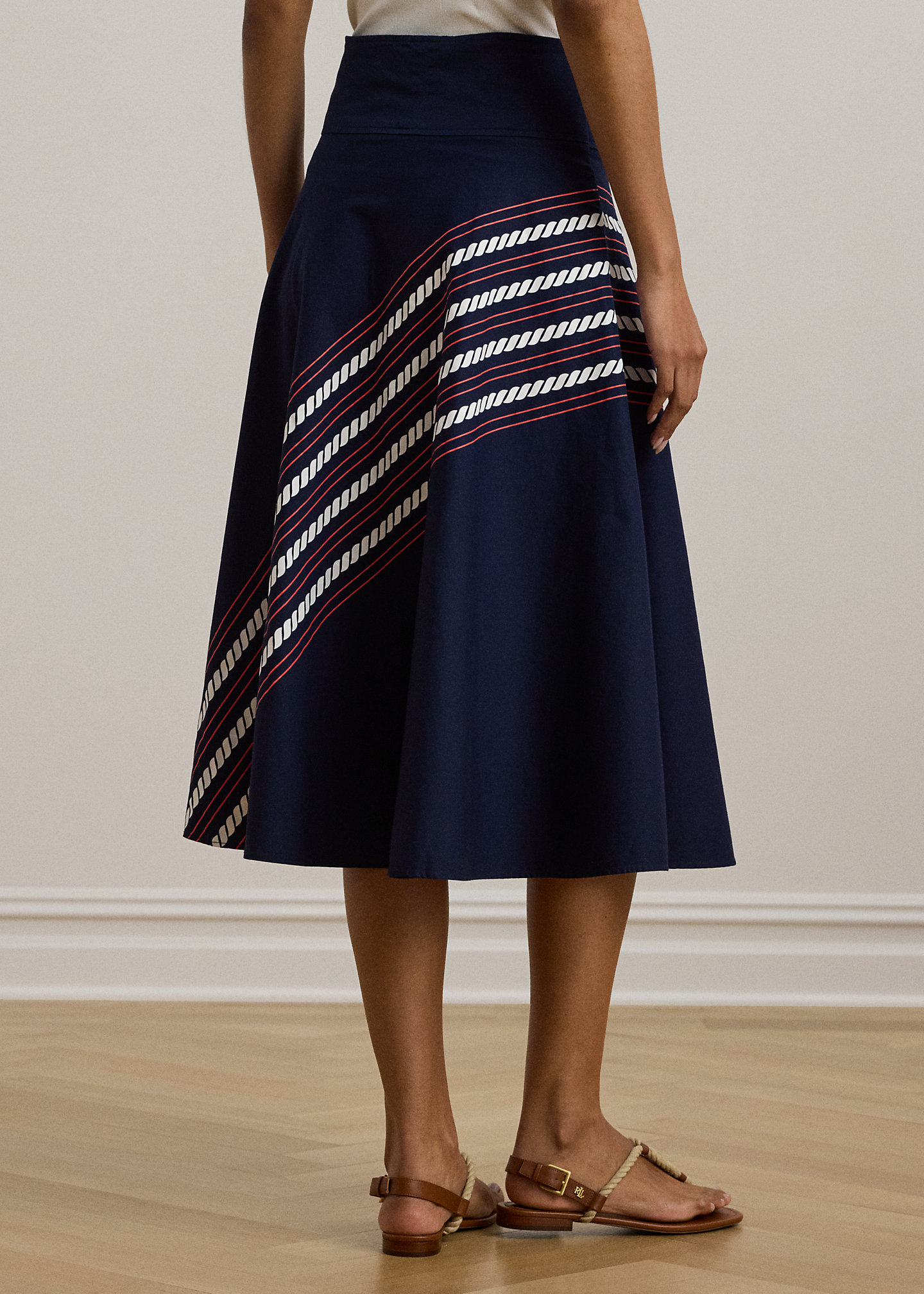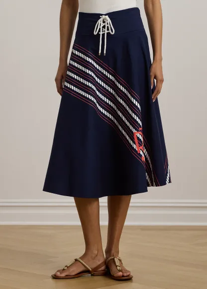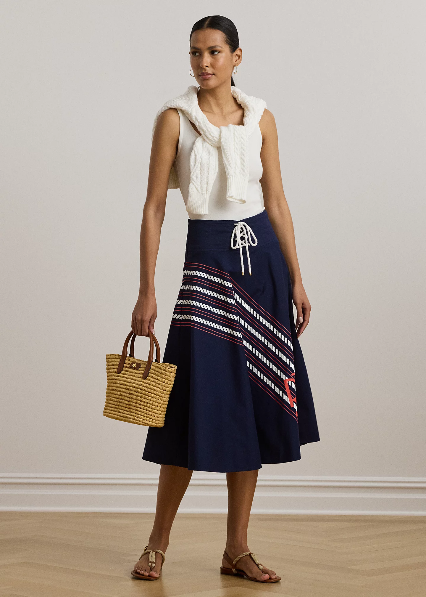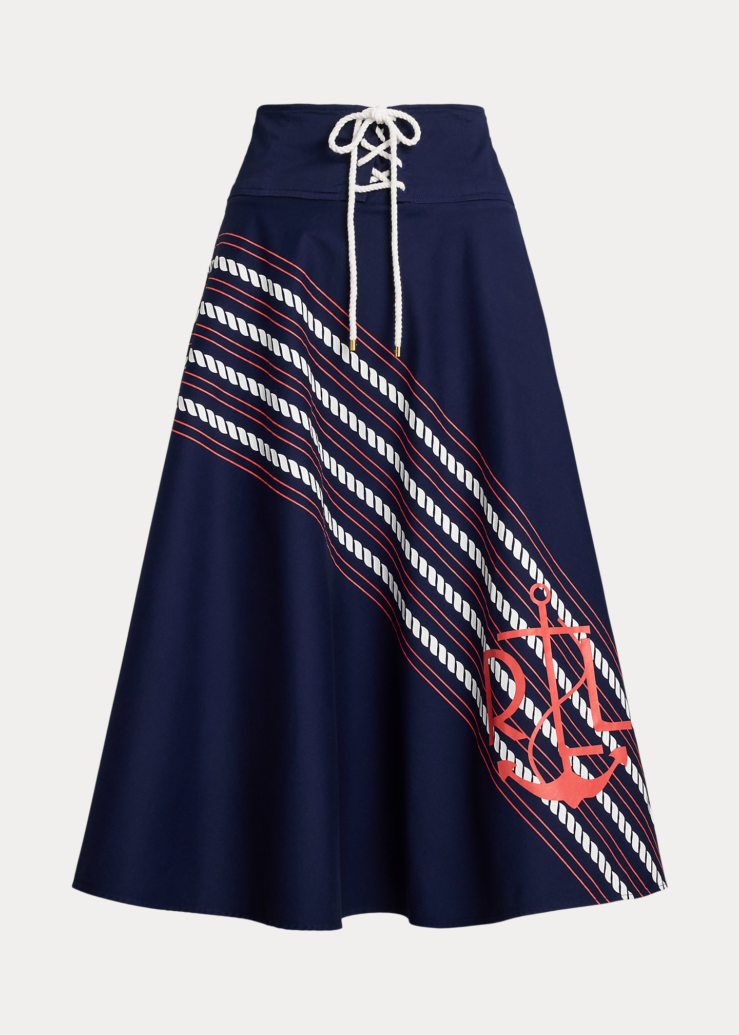 - Concealed left-side-seam zipper with a hook-and-eye closure. Wide waistband with a lace-up detail at the center front. “LRL”-engraved brass cord ends.