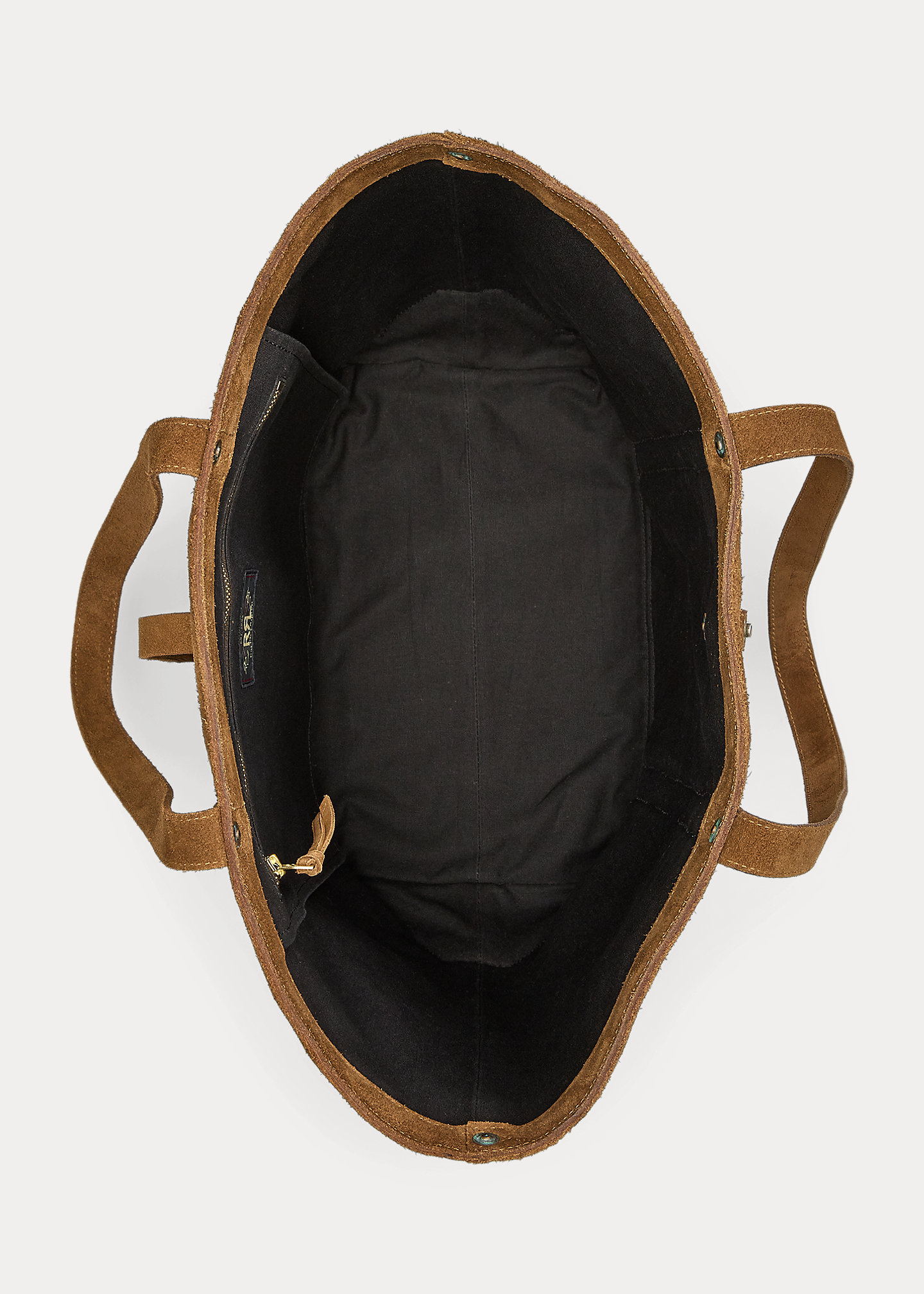 - Interior zip pocket. Roughout suede trim and base. Distressed copper-tone rivets. Lined with canvas.