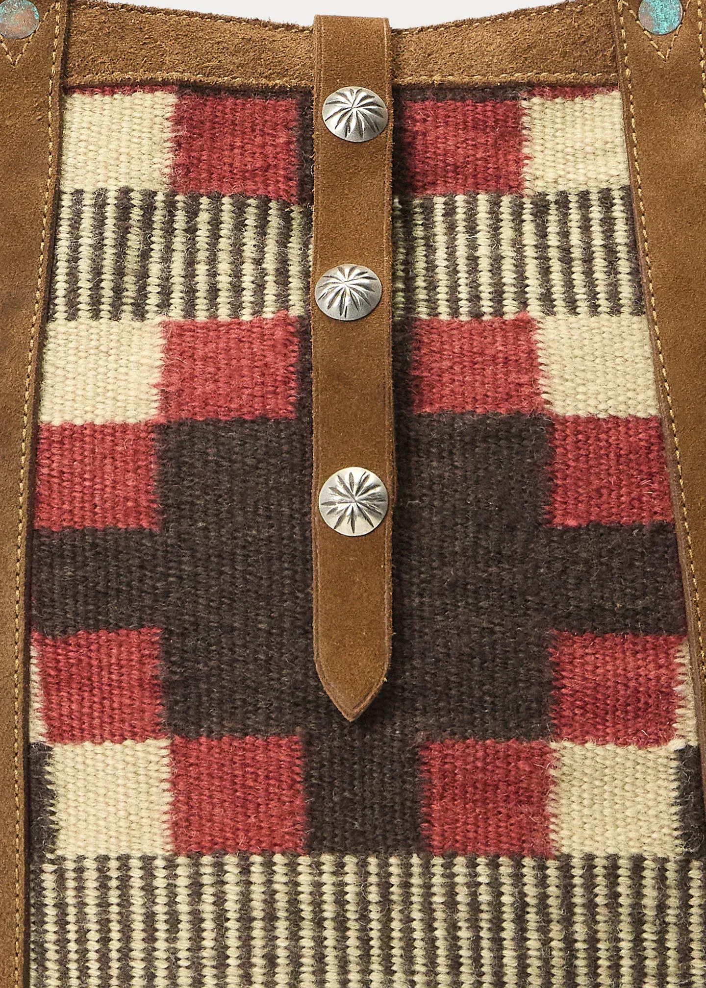 - Fold-over roughout suede strap at the top fastens with a concho snap closure.