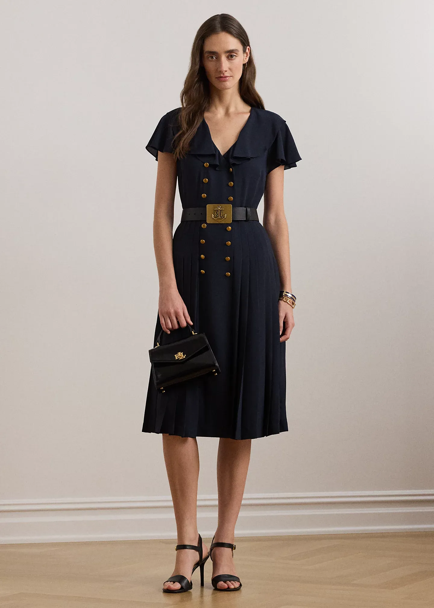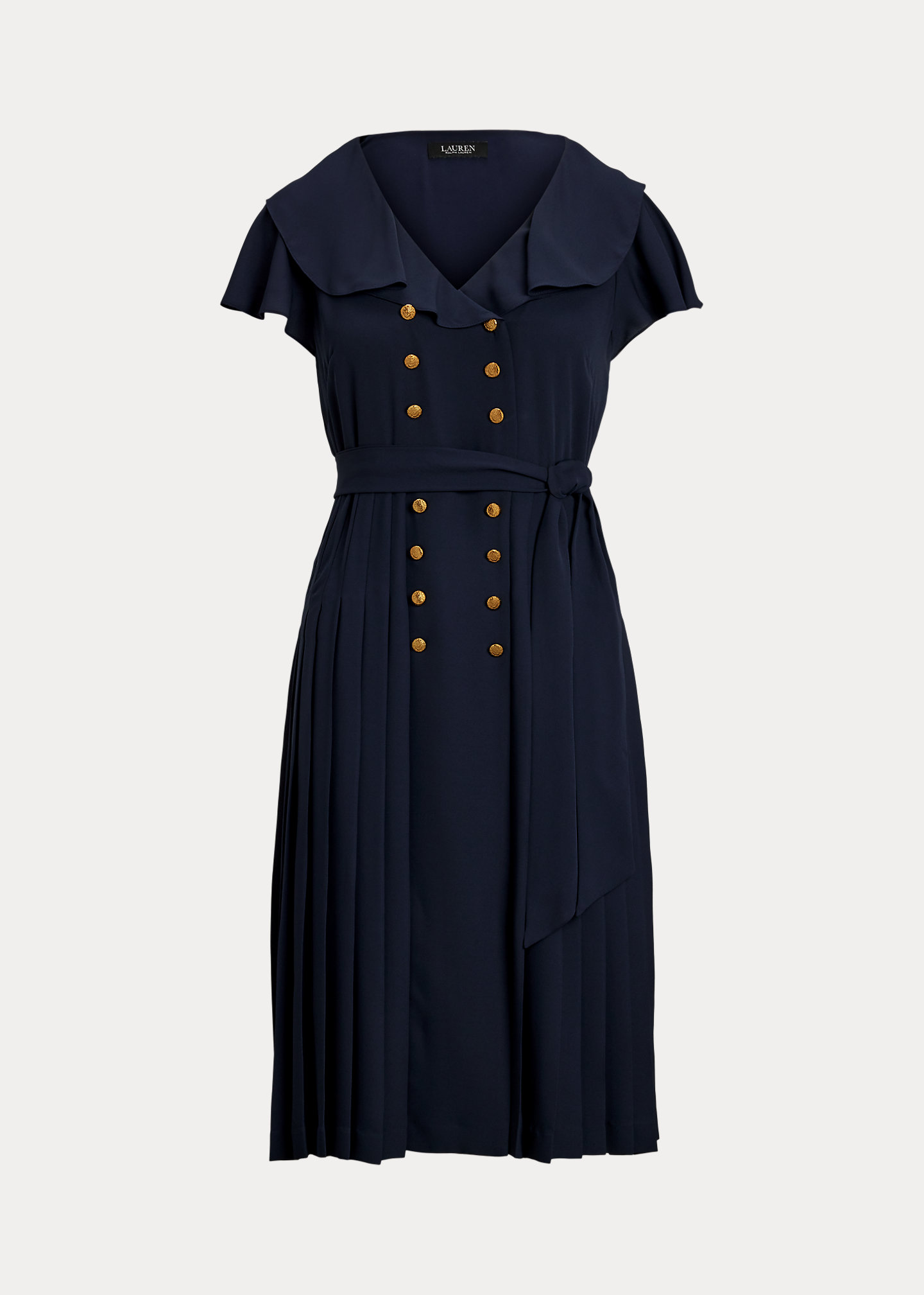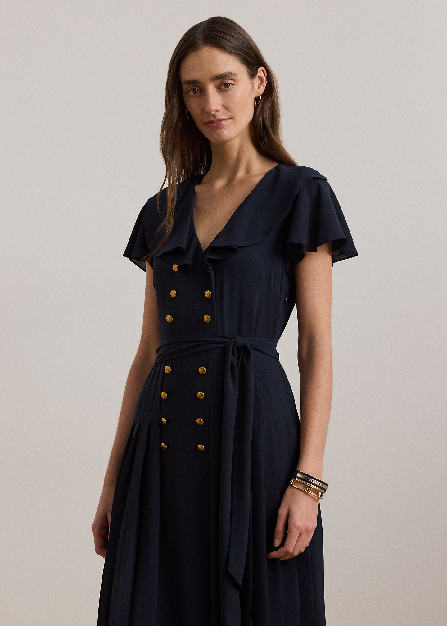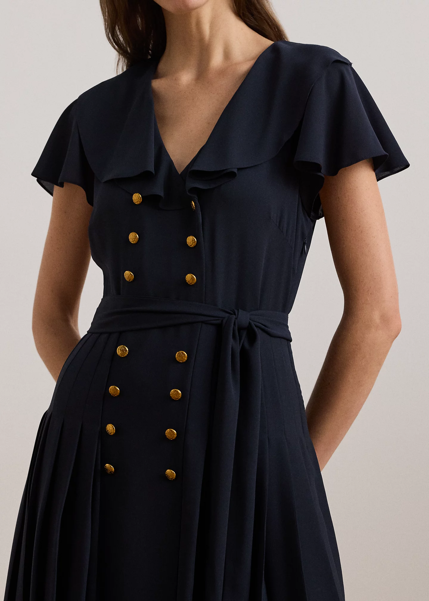 - Ruffle-trimmed surplice neckline. Double-breasted silhouette. Gold-tone anchor crest-embossed metal buttons. Concealed left-side-seam zipper.