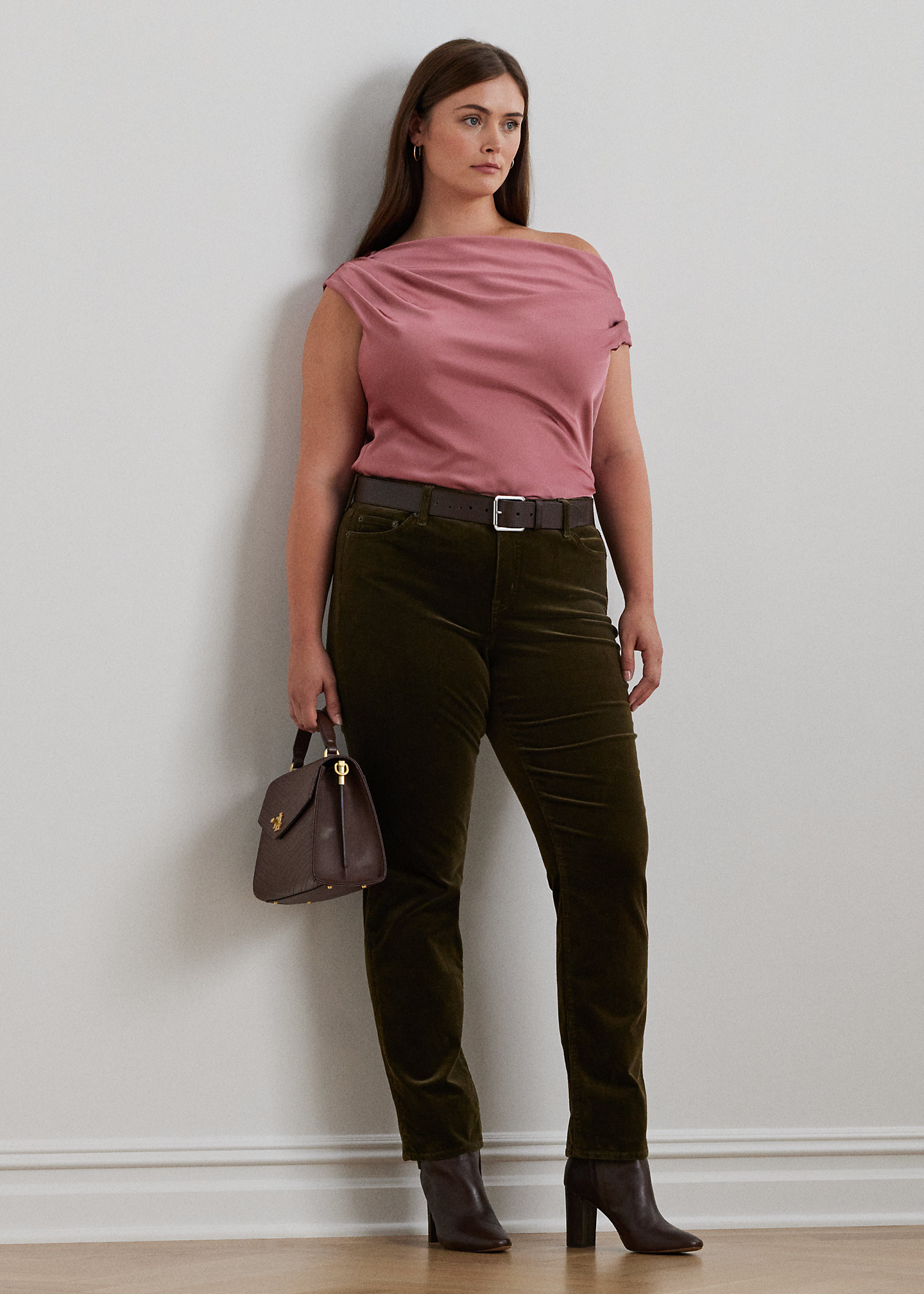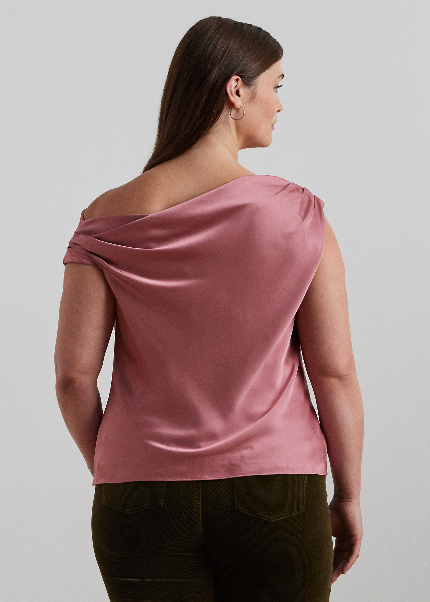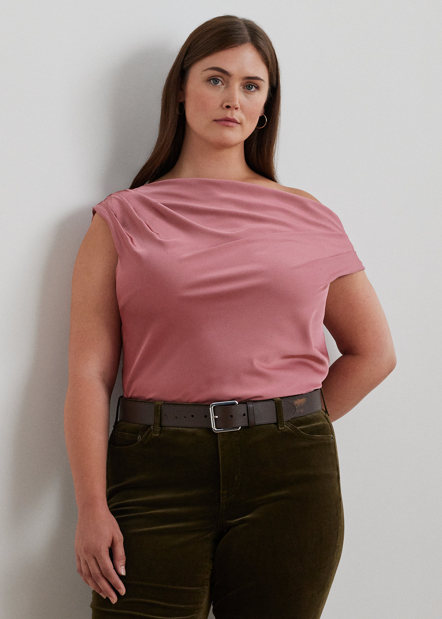 - Asymmetrical off-the-shoulder silhouette. Pull-on styling.