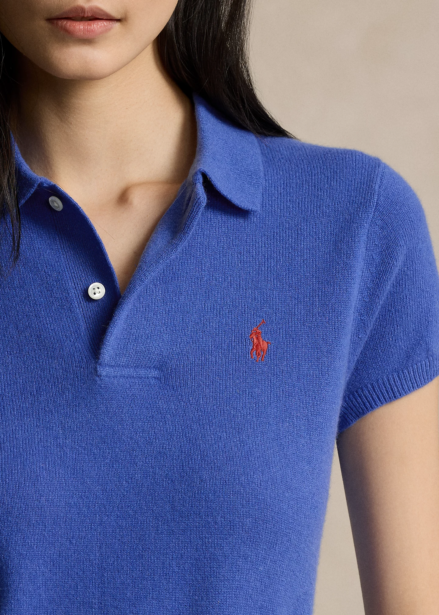 - Ribbed Polo collar. Two-button placket.