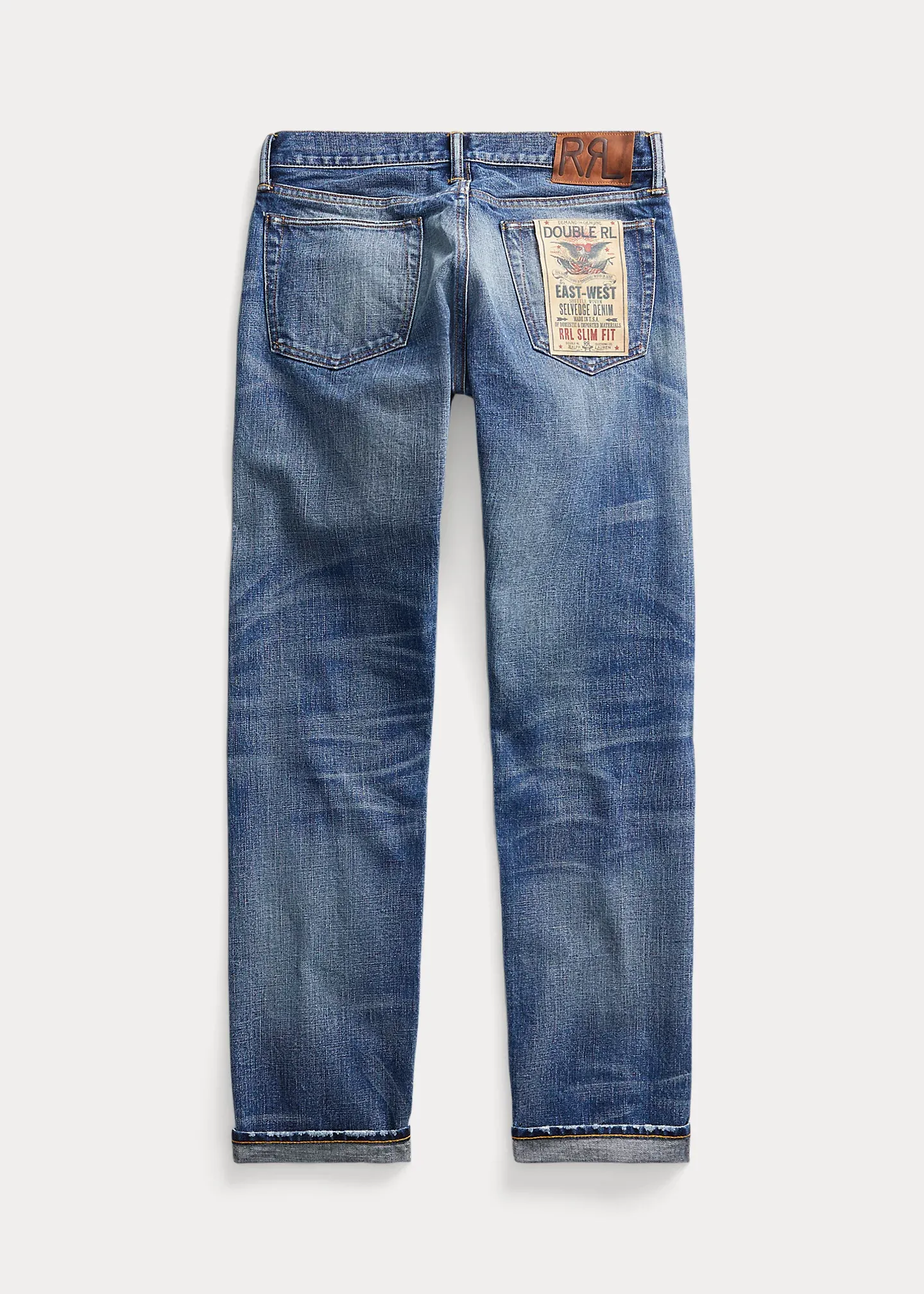 - American-made buttons, rivets, and washer burrs. Five-pocket styling. "RRL" embroidery at the selvedge coin pocket. Natural twill pocket lining.