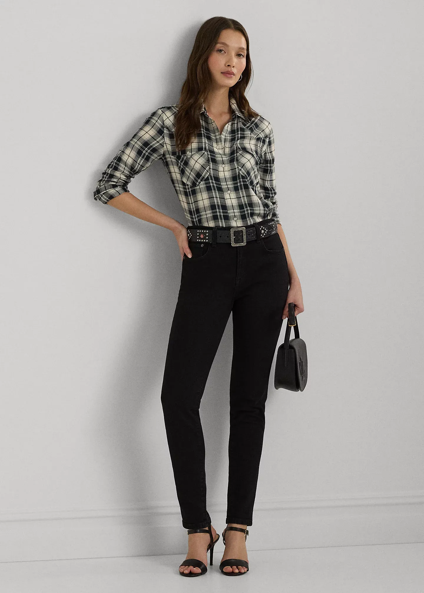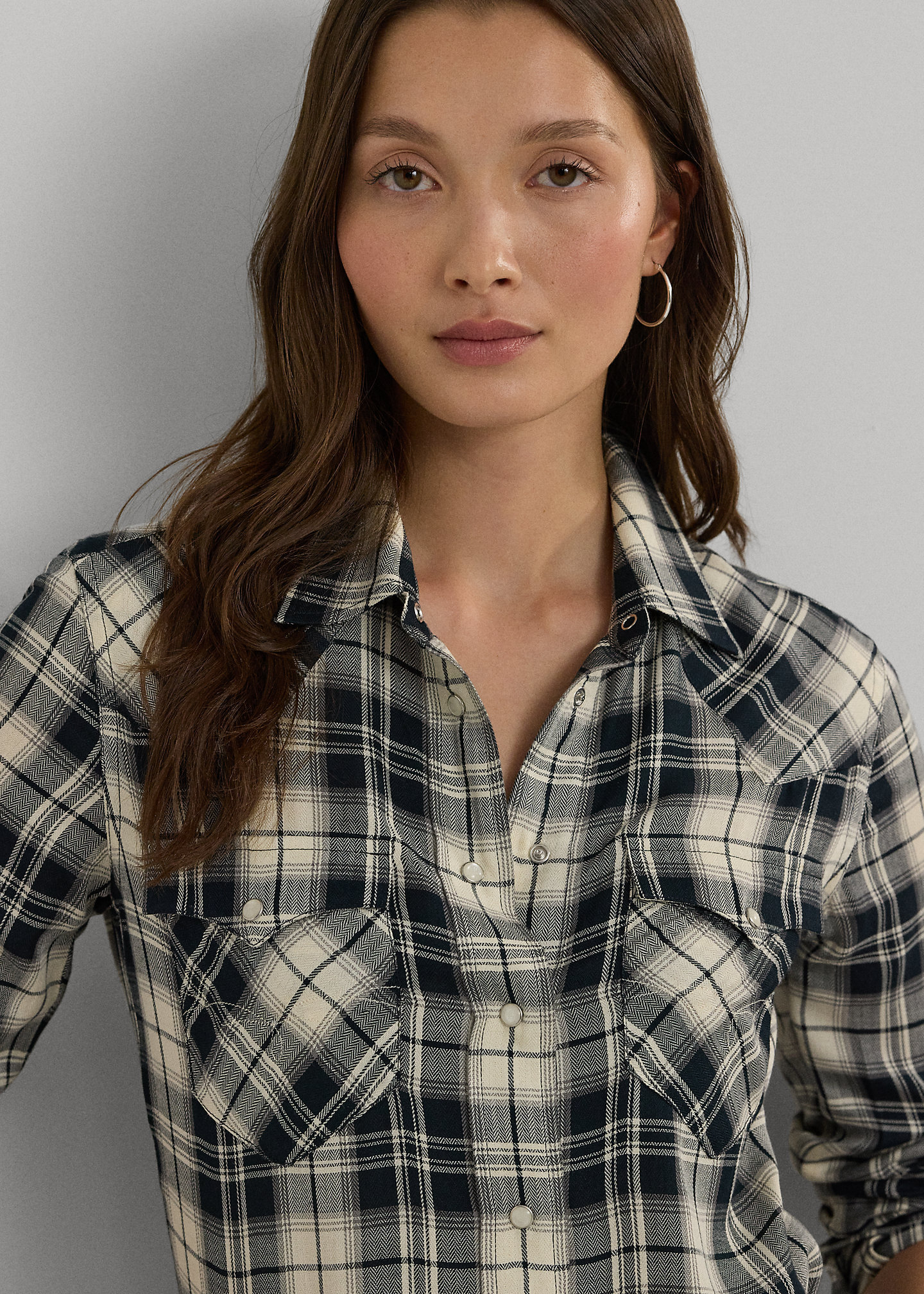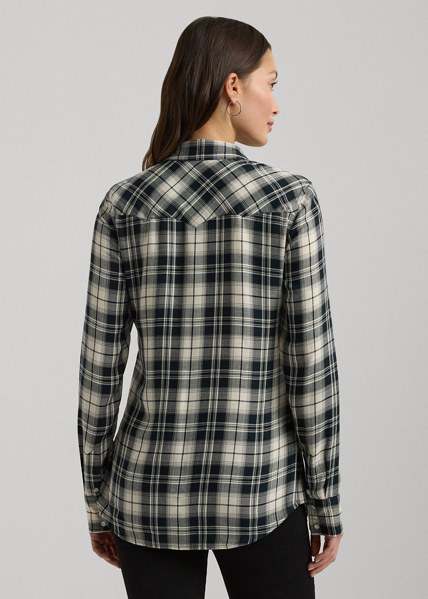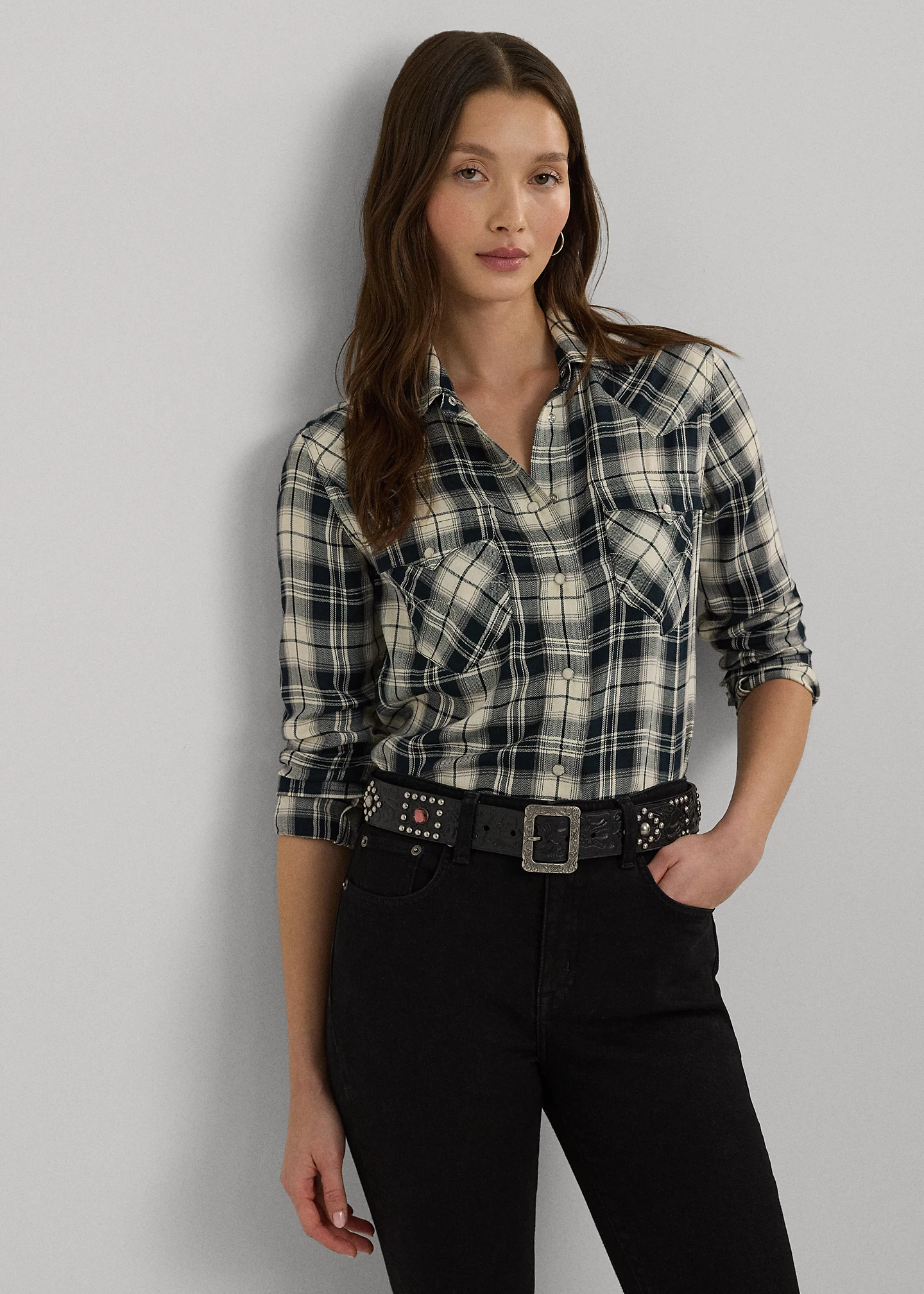 - Long sleeves with snapped cuffs. "LRL"-engraved imitation pearl snaps.
