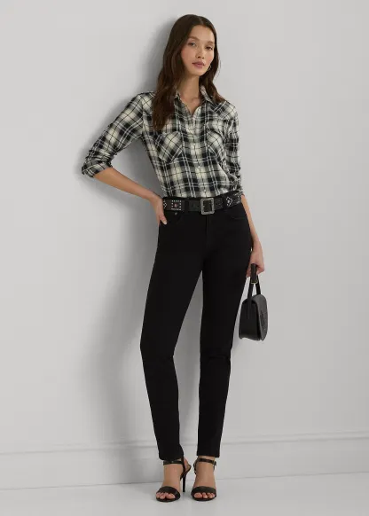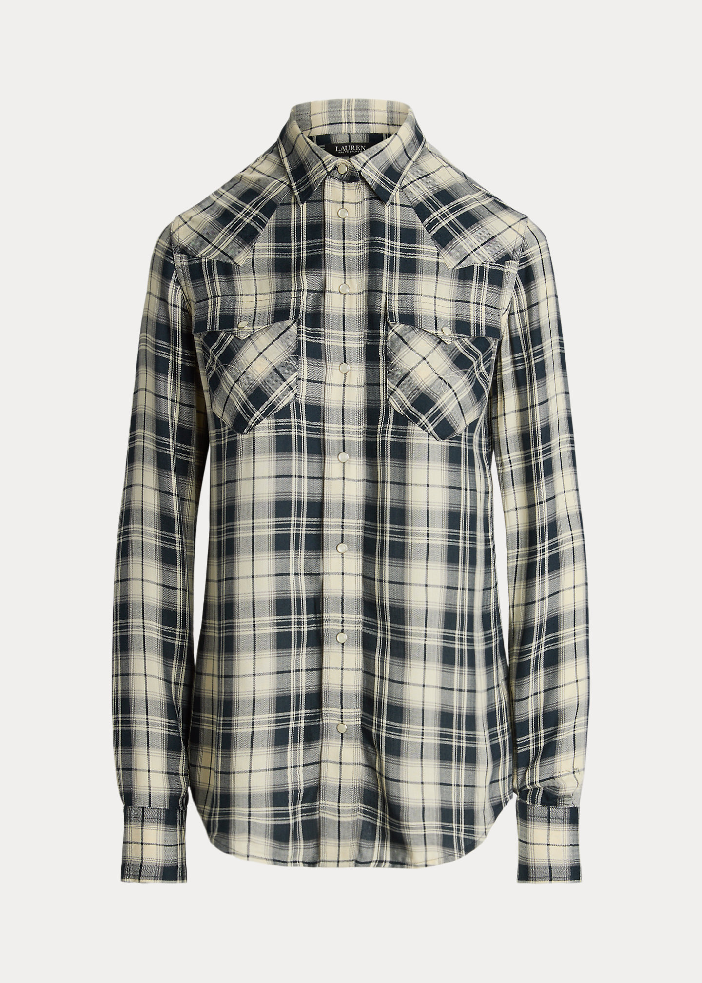 - Spread collar. Snapped placket. "LRL"-engraved imitation pearl snaps.