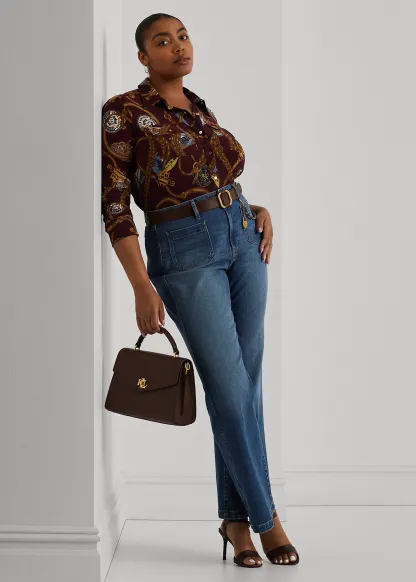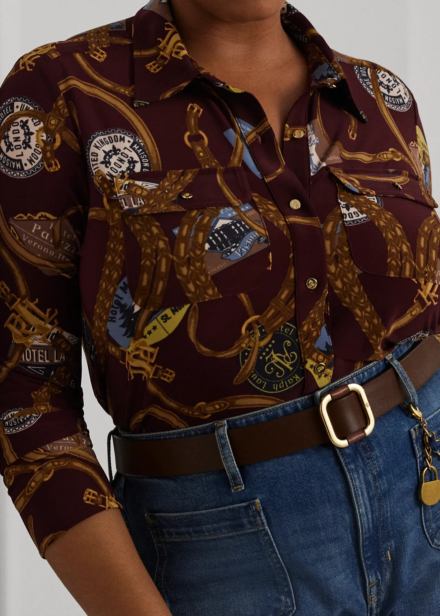 - Long sleeves with buttoned barrel cuffs. “Lauren Ralph Lauren”–engraved buttons at the sleeve placket. Two chest buttoned-flap patch pockets. “LRL”-engraved metal buttons at the cuffs and pockets.