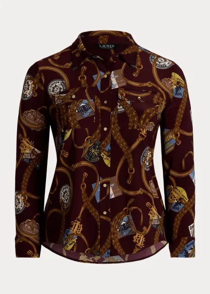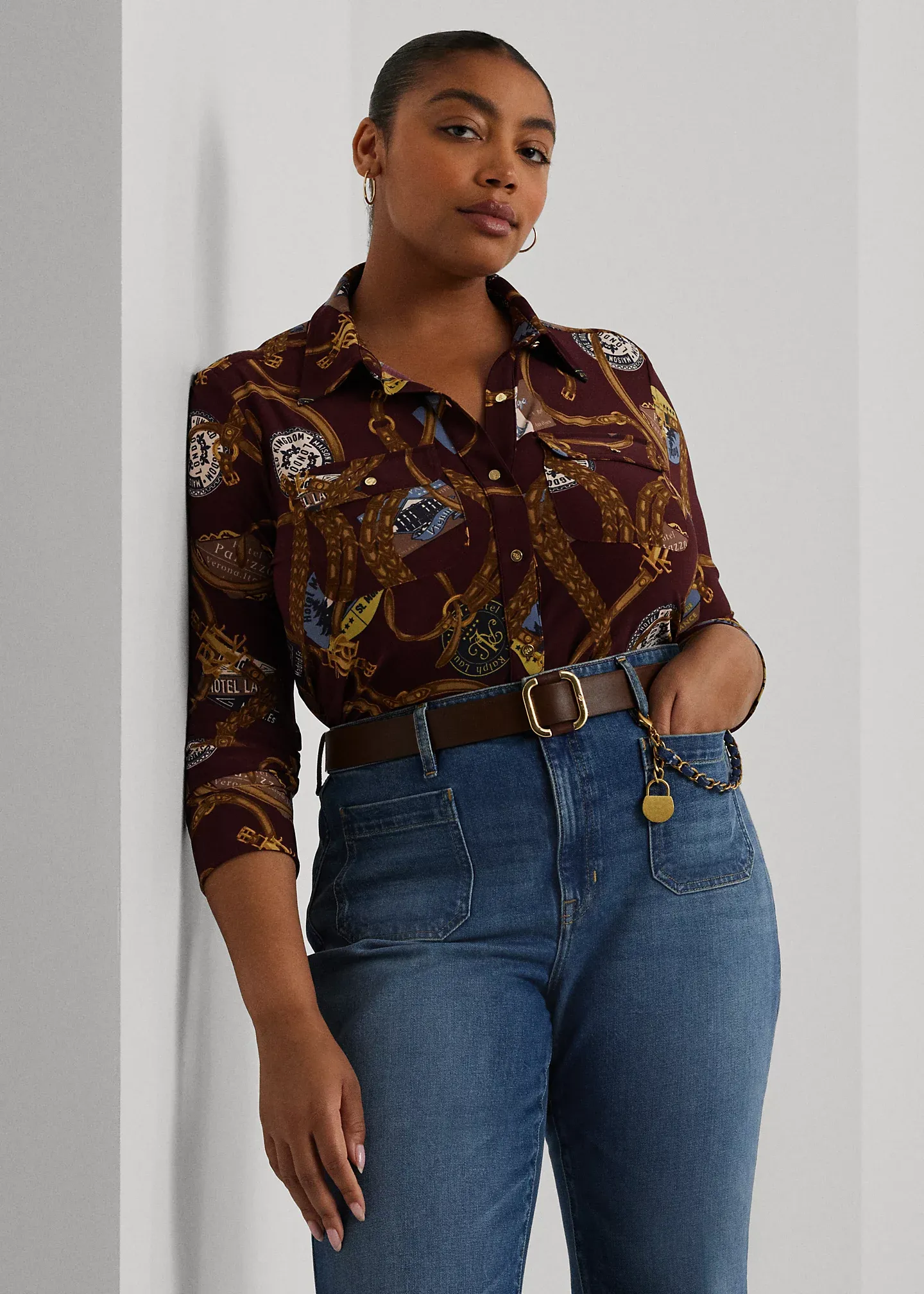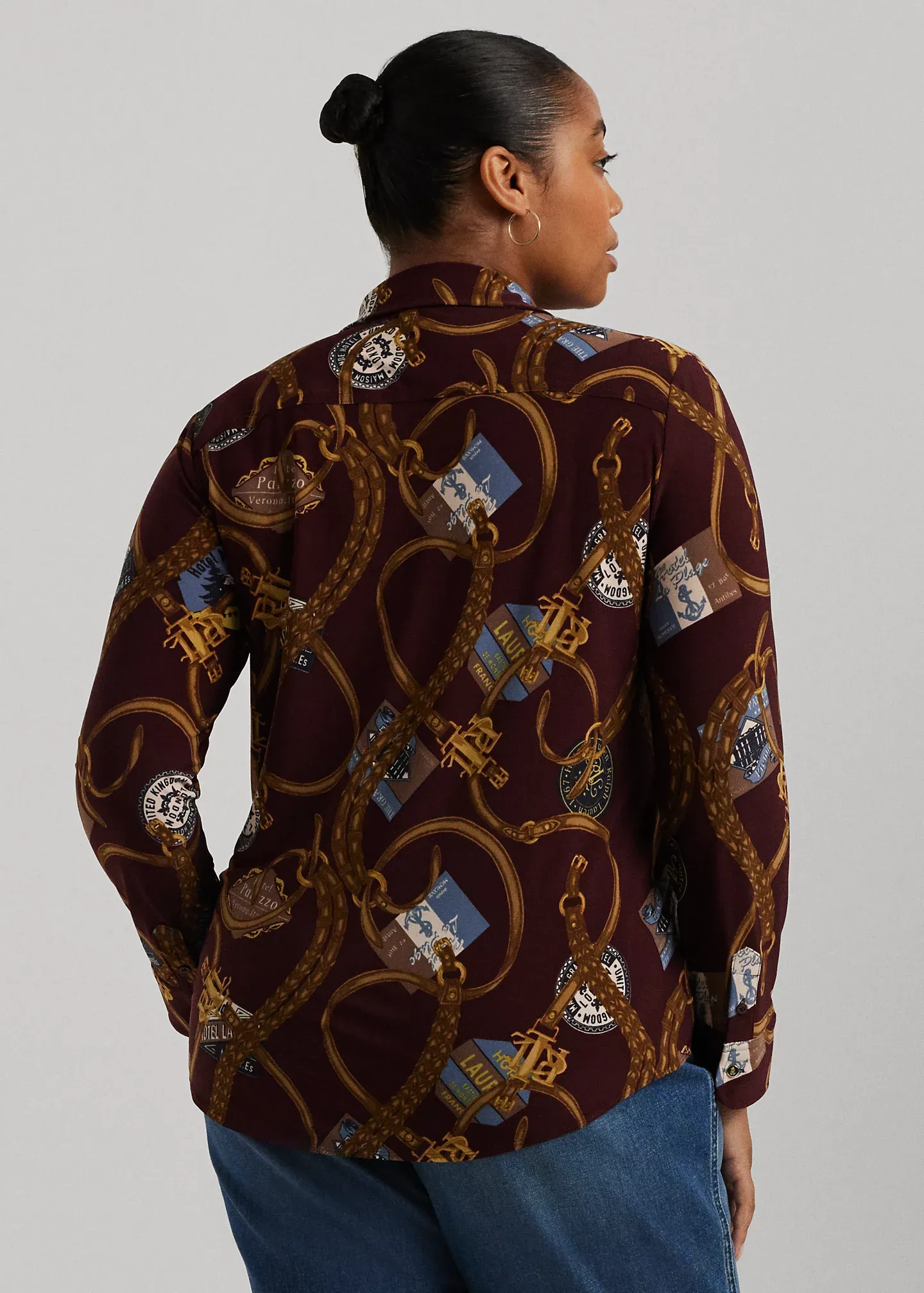 - Spread collar. Buttoned placket. “LRL”-engraved metal buttons.