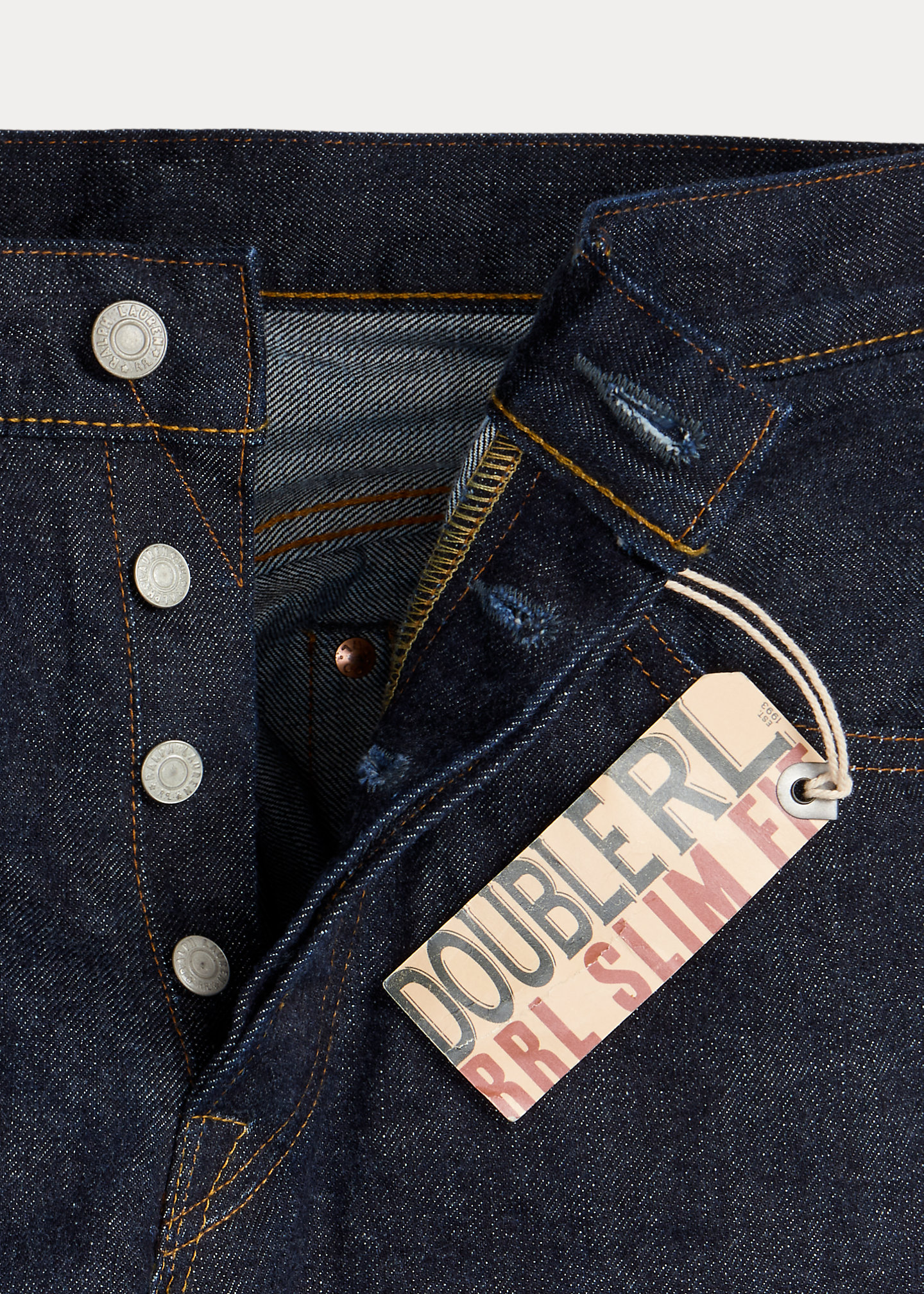 - Five-pocket styling with authentic washers and rivets. Selvedge coin pocket. "RRL" embroidery at the coin pocket. Heavy twill pocket lining.