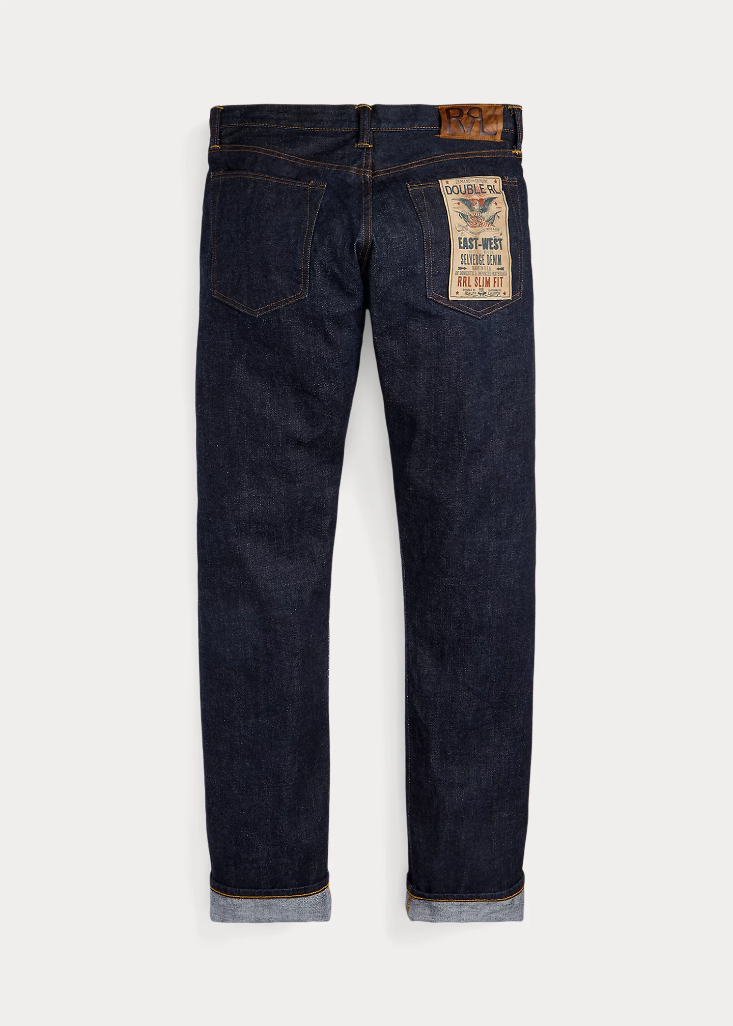 - Leather "RRL"-debossed logo label at the back right waist.