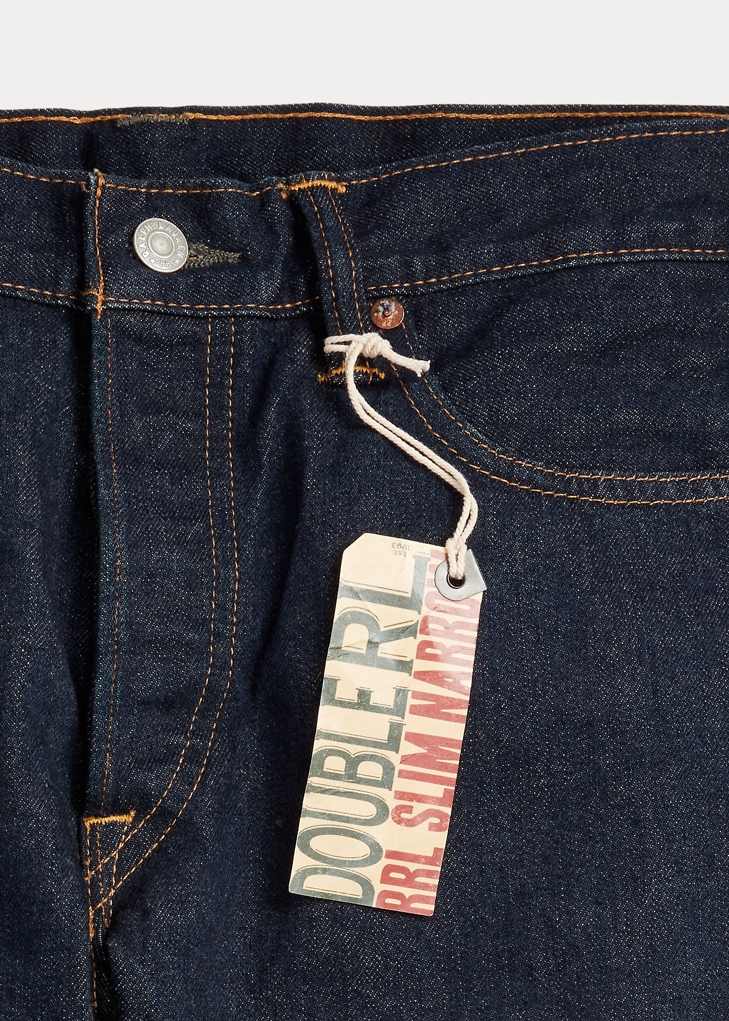 - American-made buttons, copper-tone rivets, and washer burrs. Five-pocket styling. “RRL” embroidery at the selvedge coin pocket. Heavy twill pocket lining.