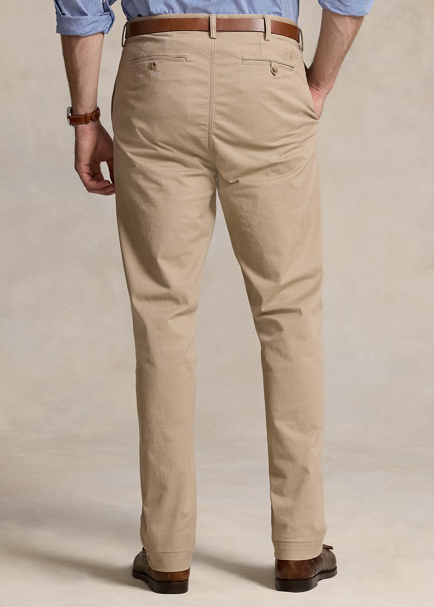 - Stretch Classic Fit: sits at the waist. Eased through the leg.