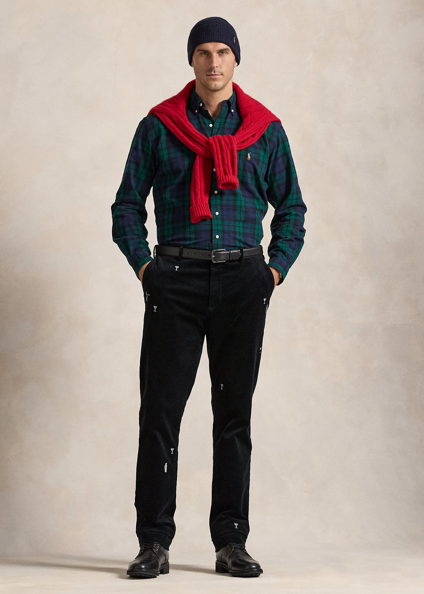 - Stretch Classic Fit: sits at the waist. Eased through the leg.
