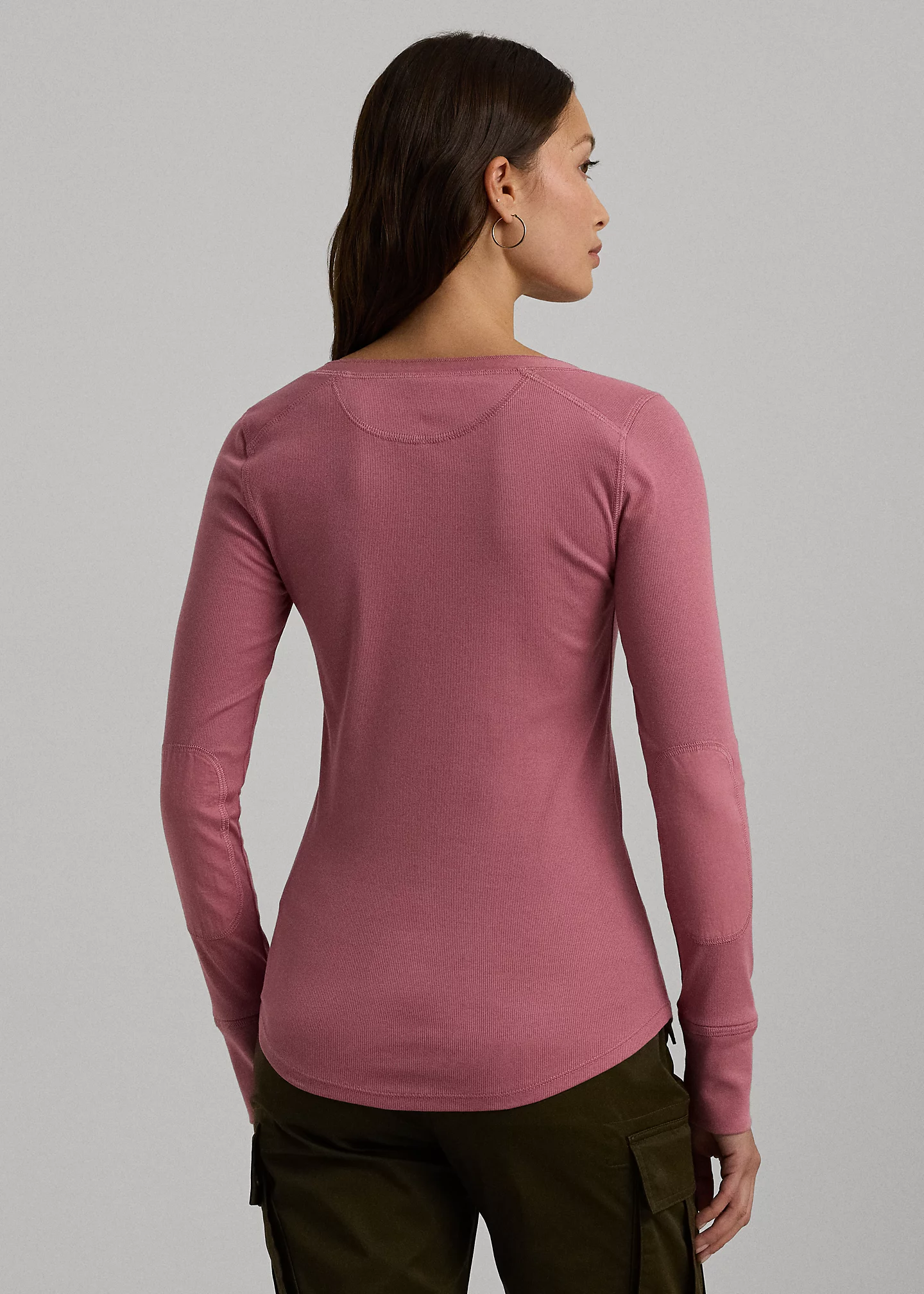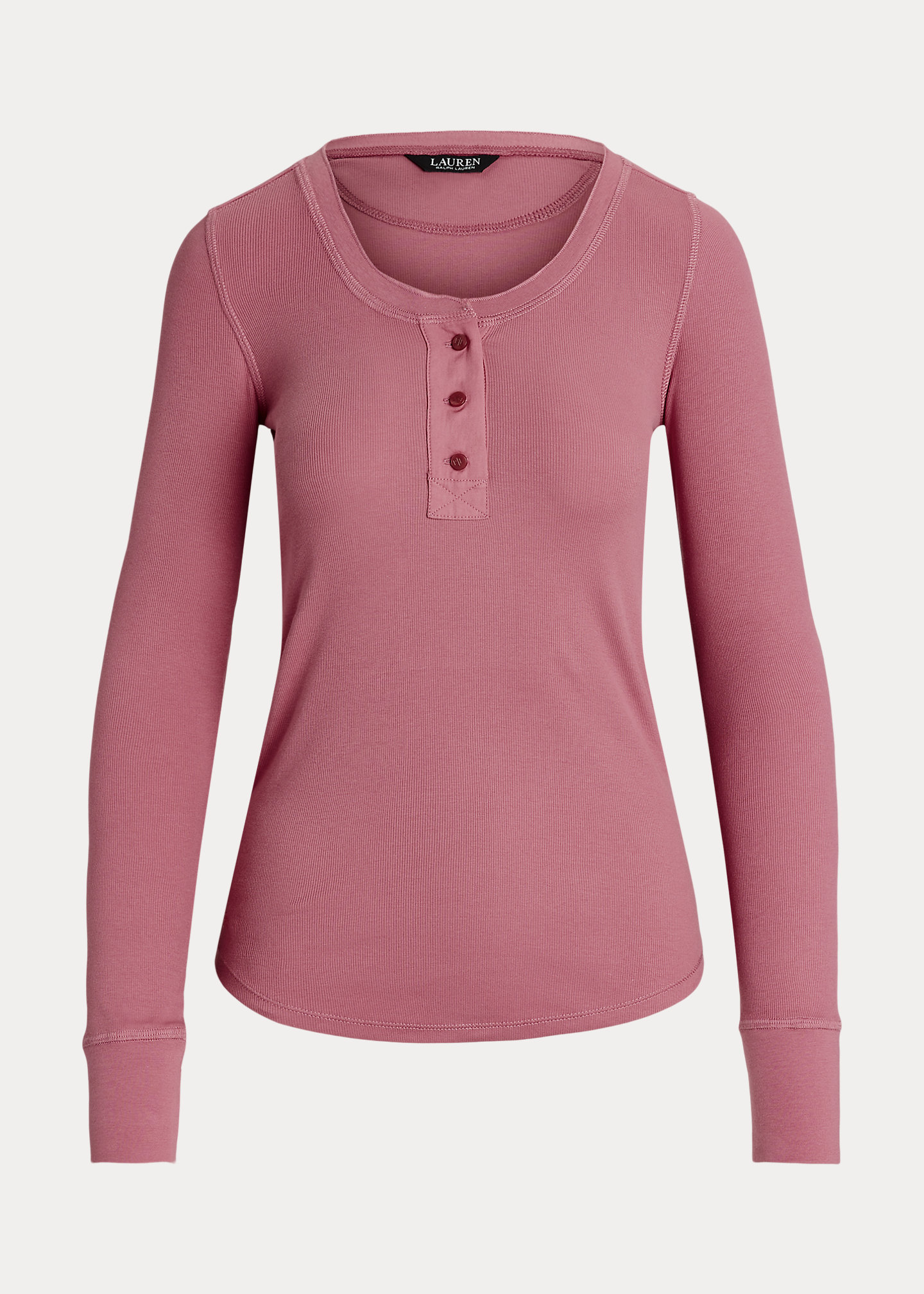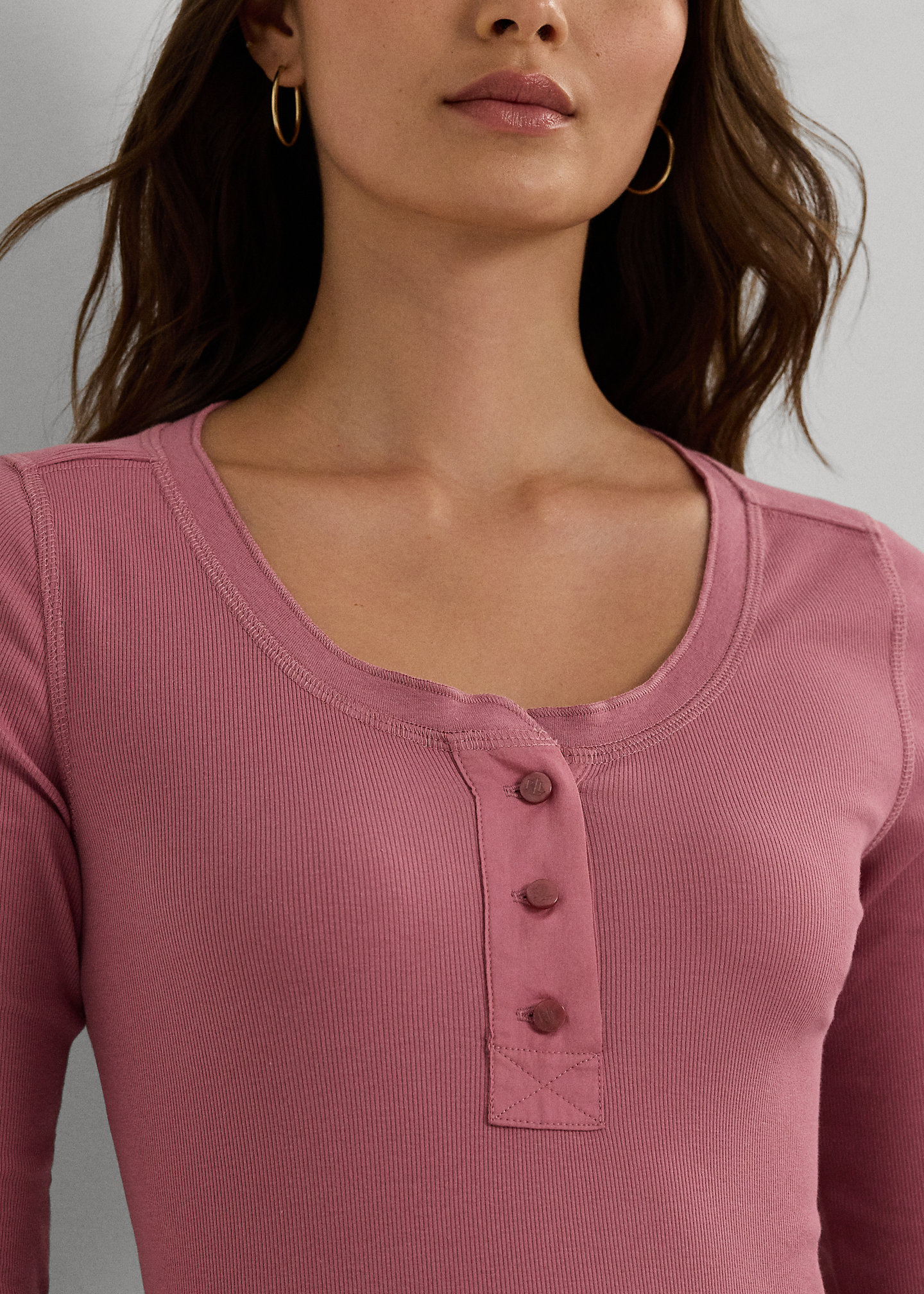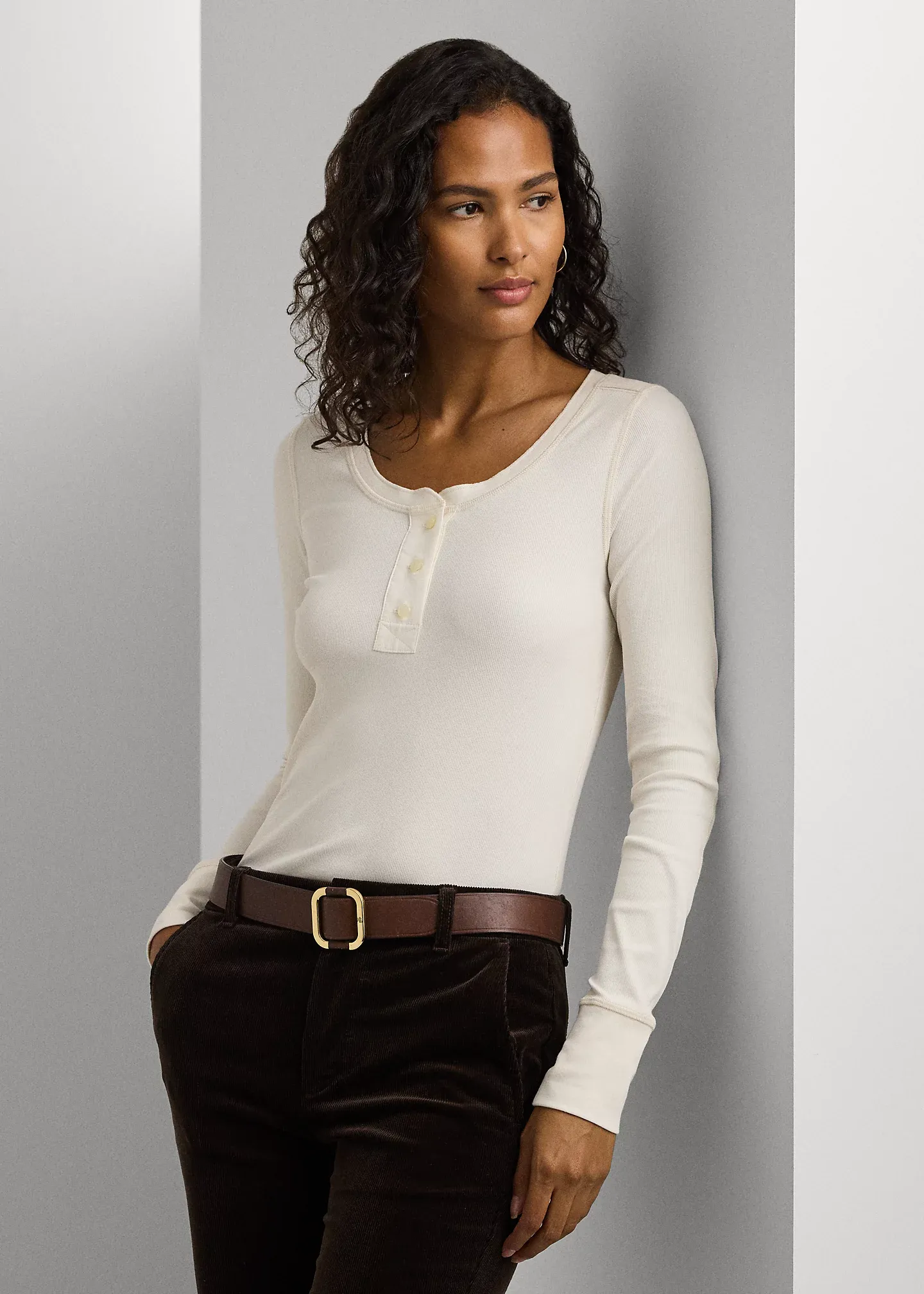 - Scoopneck. Three-button placket. “LRL”-engraved pearlized buttons.