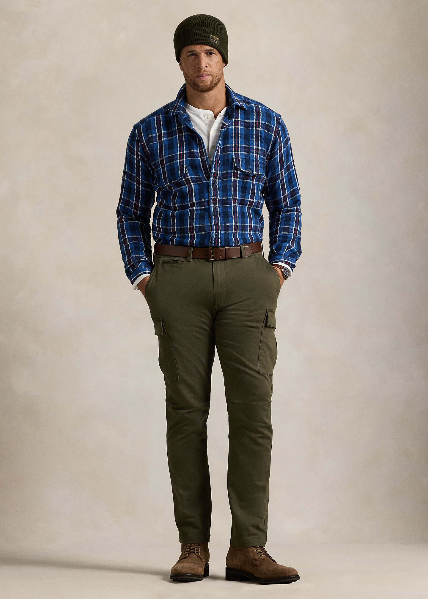 - Two front angled pockets. Right hip coin pocket. Snapped cargo pocket at each thigh. Two back snapped pockets.