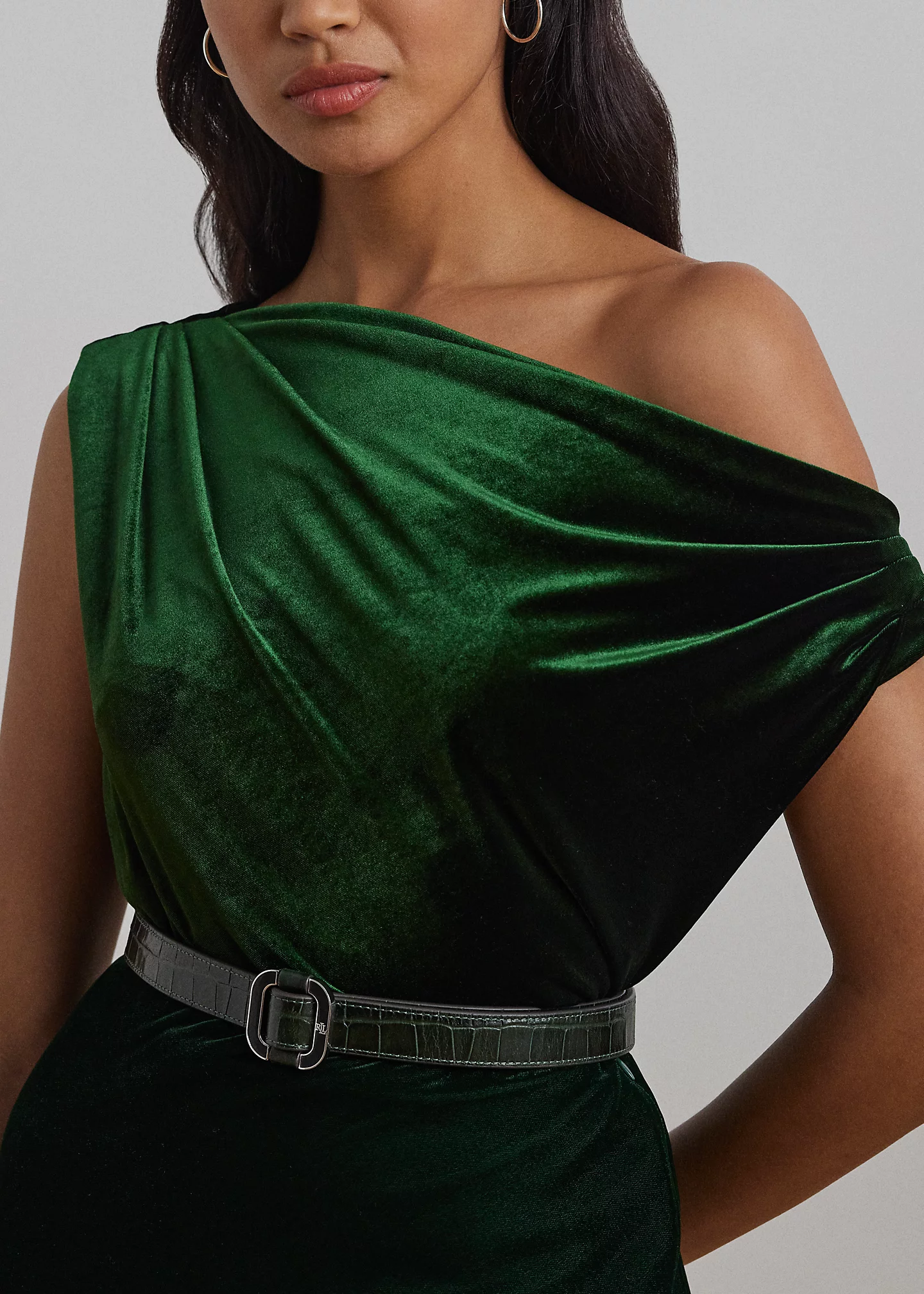 - Asymmetrical off-the-shoulder silhouette. Pull-on styling.