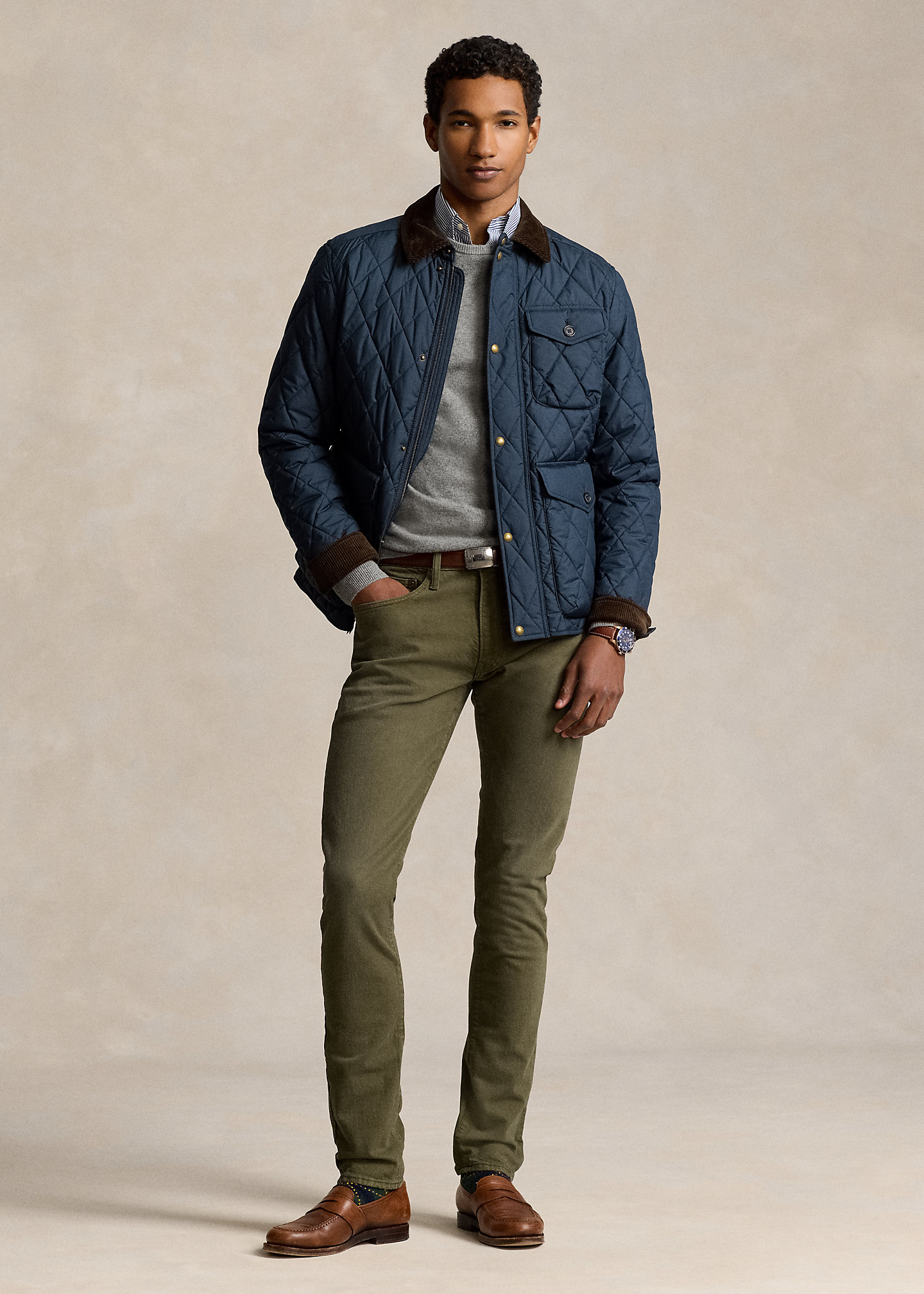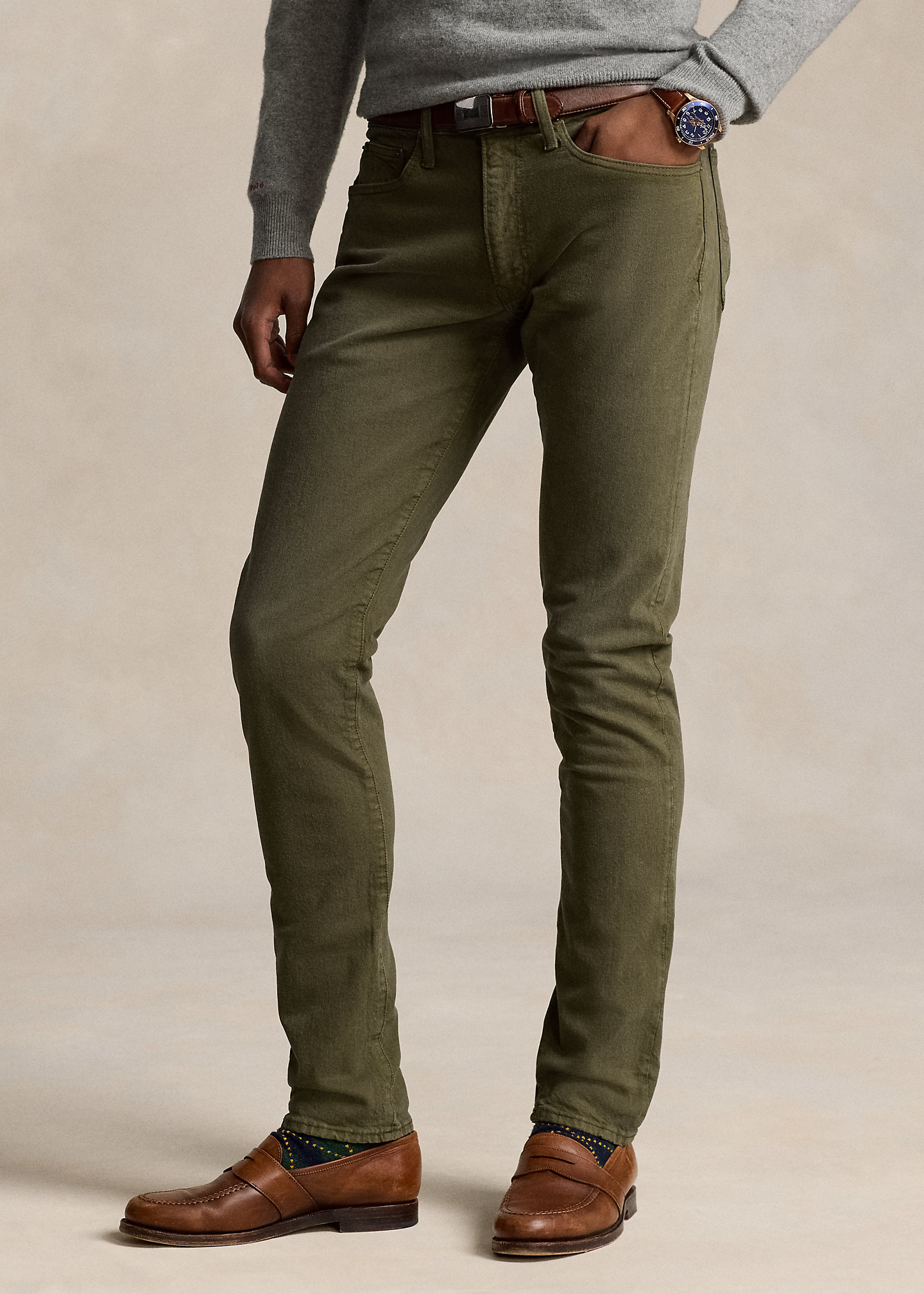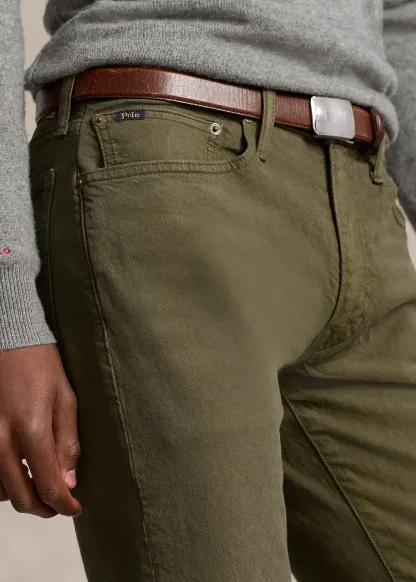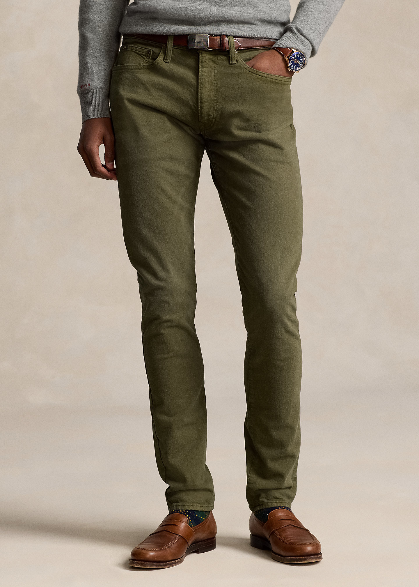 - Five-pocket styling with signature metal rivets. “Polo” label at the coin pocket.