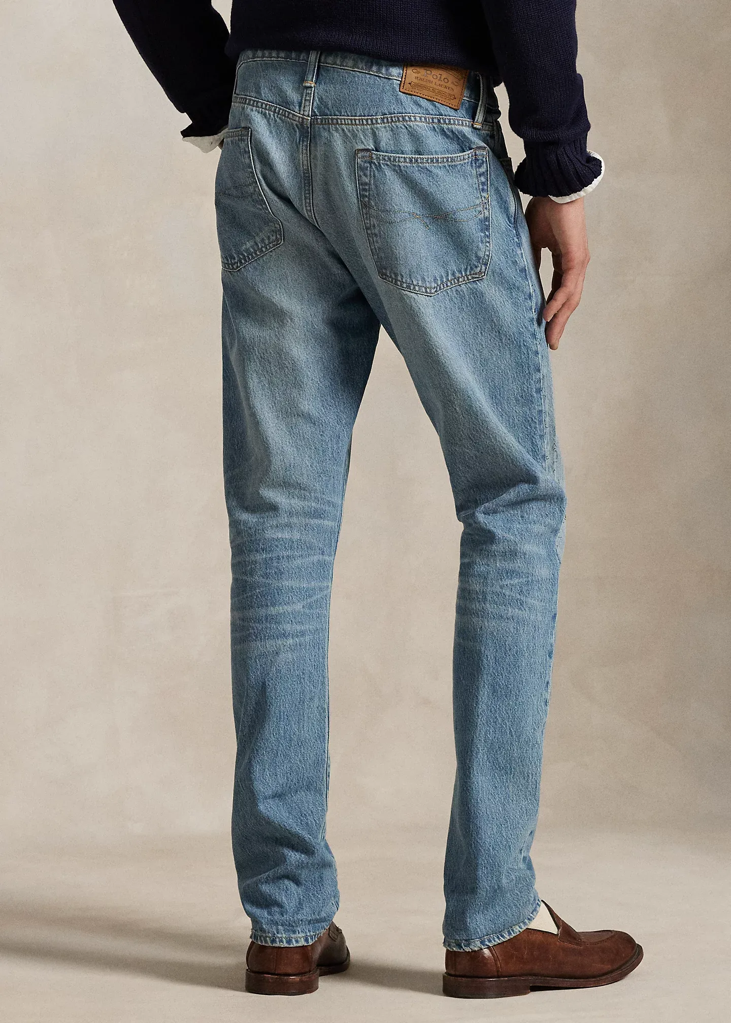 - Five-pocket styling with signature metal rivets. "Polo" label at the coin pocket.