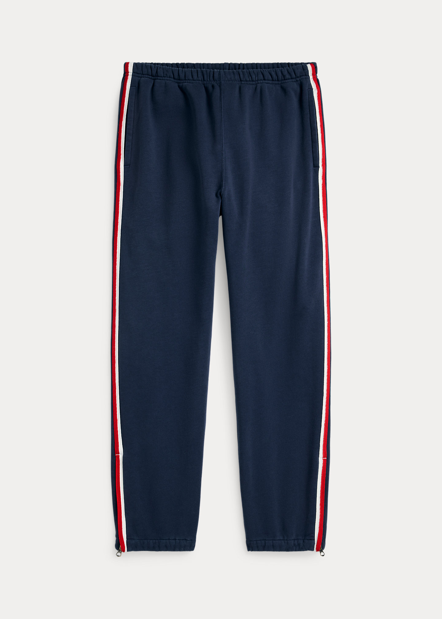 - Braided stripes along the outer side of each leg. Elasticized cuffs with zipped vents.