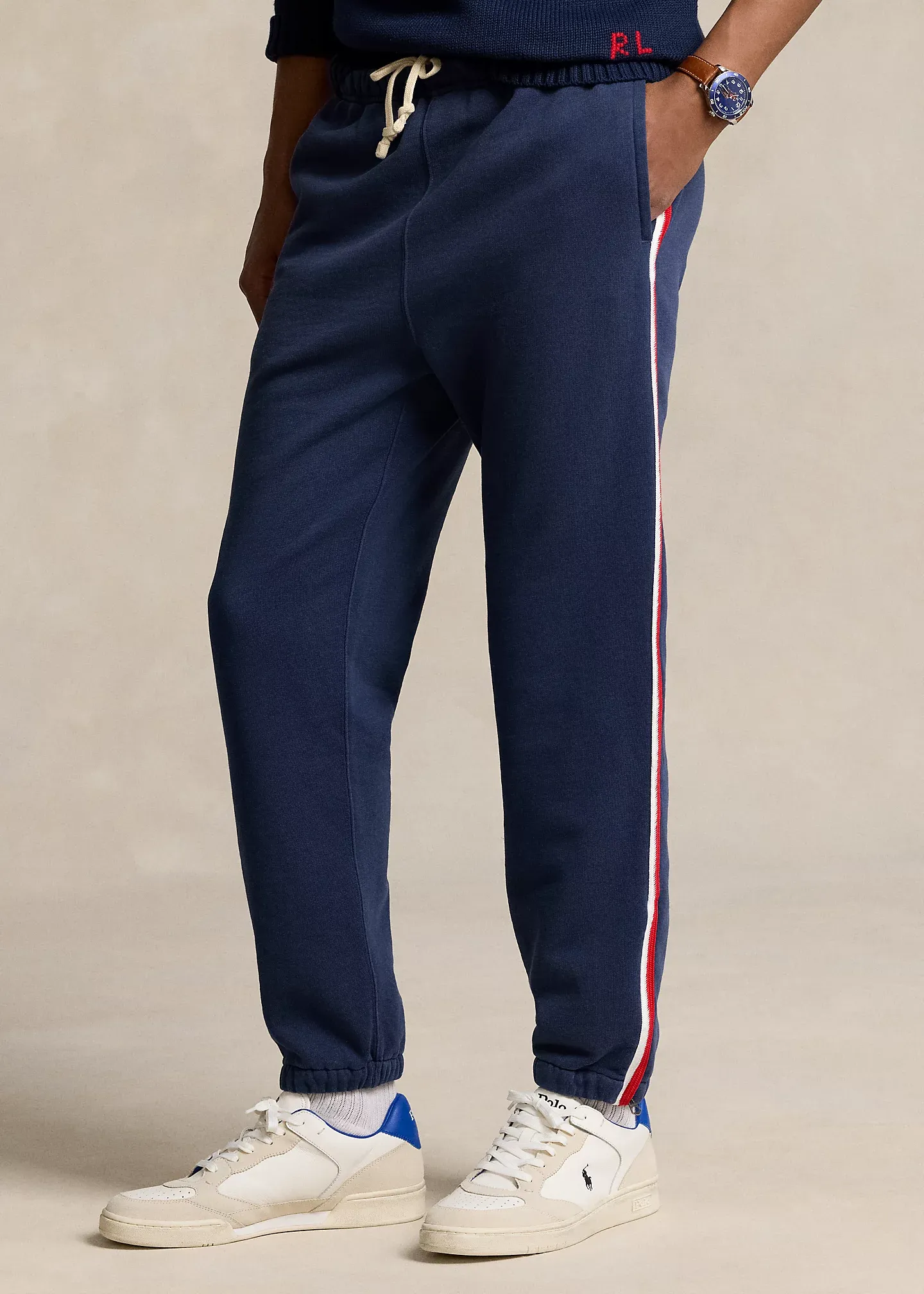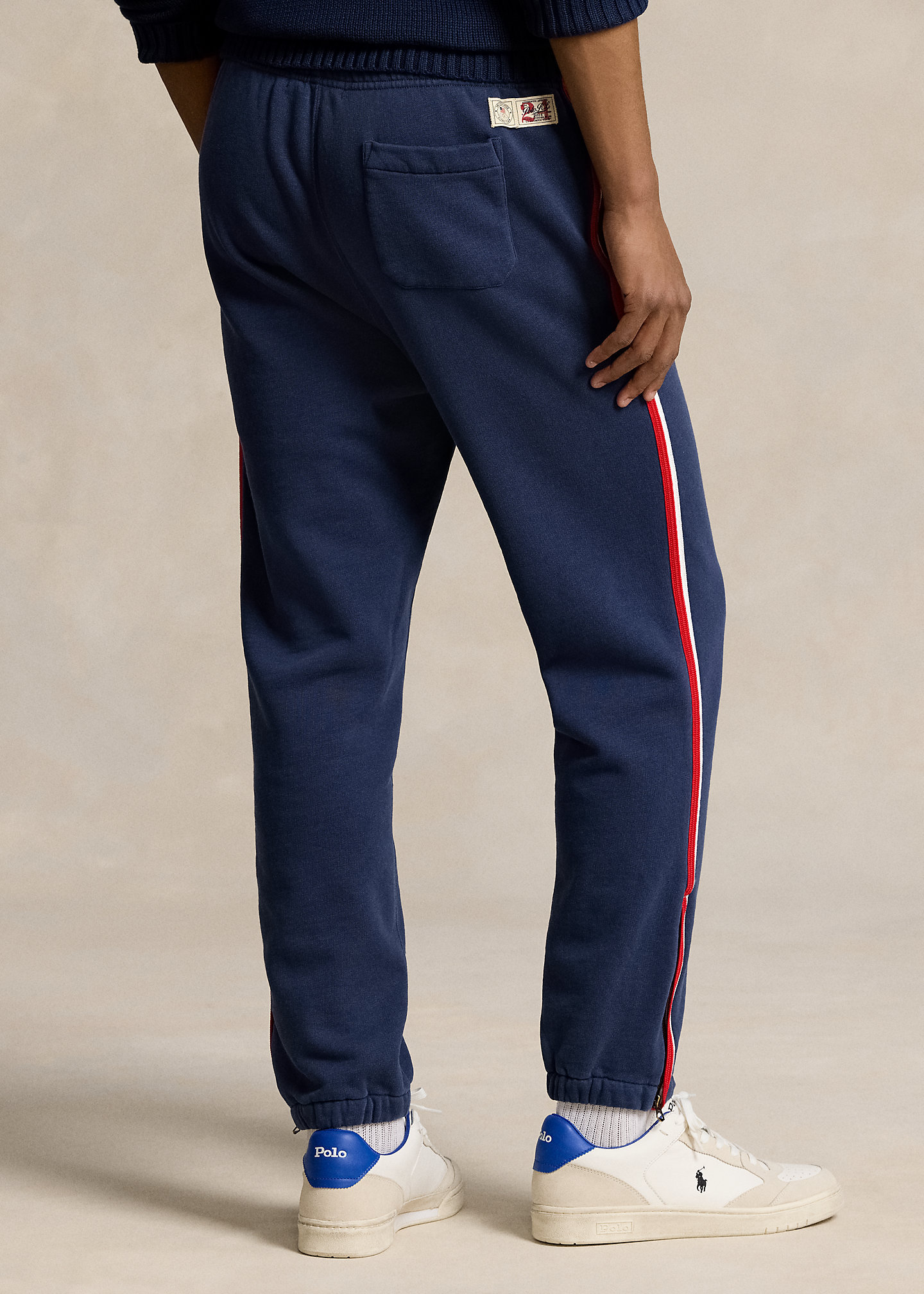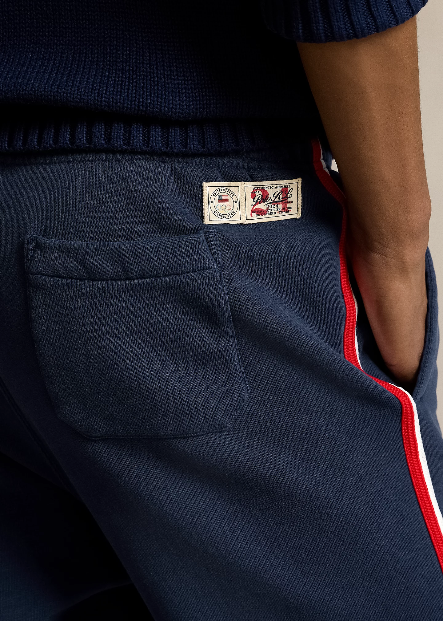 - Elastic waistband with an interior drawstring. Side on-seam pockets. Back right patch pocket. Labels with the official logo of the U.S. Olympic Team and "Polo RL 2024 Official Outfitter" above the back pocket.